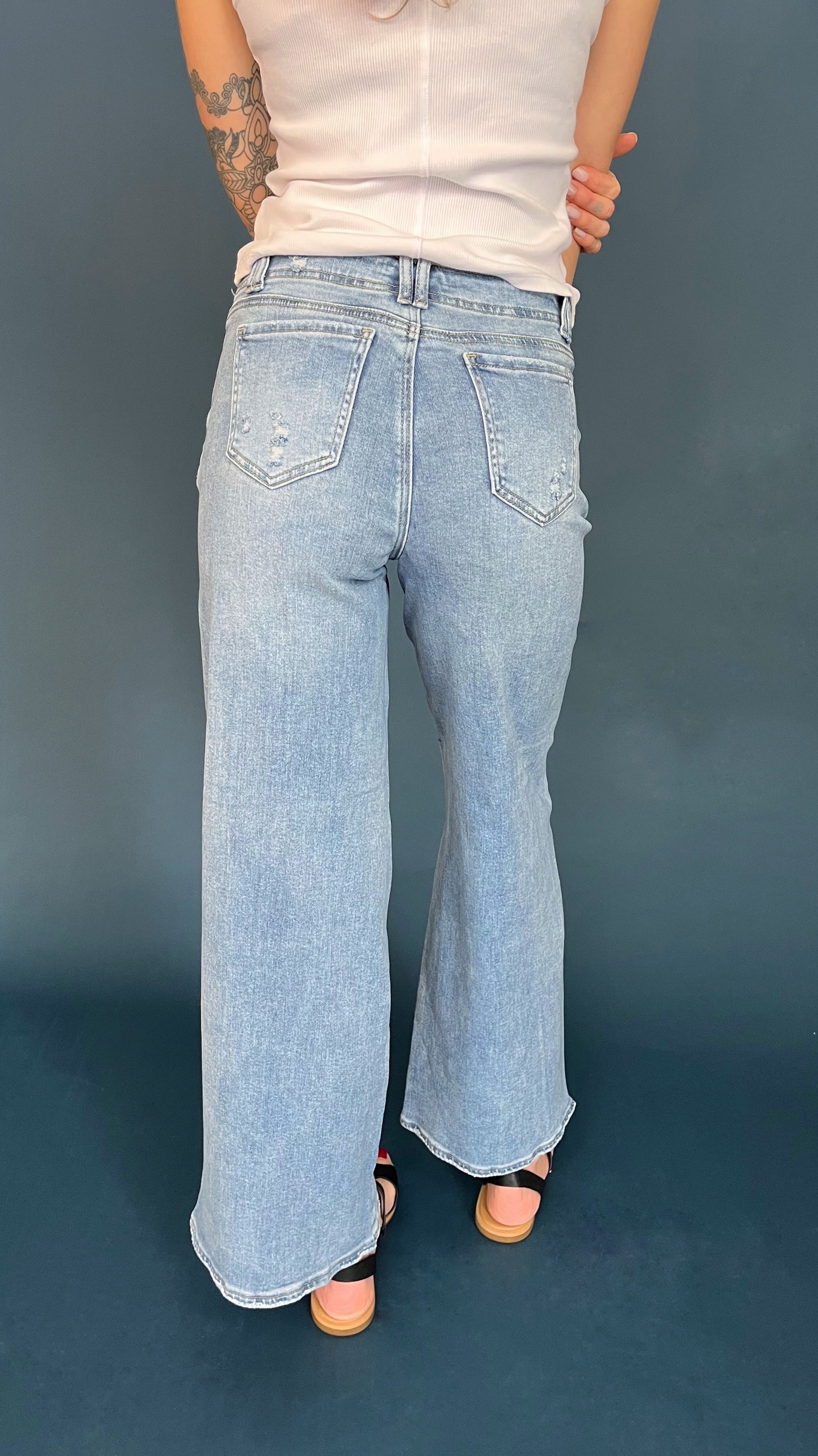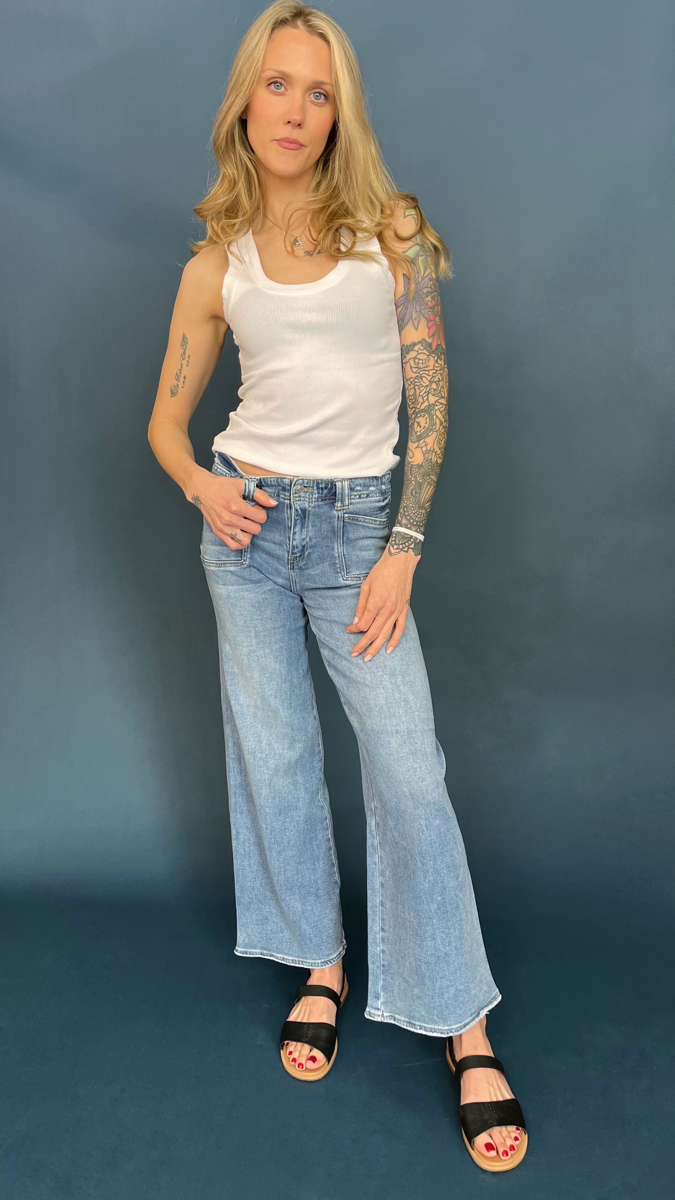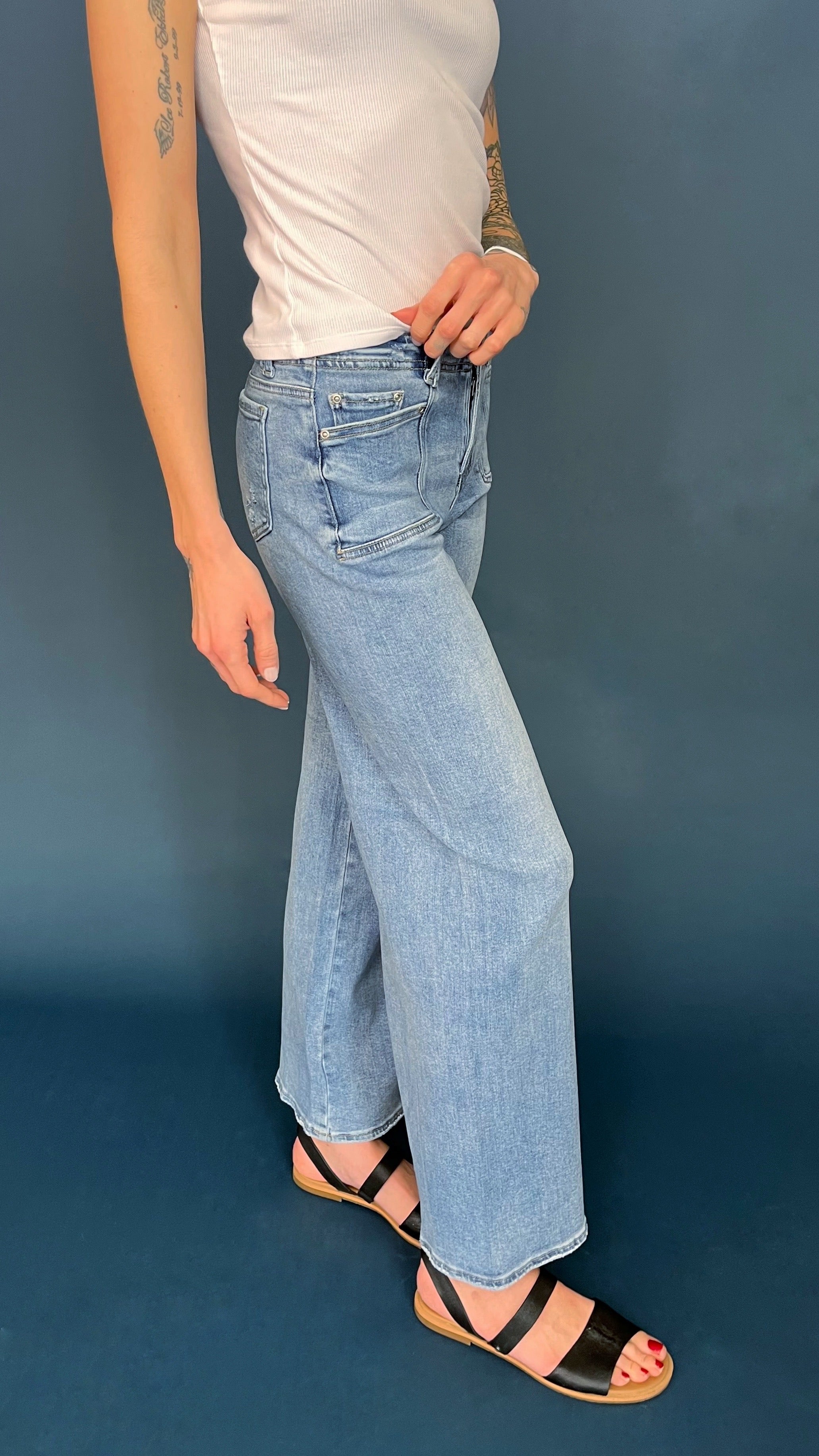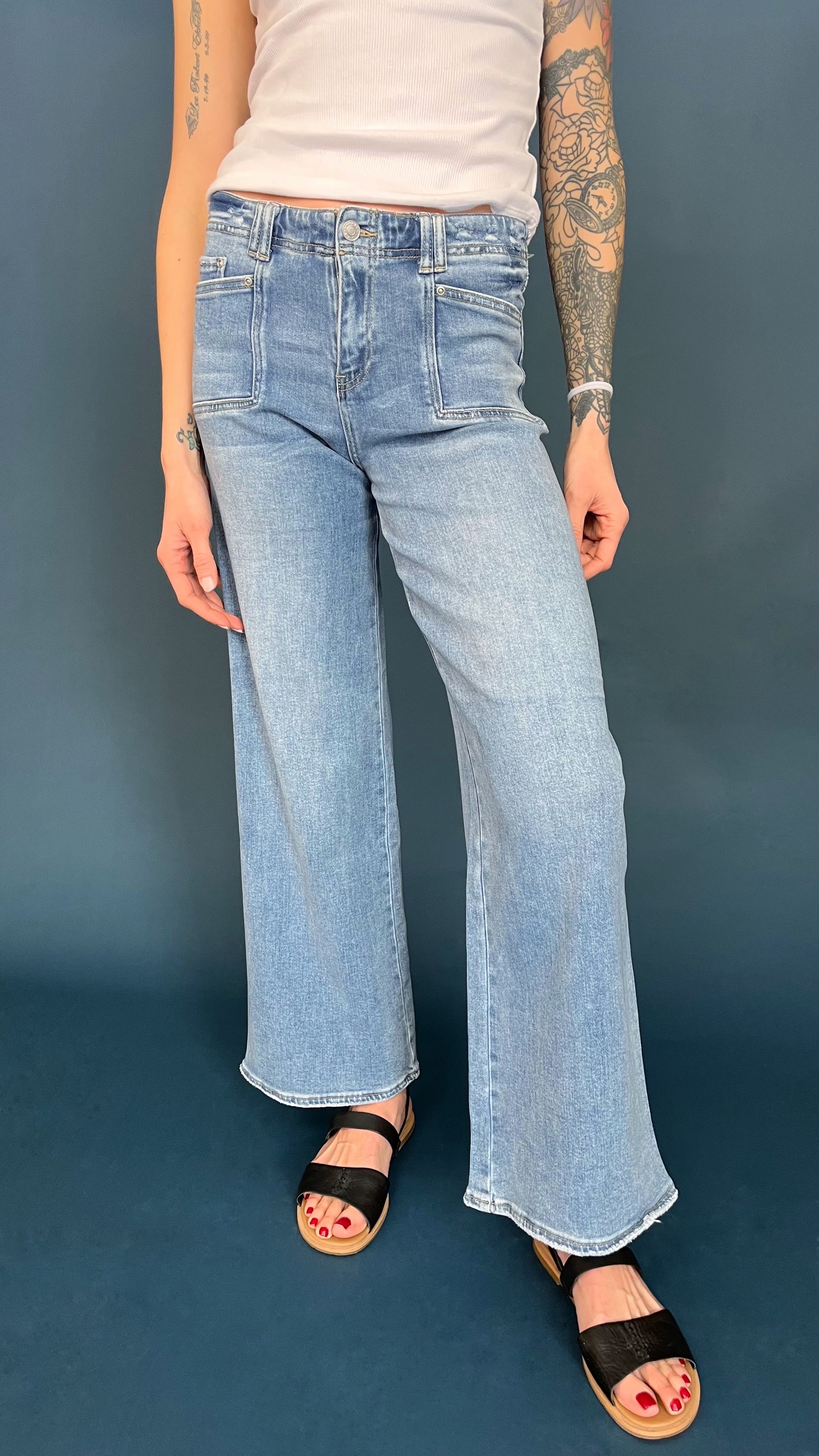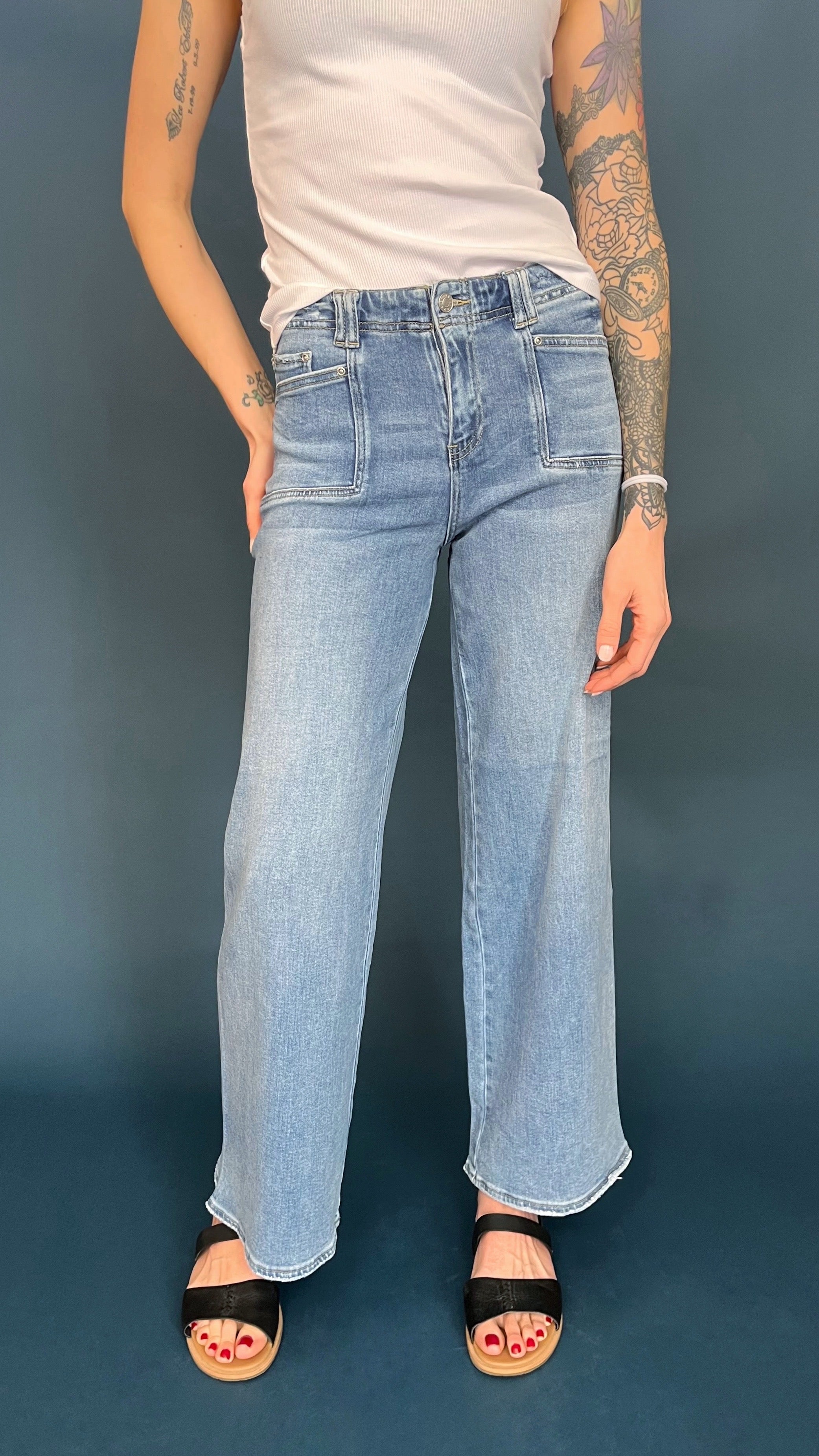 This utility pocket wide leg jean is the perfect blend of comfort and function. Flush front utility pockets add style without bulk and the wide leg silhouette is an easy fit. The denim material is so soft it feels like you are wearing pajamas.