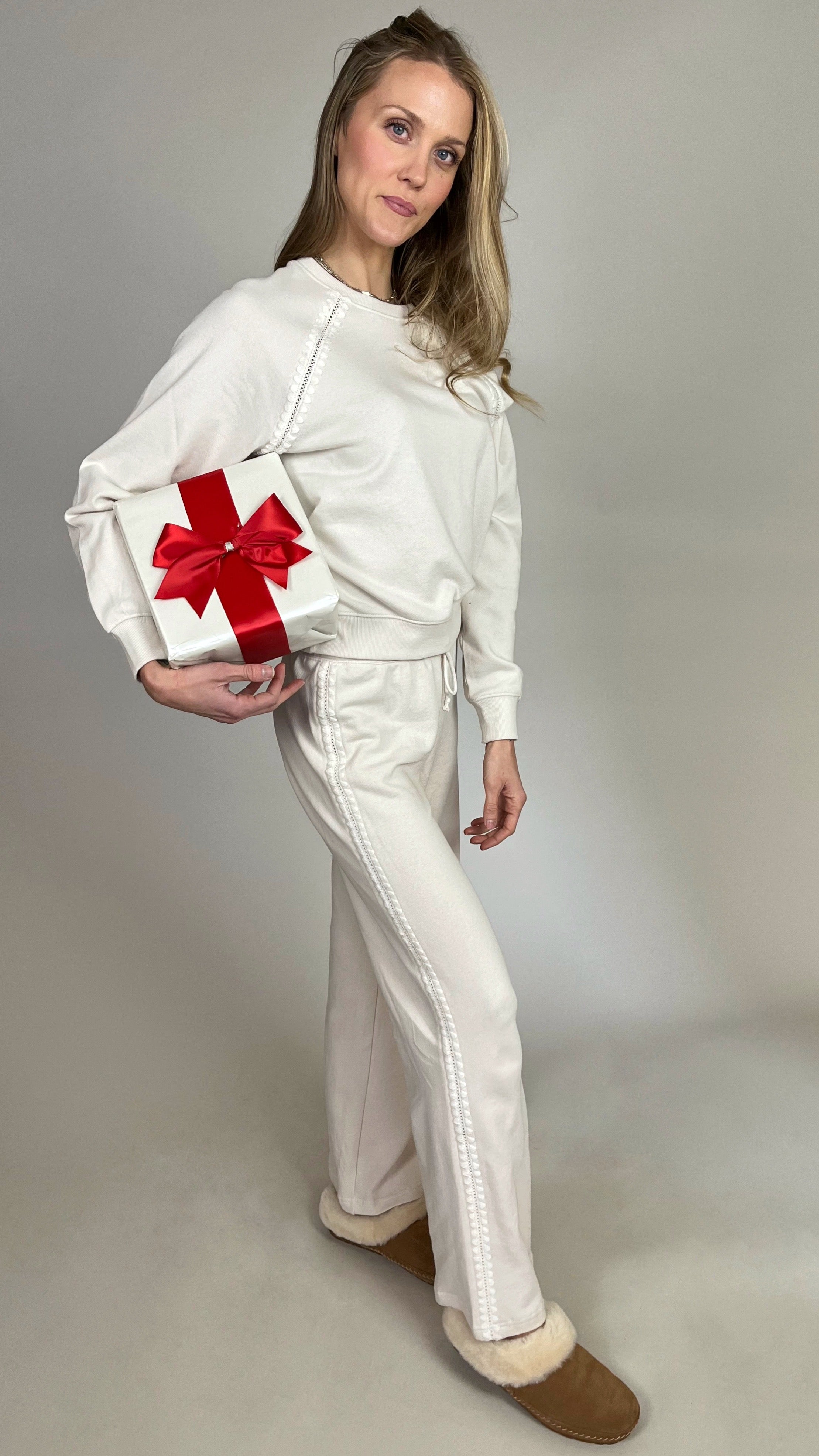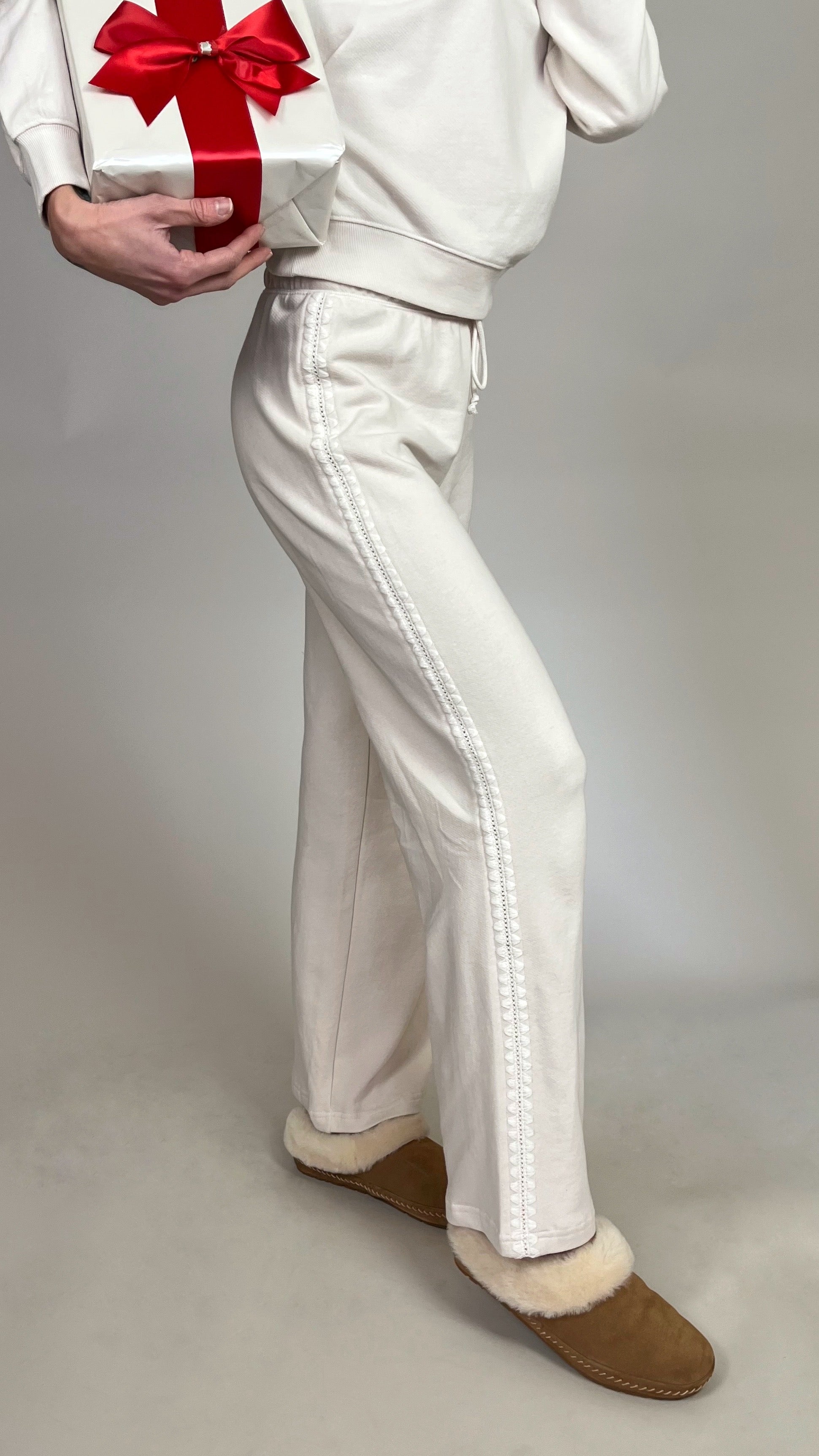 Easygoing with a twist. These cotton French terry wide-legs feature a comfy drawstring waist and delicate crochet trim at the sides for a soft-meets-feminine moment.