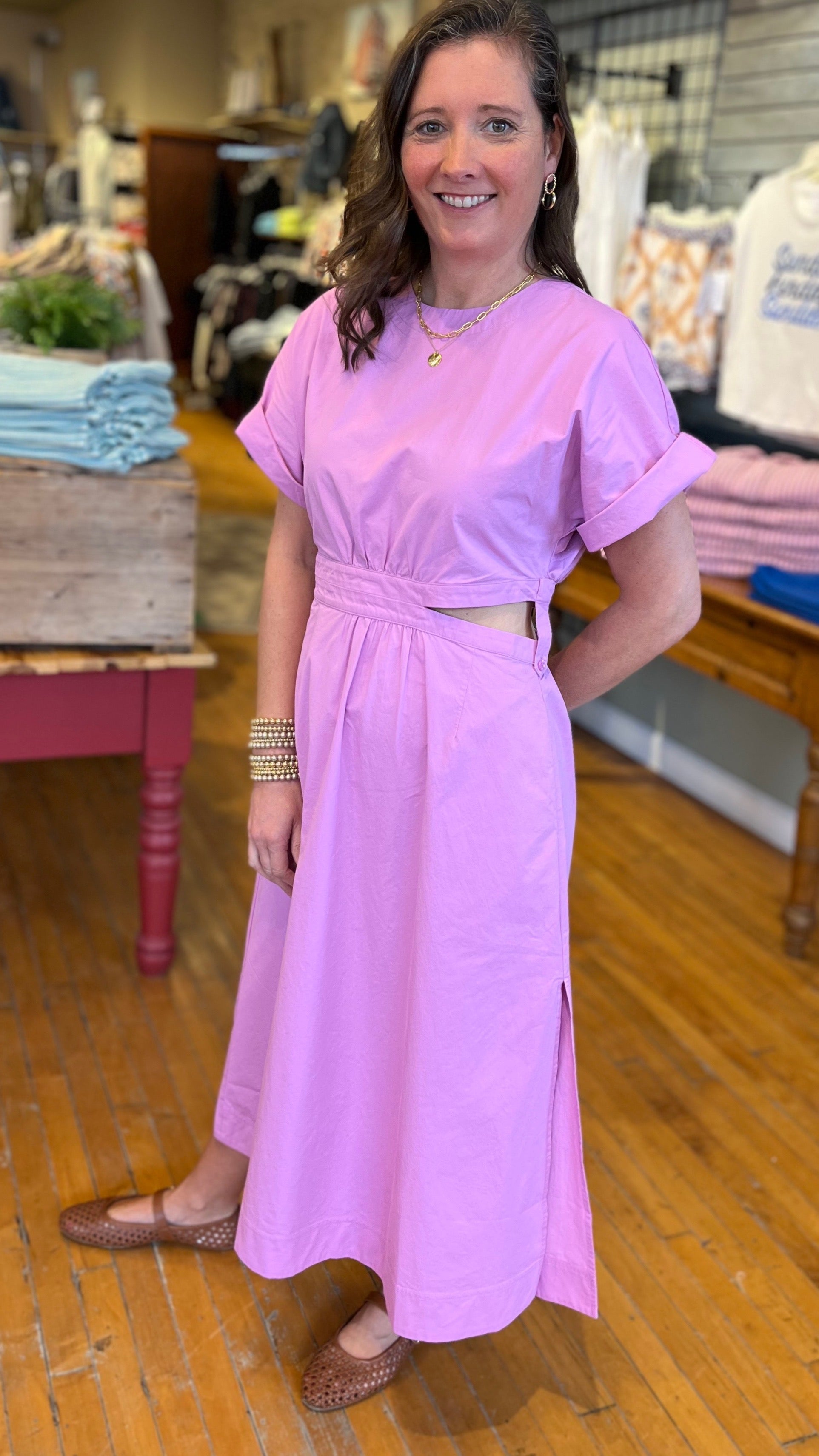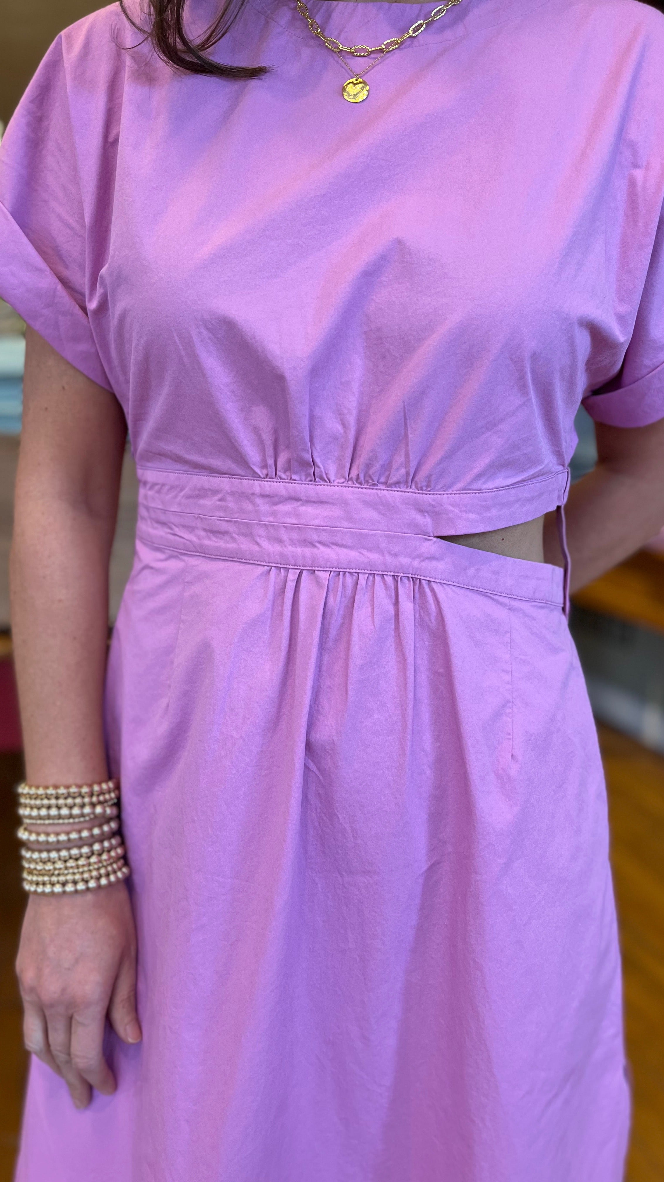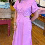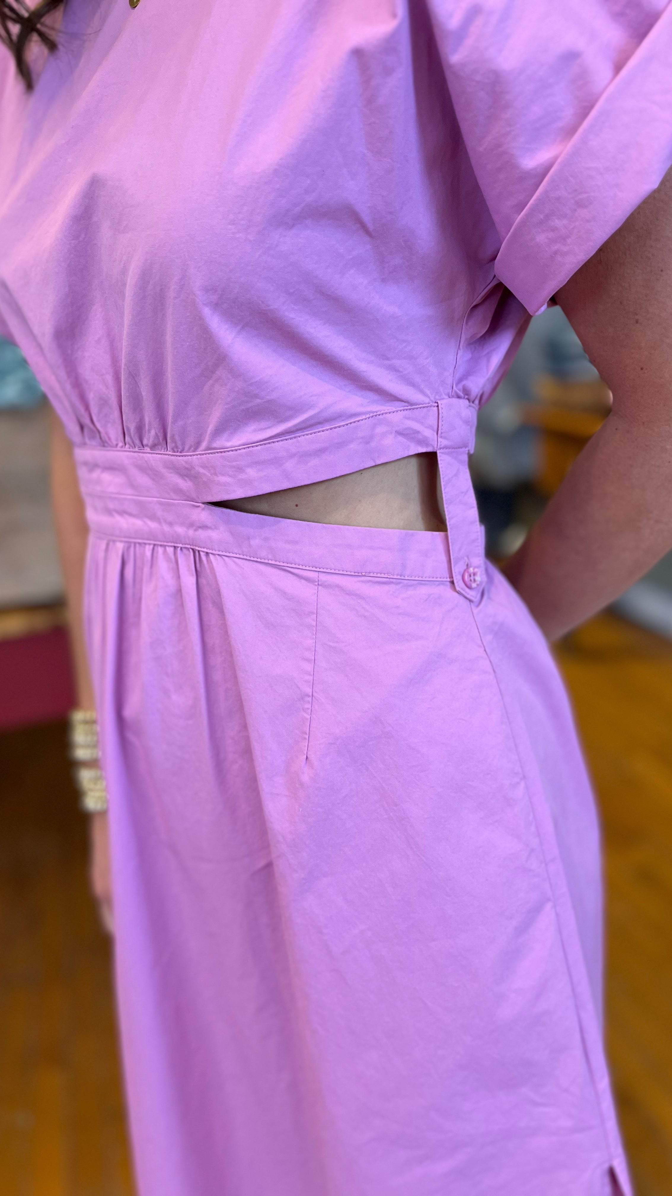 Structured yet effortlessly chic, this midi dress is cut from crisp 100% cotton poplin that holds its shape while remaining light and breathable. Tailored with a jewel neckline, elbow-length sleeves, side zipper for ease and a gently flared skirt, its defining feature is the airy side cutouts that add a modern edge and sculpted silhouette. A back keyhole with button-and-loop closure completes the refined finish, making it a versatile piece that feels both polished and playful.