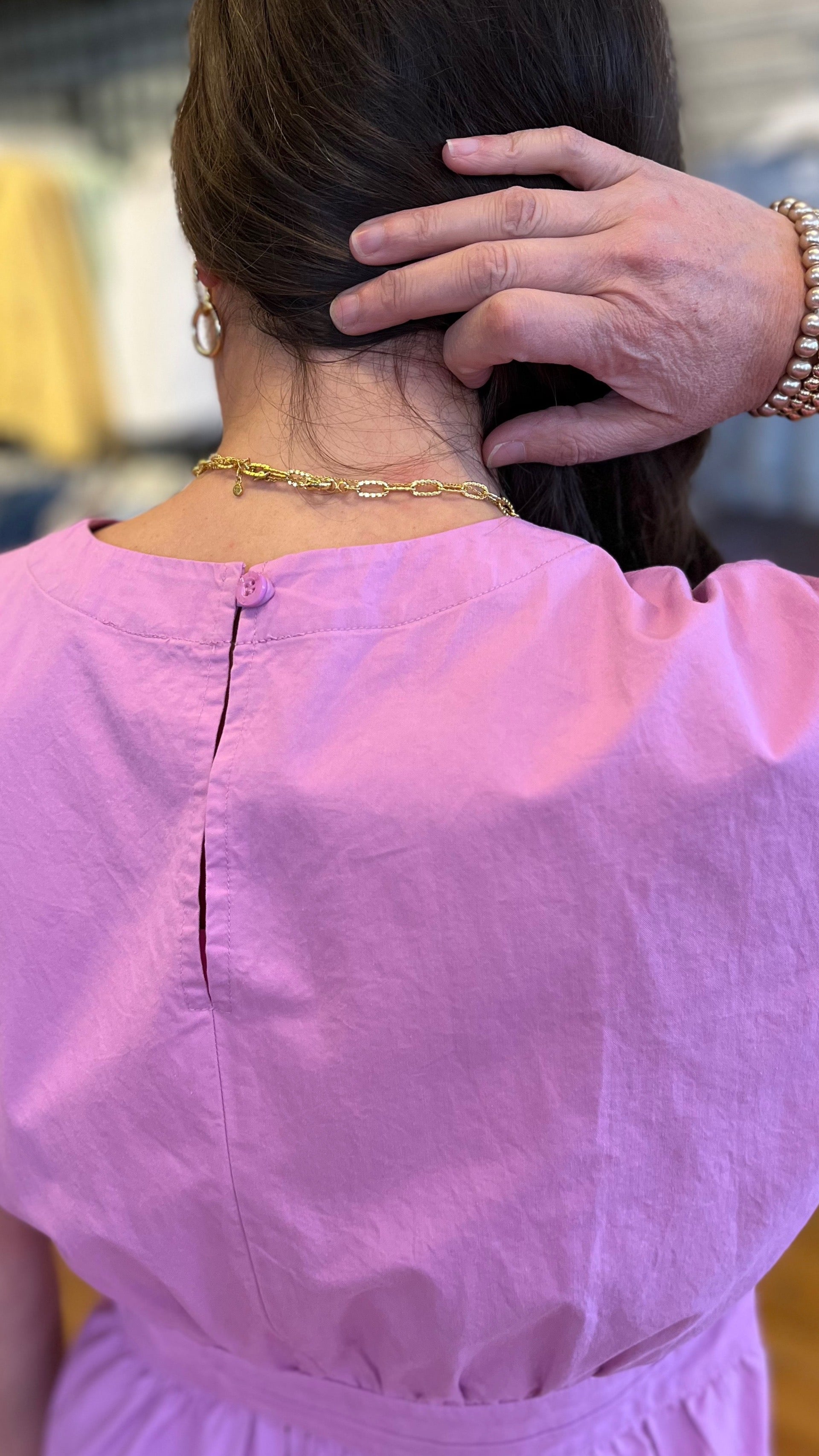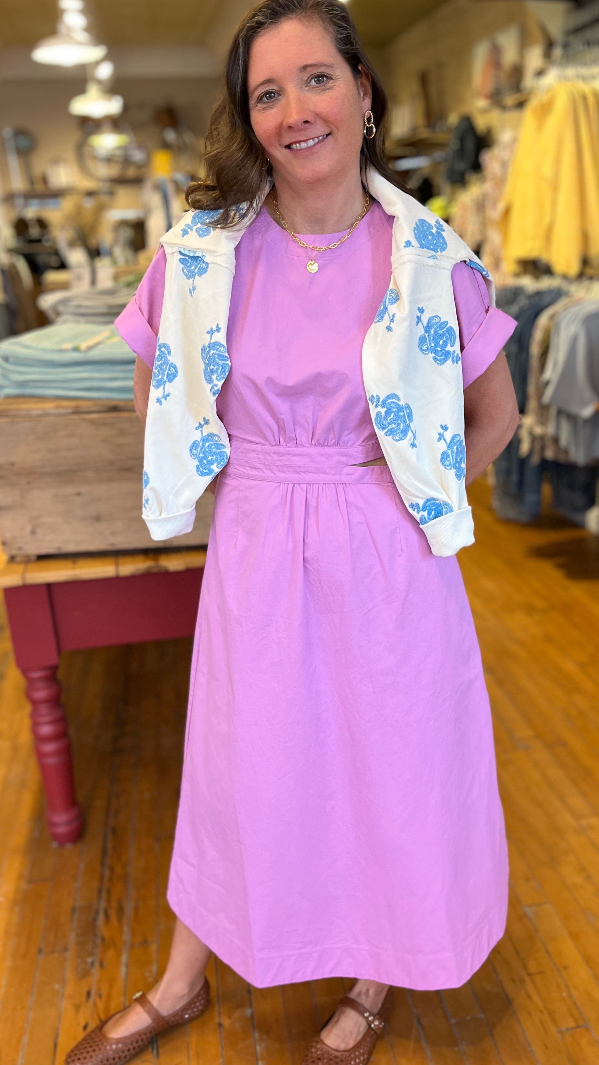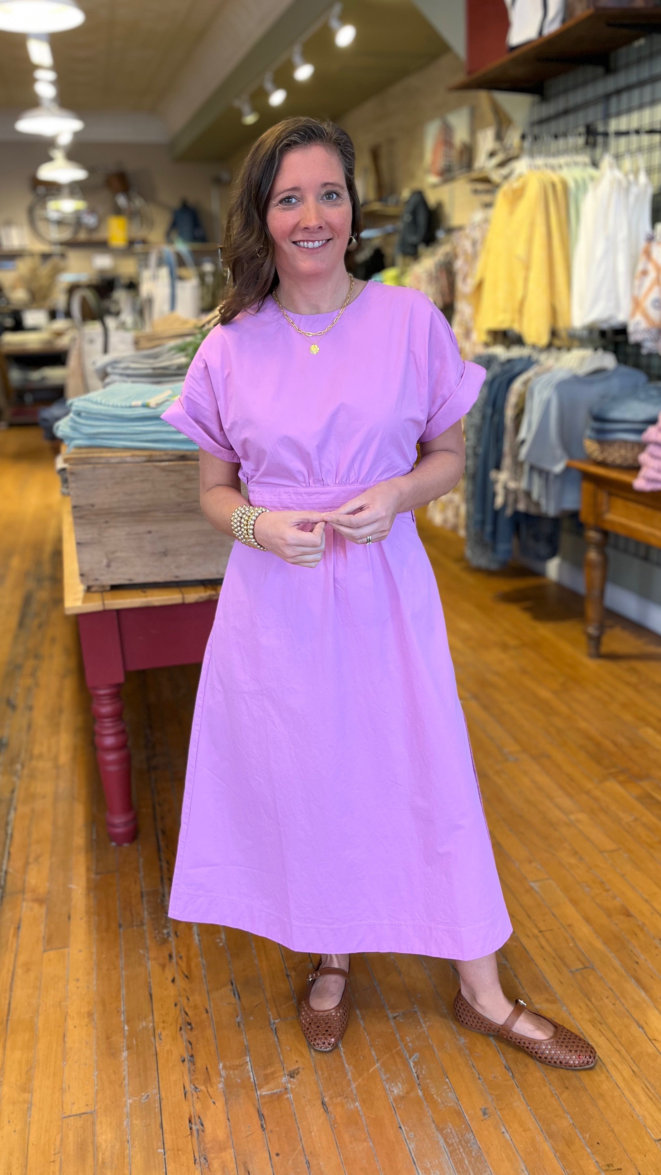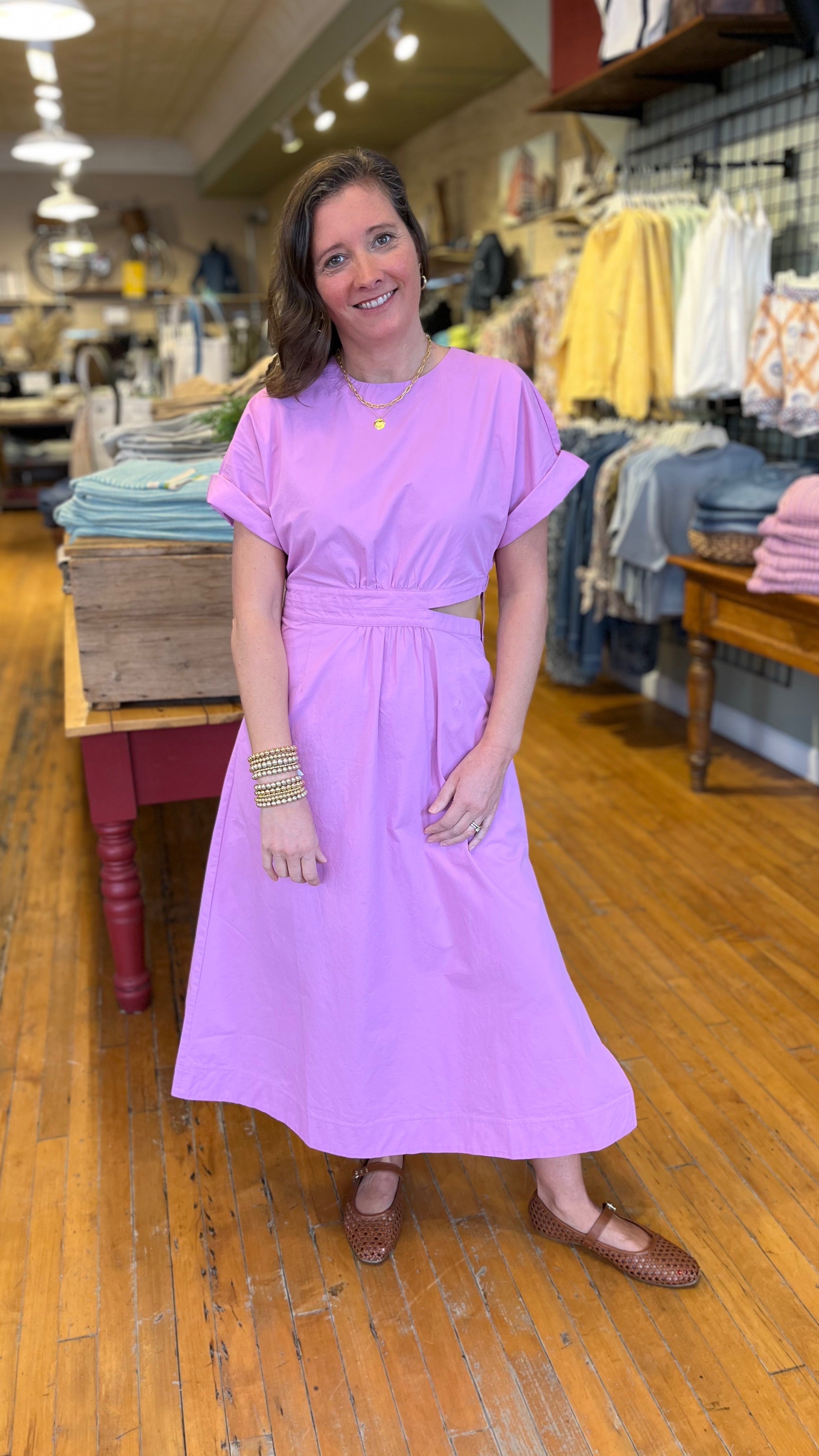 Structured yet effortlessly chic, this midi dress is cut from crisp 100% cotton poplin that holds its shape while remaining light and breathable. Tailored with a jewel neckline, elbow-length sleeves, side zipper for ease and a gently flared skirt, its defining feature is the airy side cutouts that add a modern edge and sculpted silhouette. A back keyhole with button-and-loop closure completes the refined finish, making it a versatile piece that feels both polished and playful.