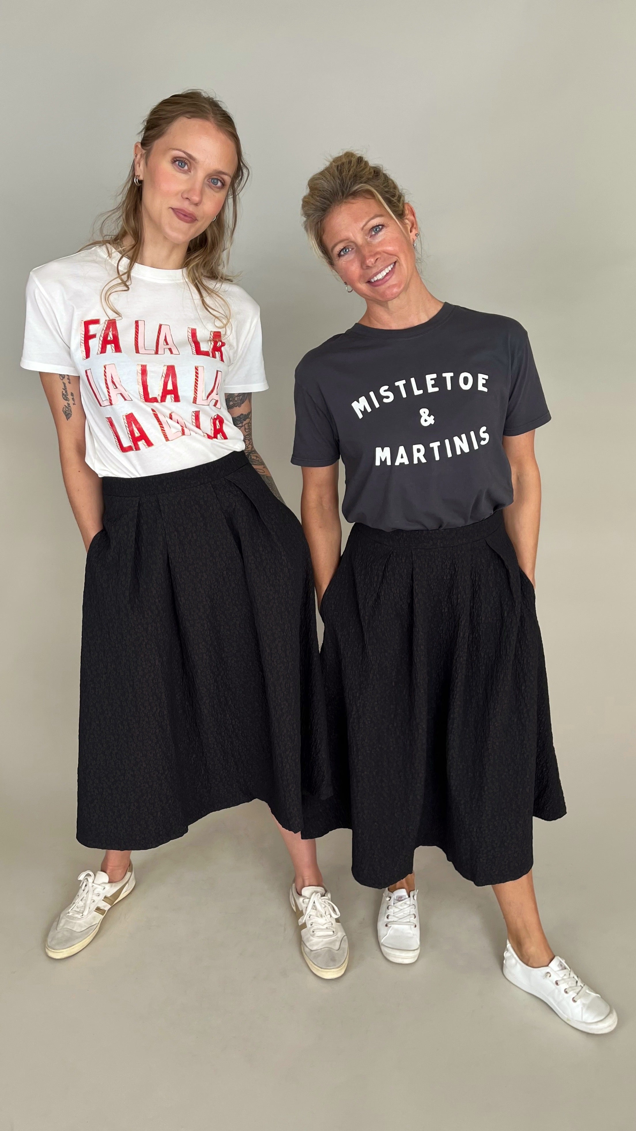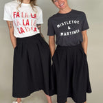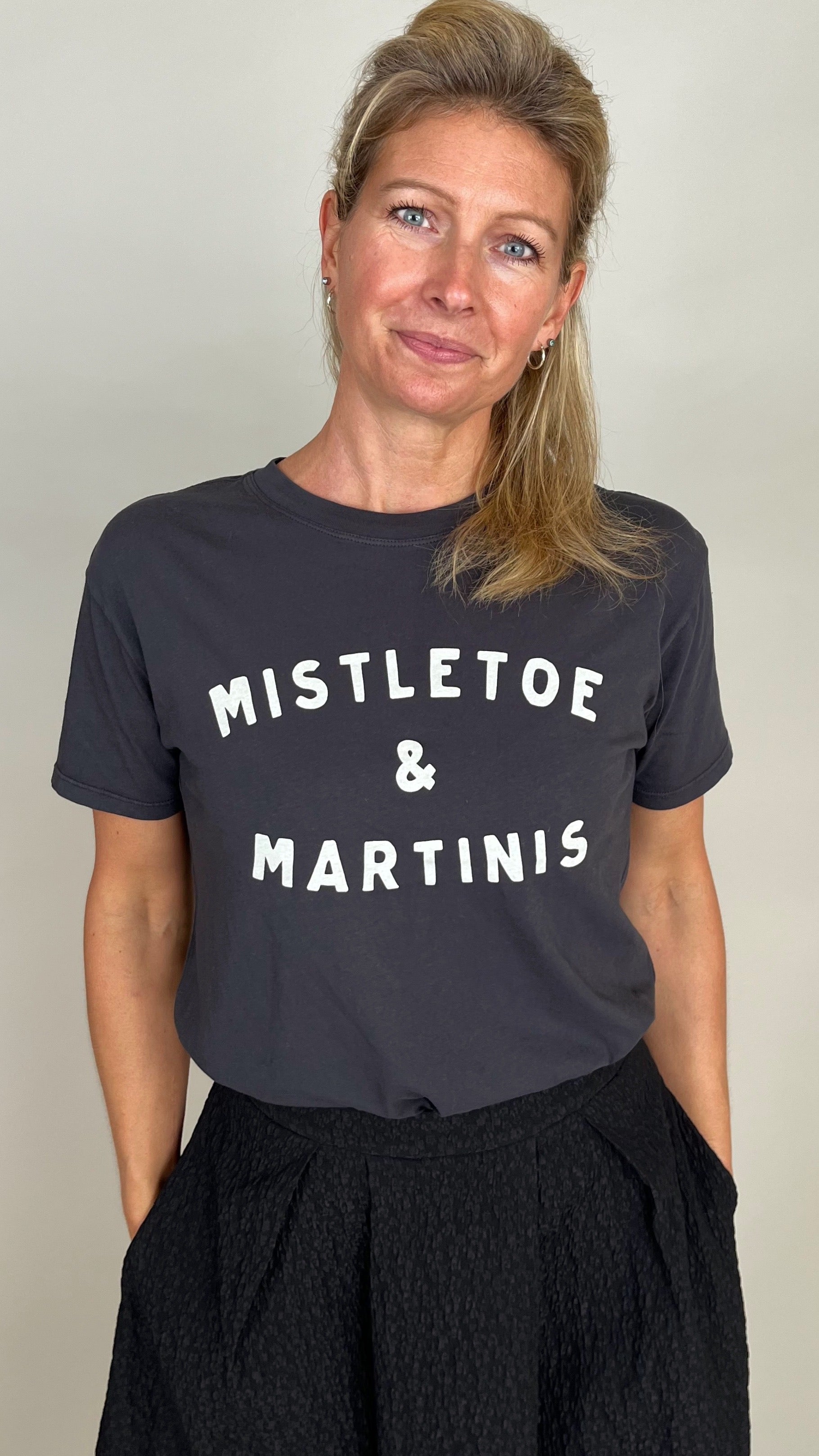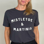 "Mistletoe & Martinis" Tee: Off-white print on a vintage wash jersey knit charcoal tee.
