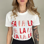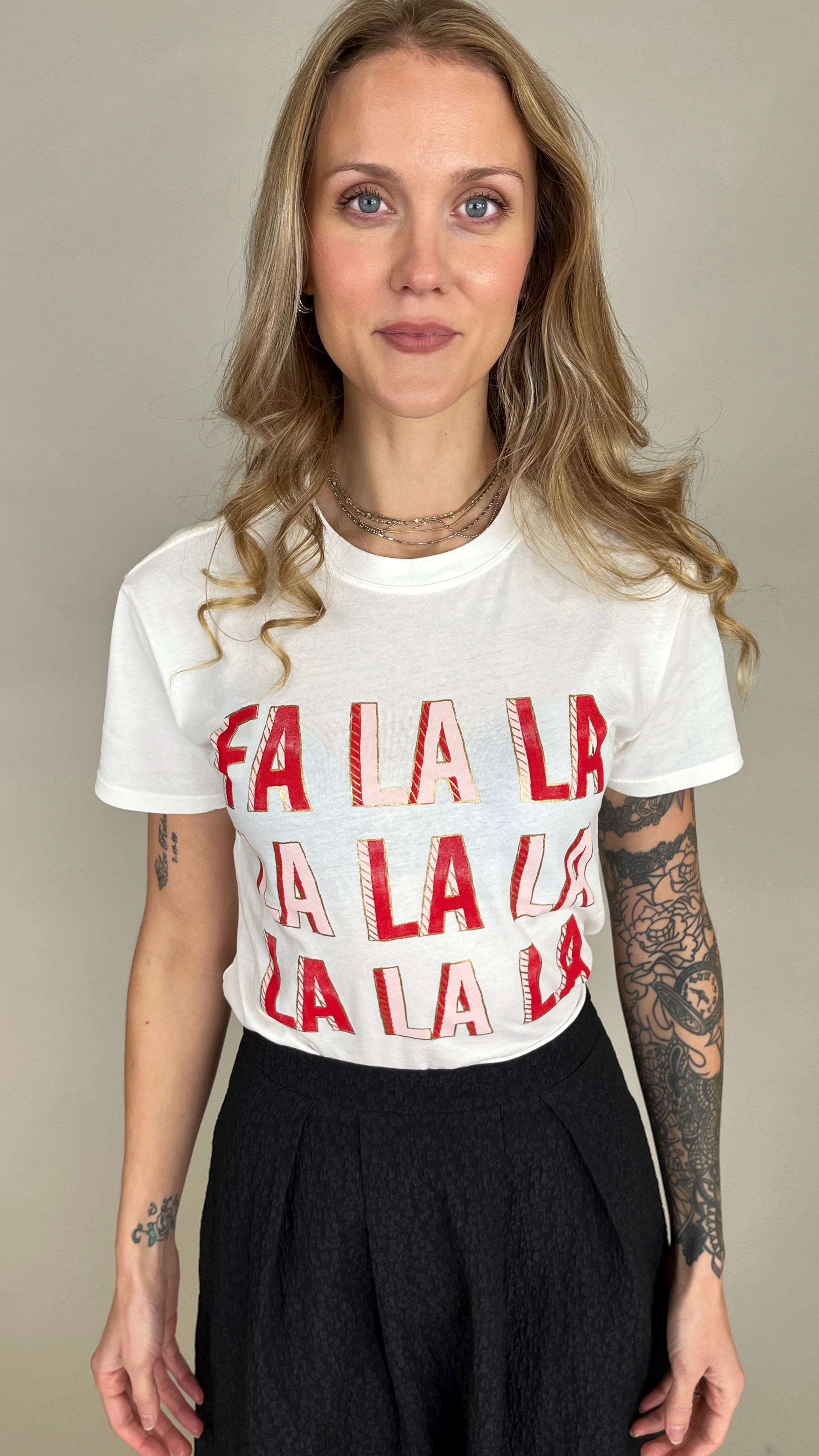 "Fa La La La" Tee: Red and pink graphic with gold foil printed on a off-white jersey knit tee.