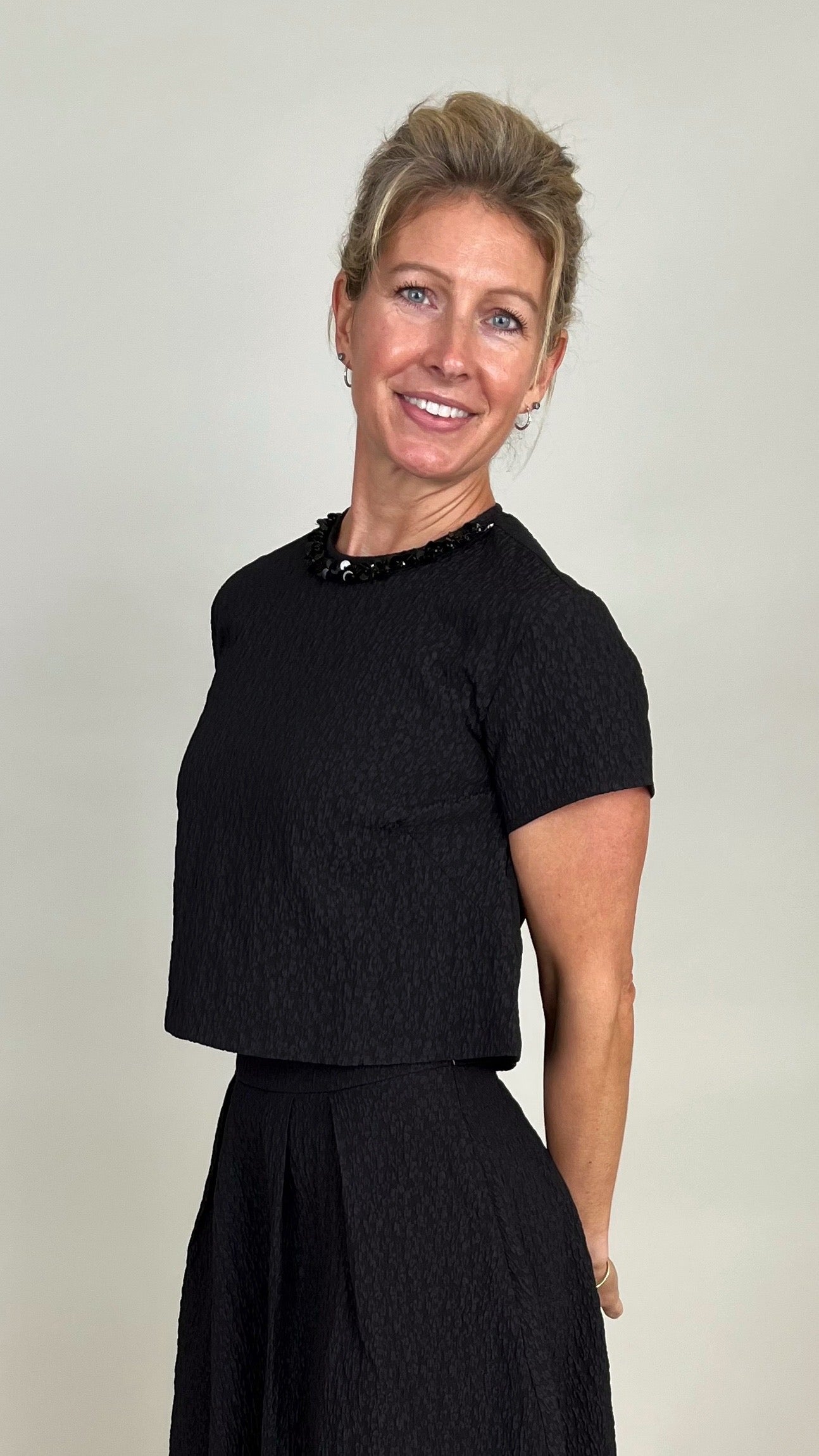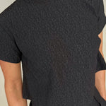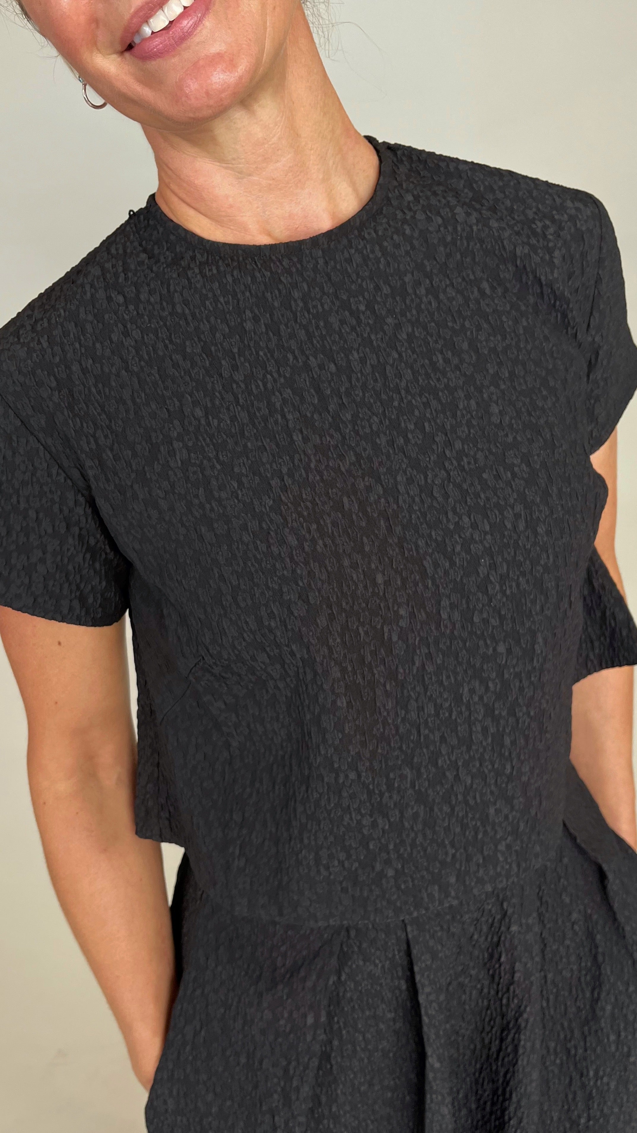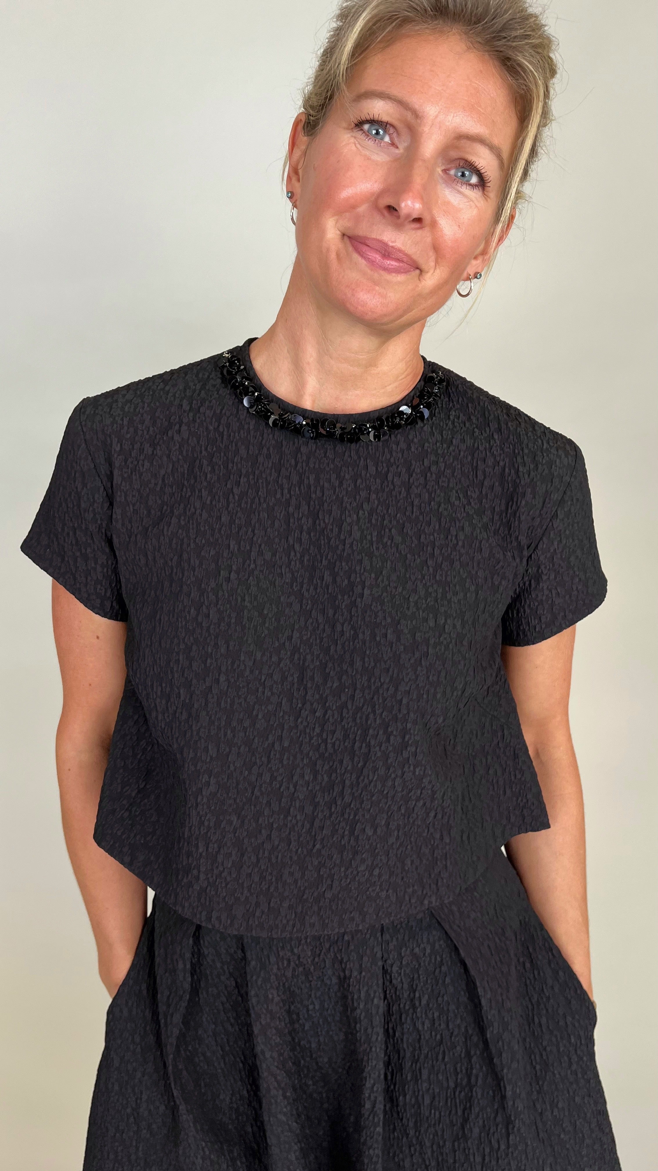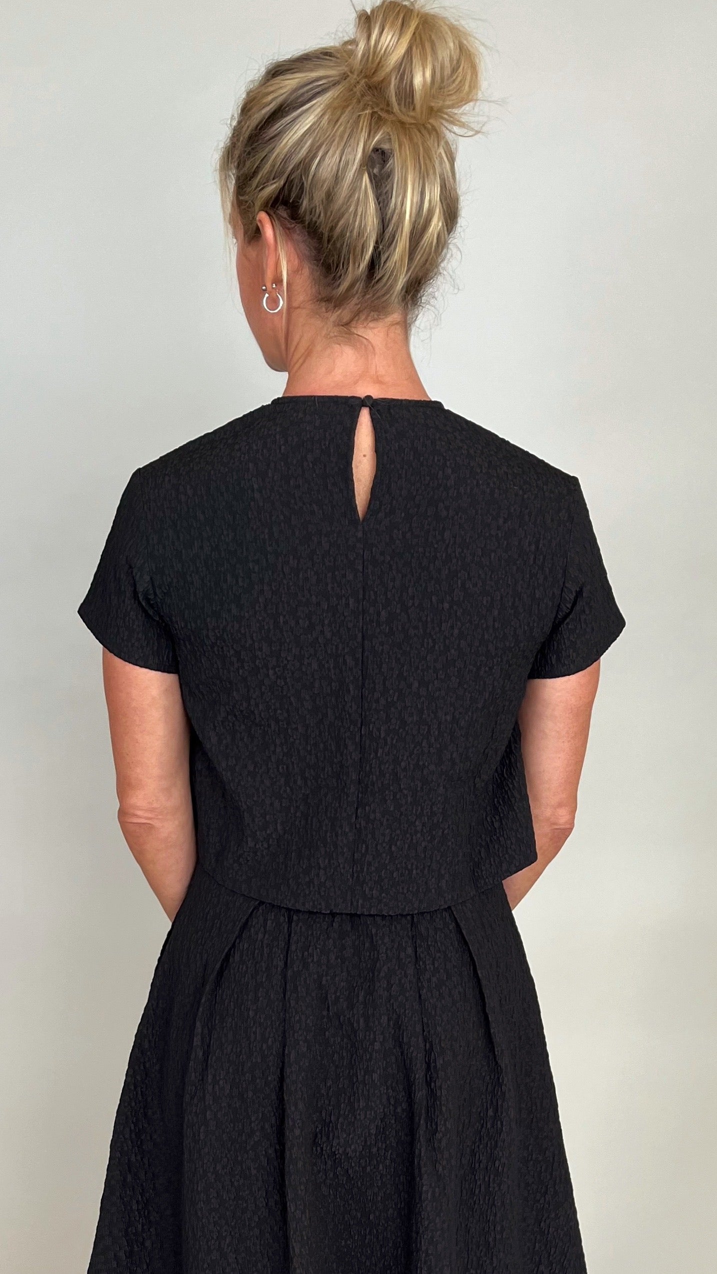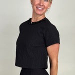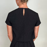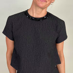 Effortless in shape, elevated in detail—this chic black textured crop tee offers a fresh yet refined look. Crafted in a subtle jacquard-like fabric, delicate beaded neckline that is detachable, keyhole button and loop closure in the back with a cropped hem that hits just at the waist for a modern edge. Pair it with high-rise denim for weekend ease or with matching skirt for an elevated evening/holiday look.