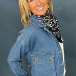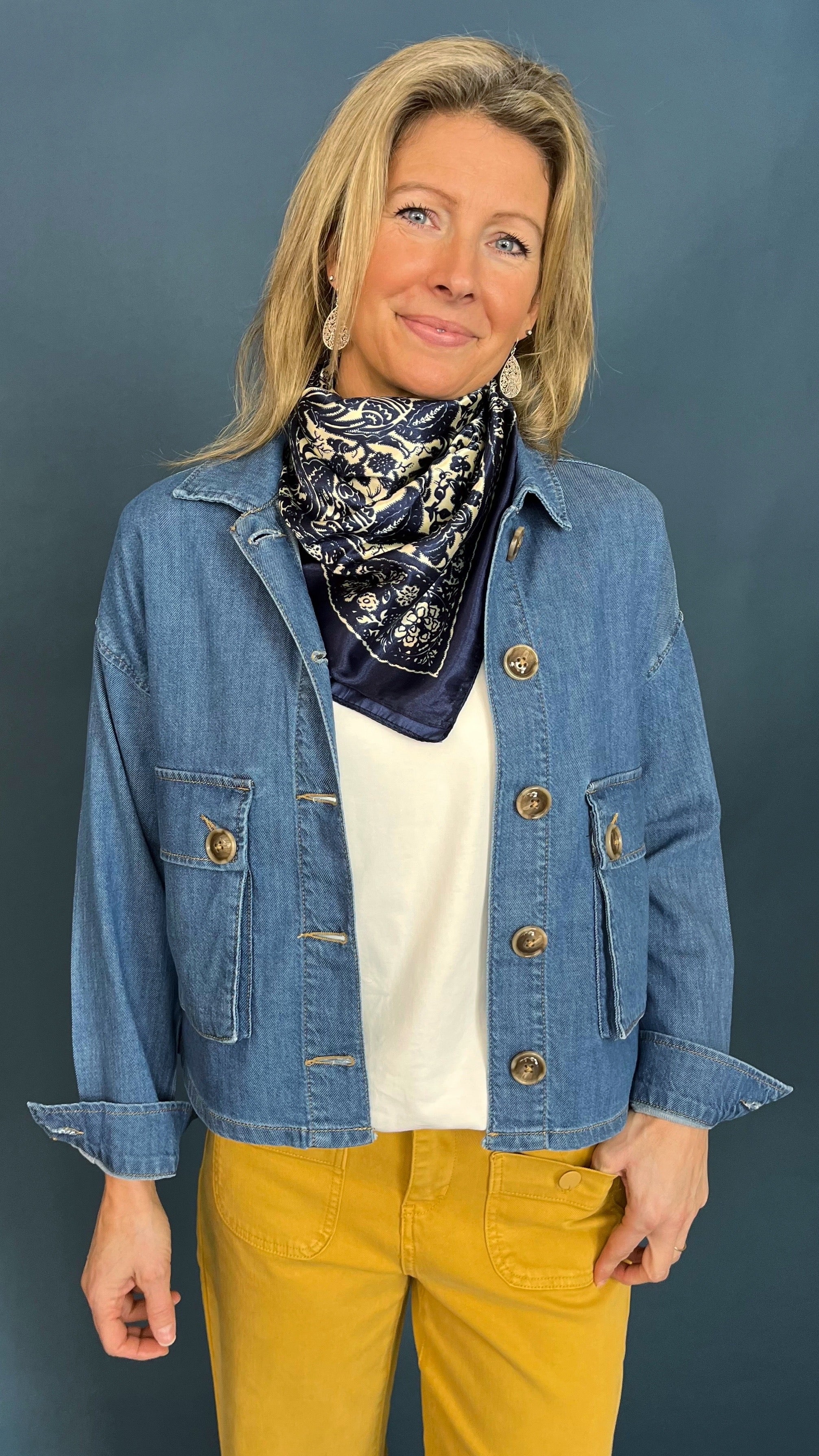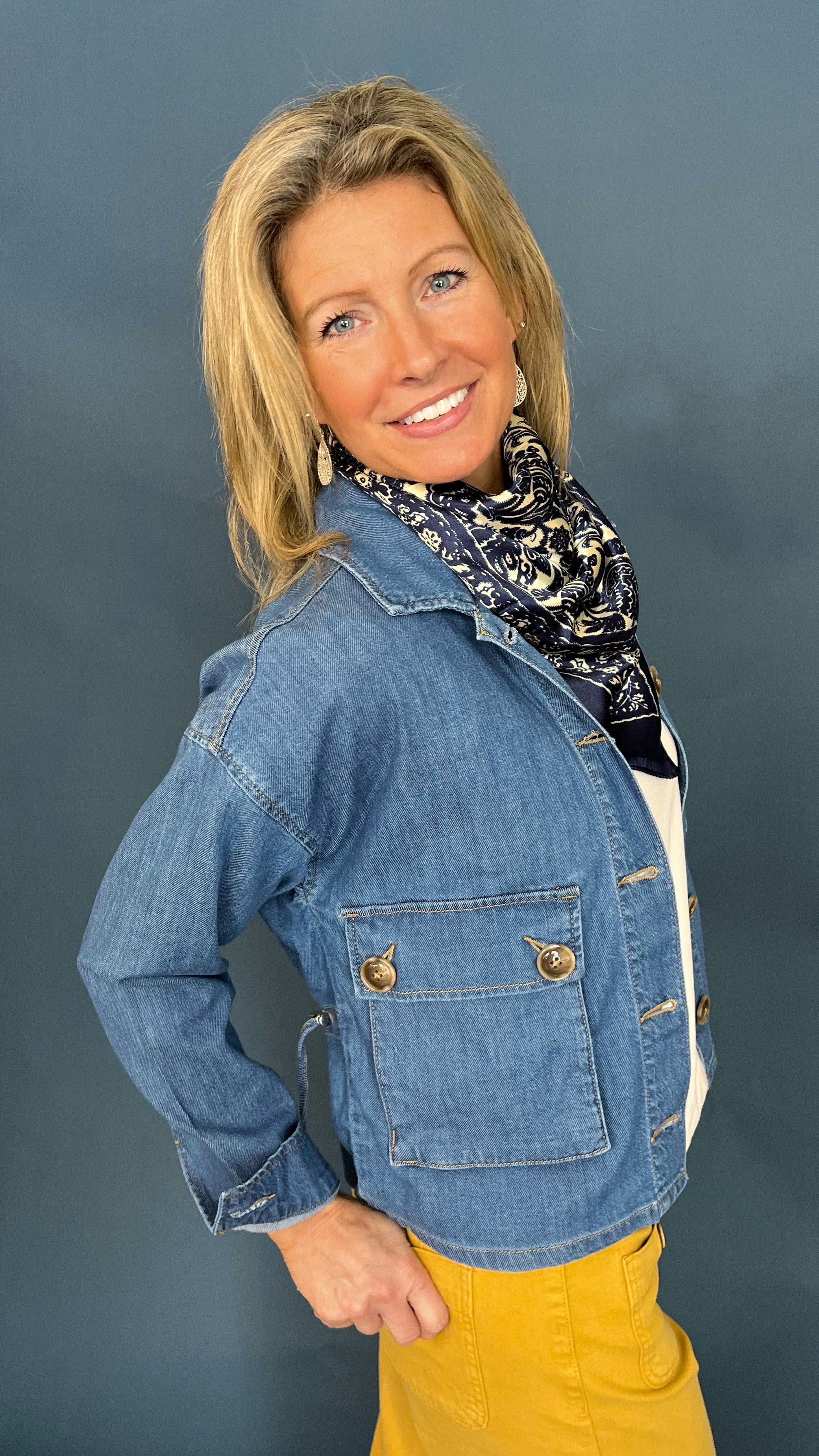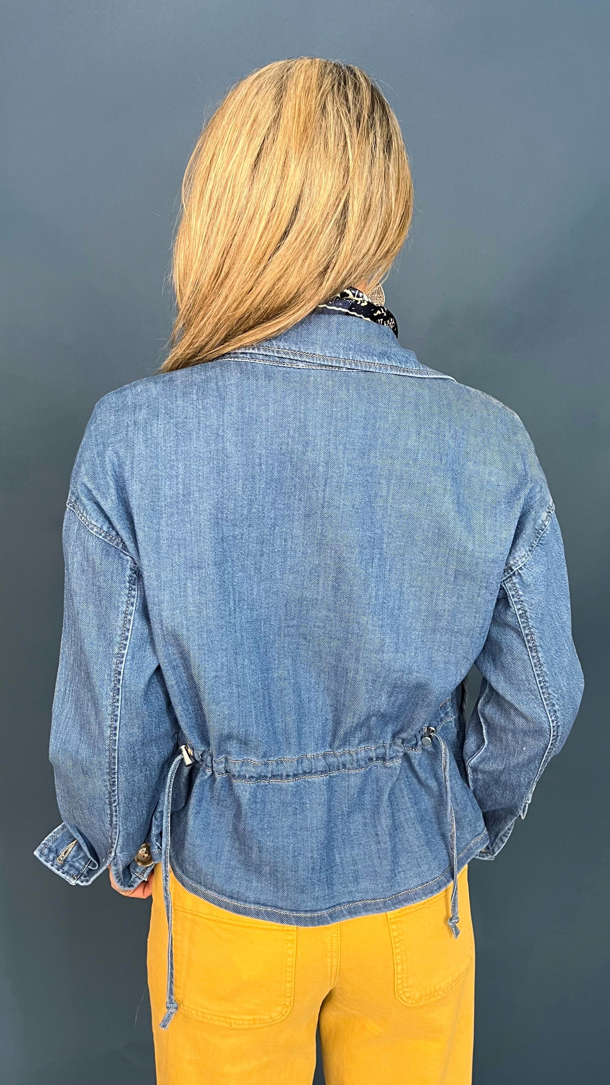 Lightweight denim utility chore jacket with large buttoned front pockets and adjustable drawstrings at the back to add definition. Pair over tee shirts or blouses to finish your look.