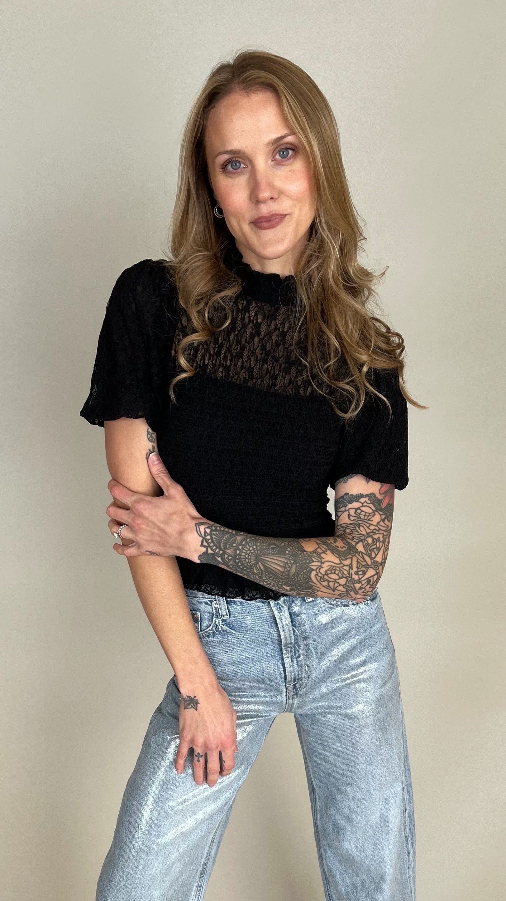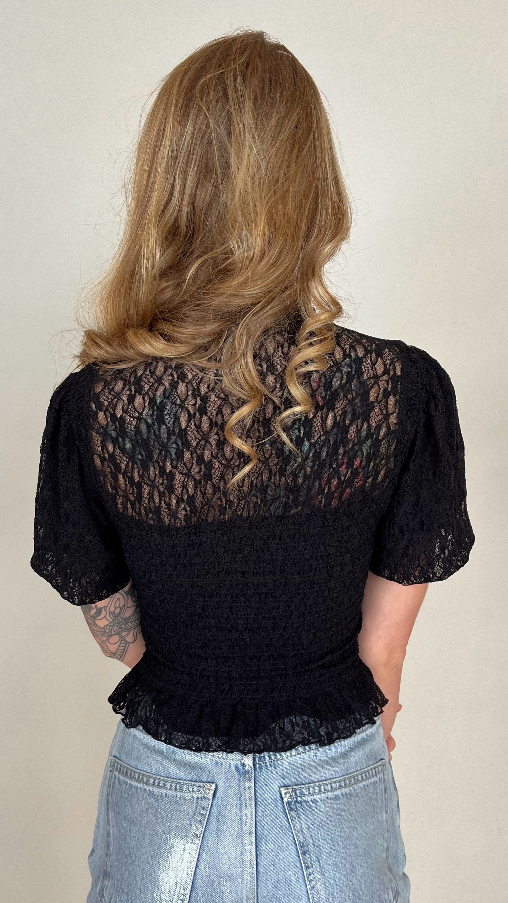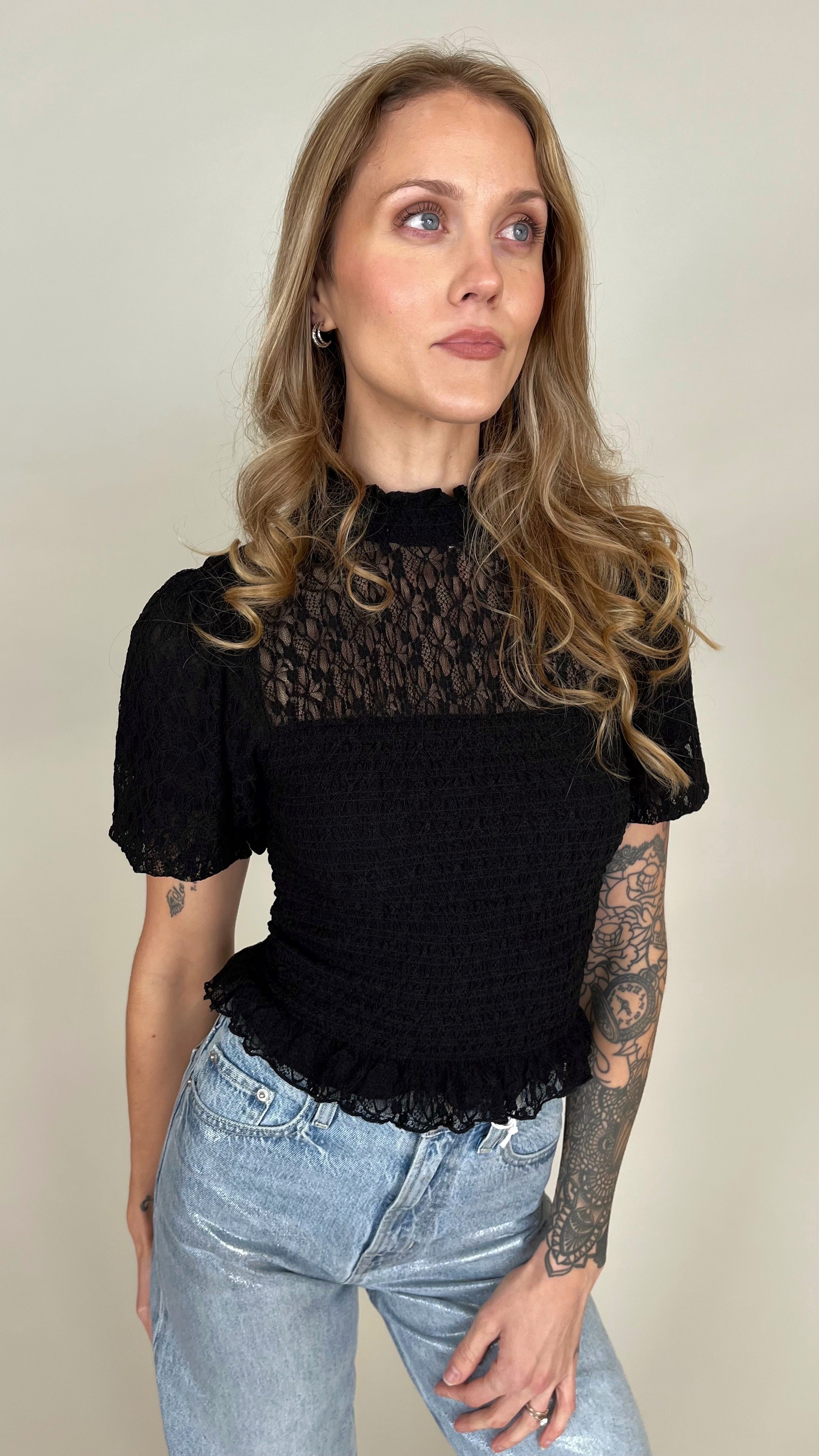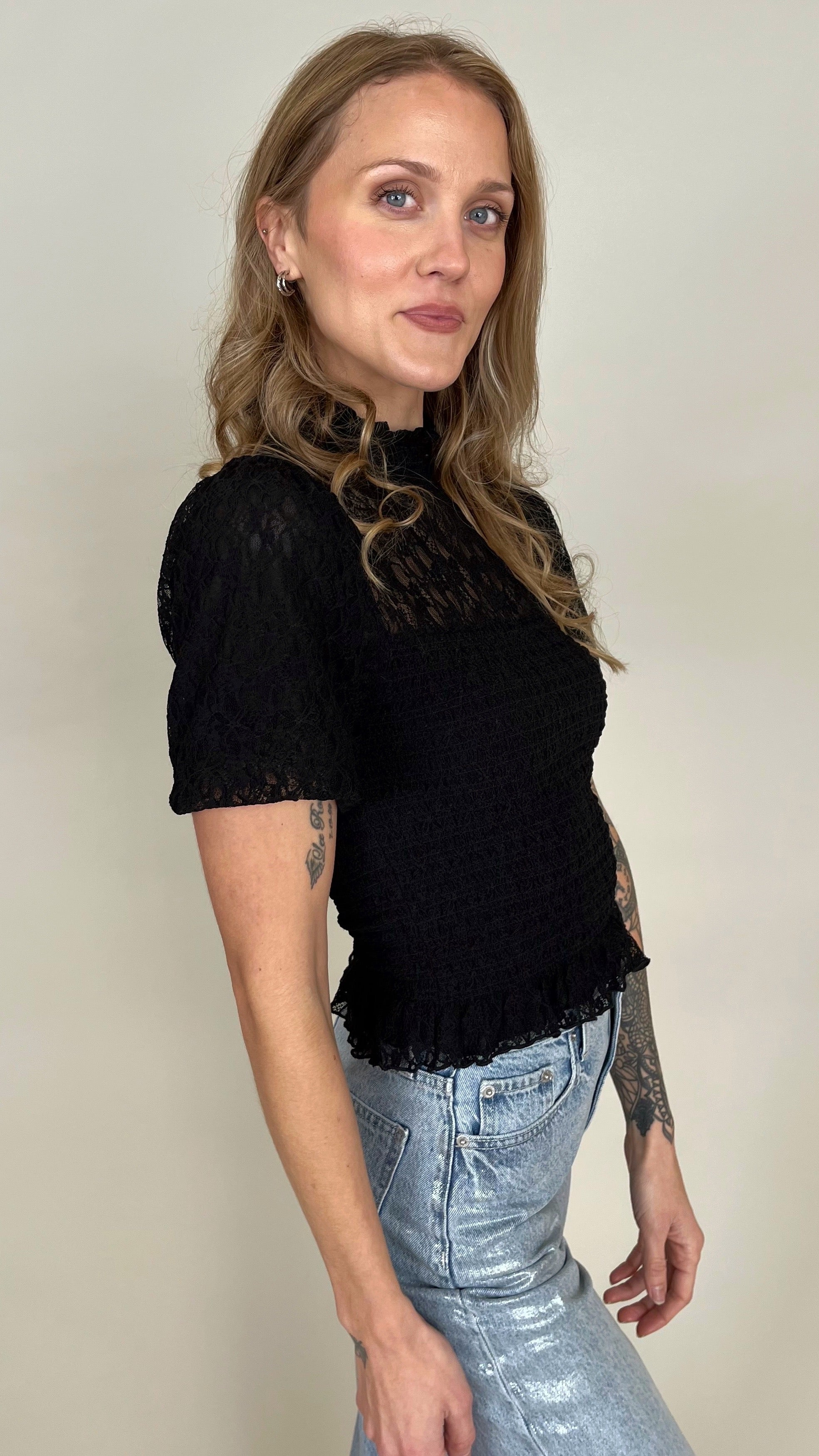Feminine and chic, this black lace top features sheer puff sleeves and a delicate lace yoke for a romantic touch. The smocked bodice offers a flattering, comfortable fit, finished with subtle ruffle trims. Perfect for pairing with denim or tailored pieces for an effortlessly polished look.