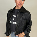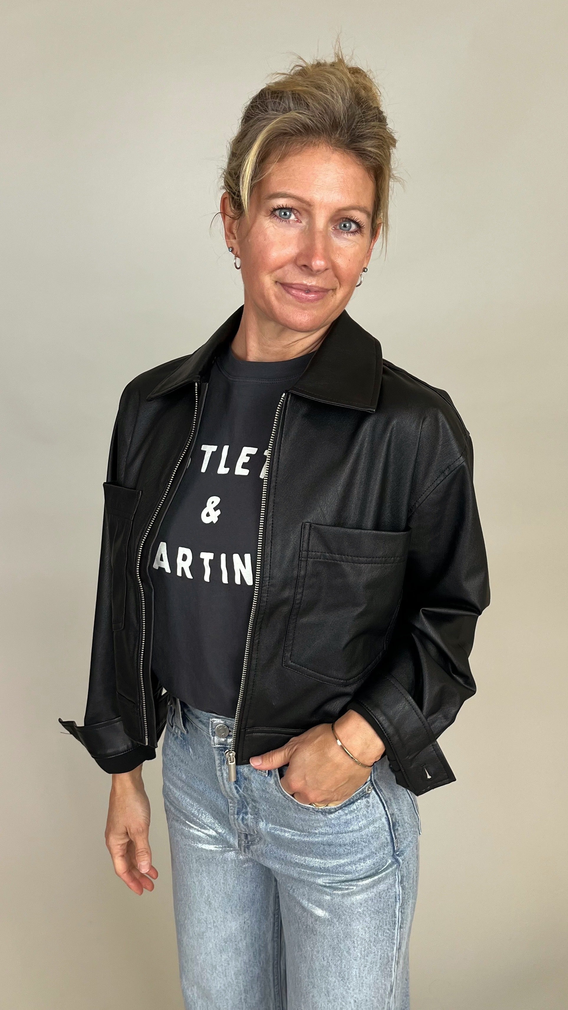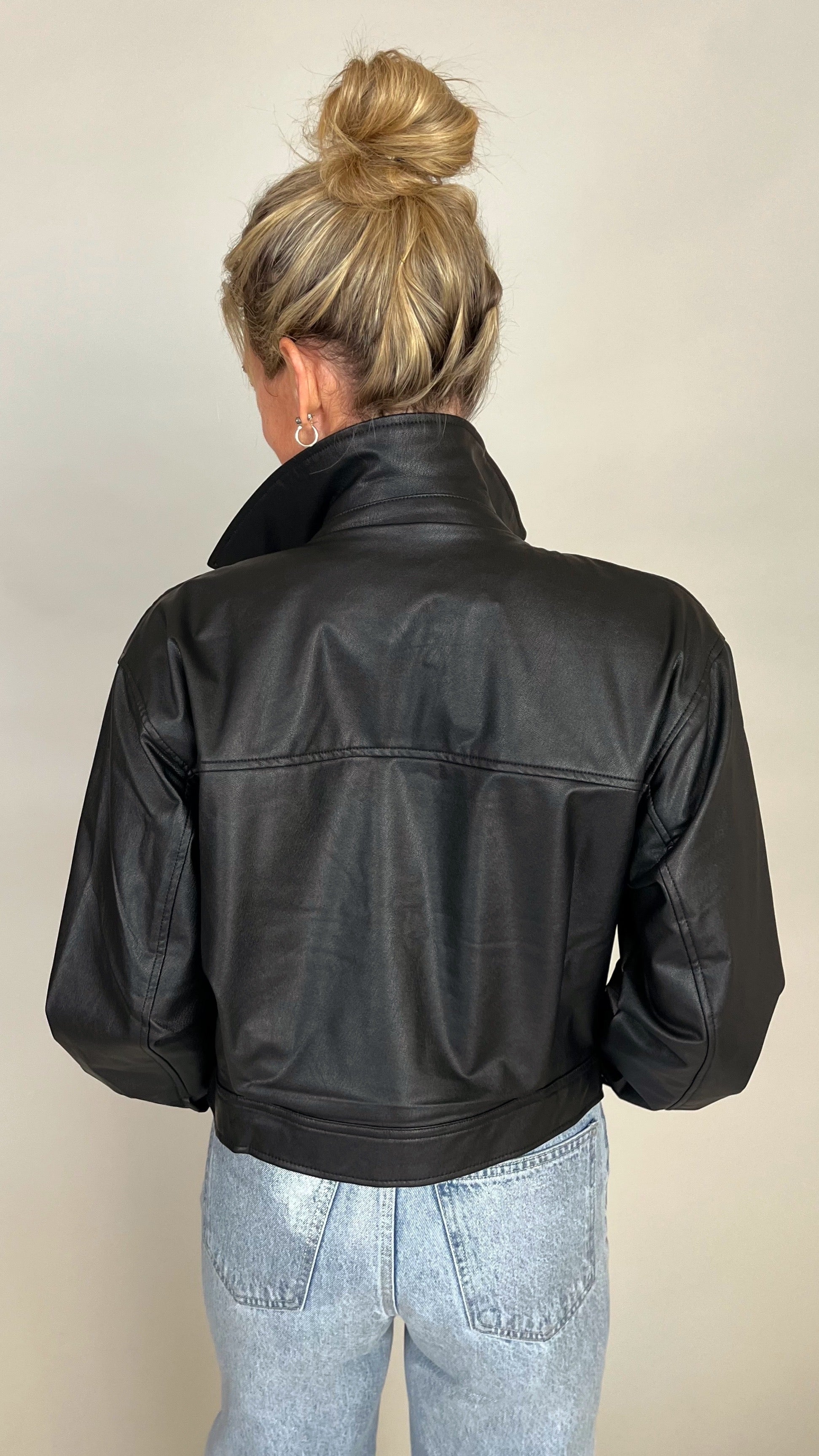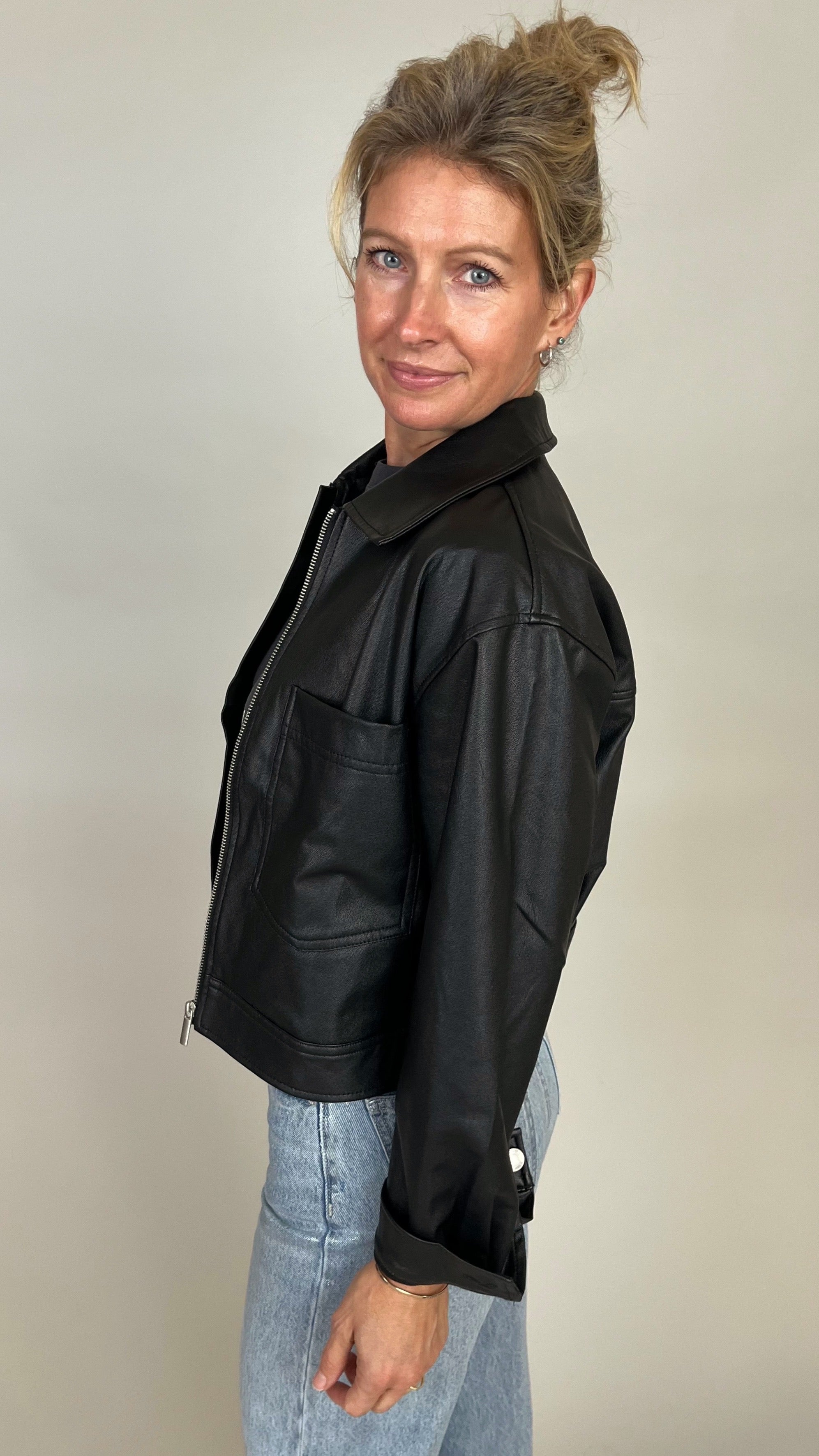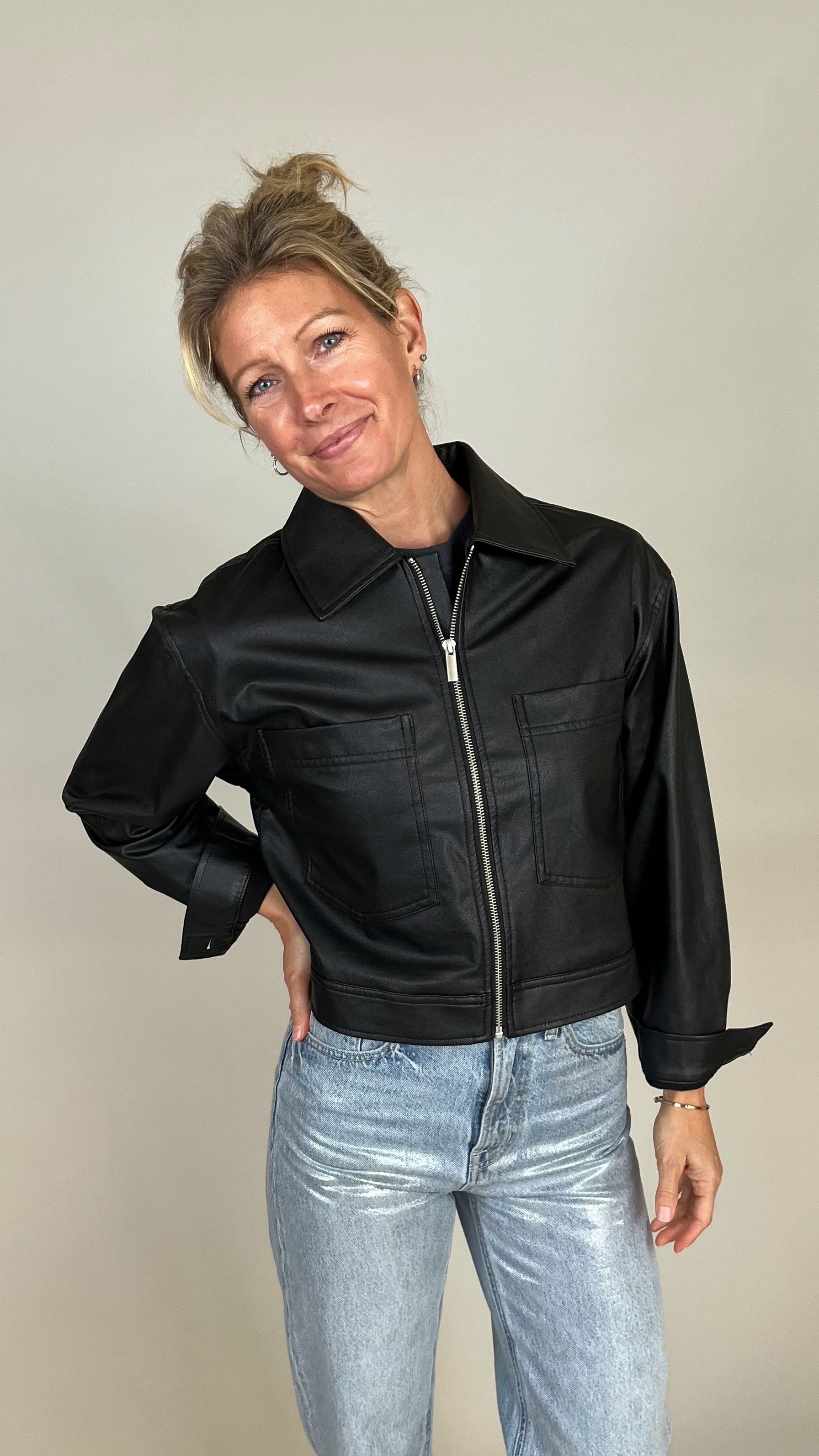 Crafted from soft faux leather with a zip front and patch pockets, this jacket delivers. A seasonal closet staple, it layers effortlessly over denim, dresses, and everything in between.