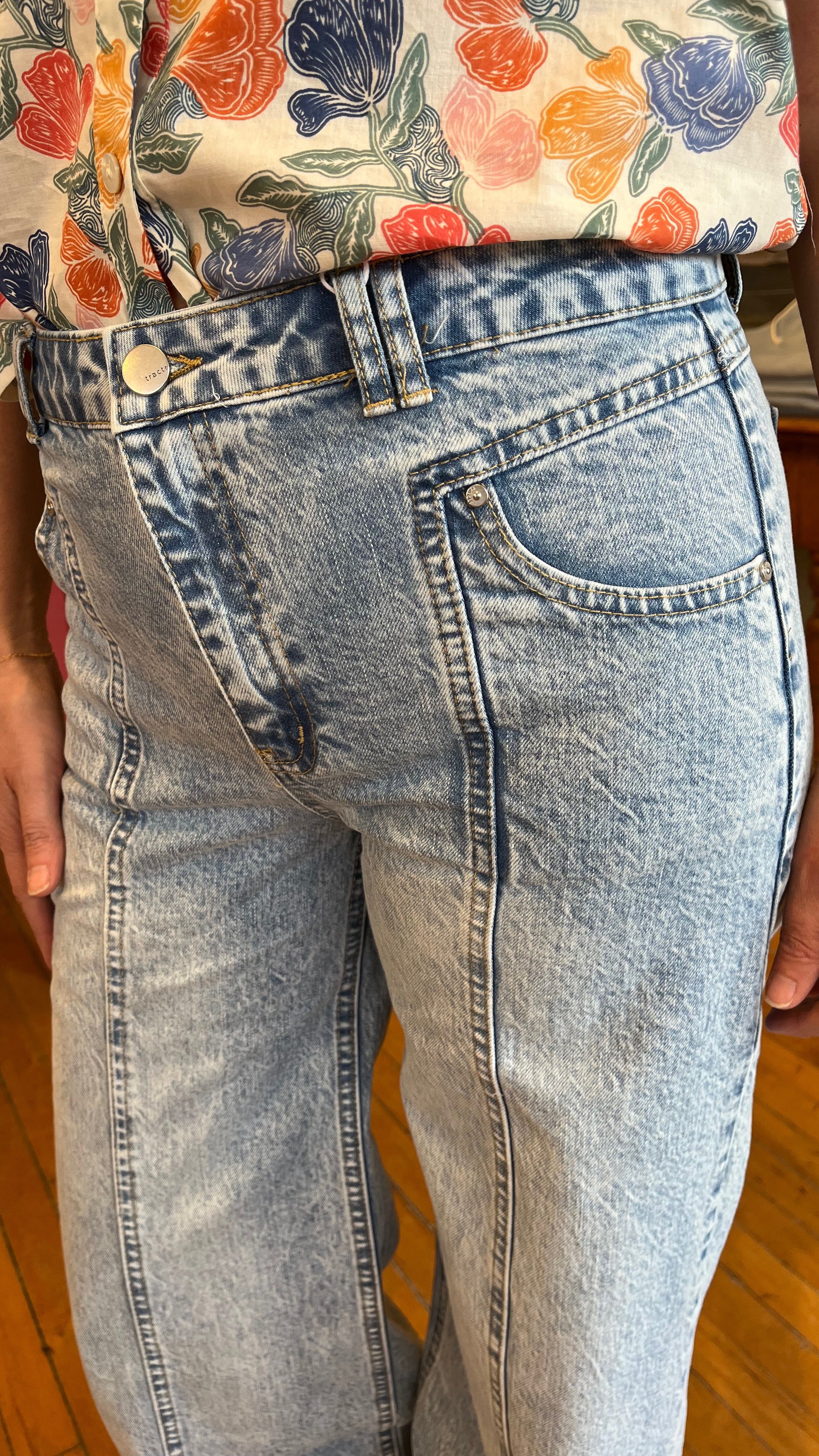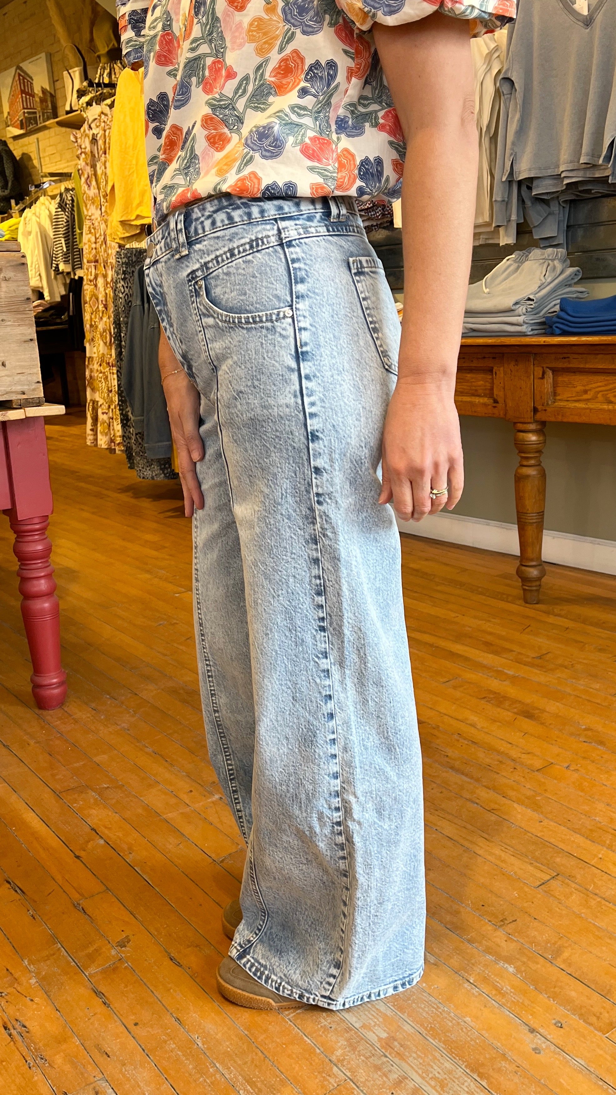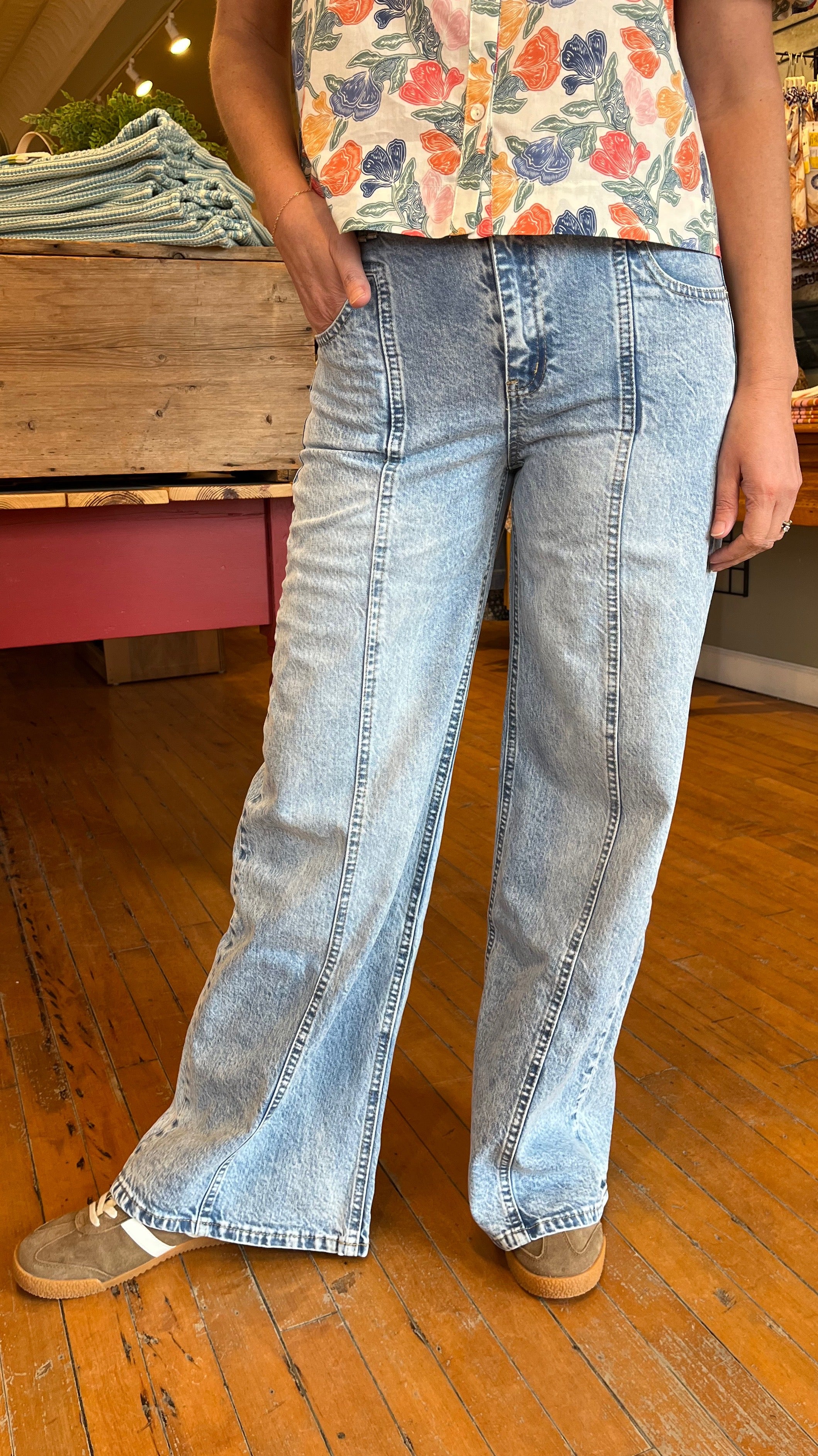 High-rise and effortlessly cool, these light wash jeans feature a relaxed wide leg silhouette and front T seam detailing for a flattering, elongating fit. Crafted from soft, structured denim, they offer a vintage-inspired look with modern edge. Drop in utility inspired front pockets and full-length hem, these are perfect for pairing with everything from sneakers to sandals.