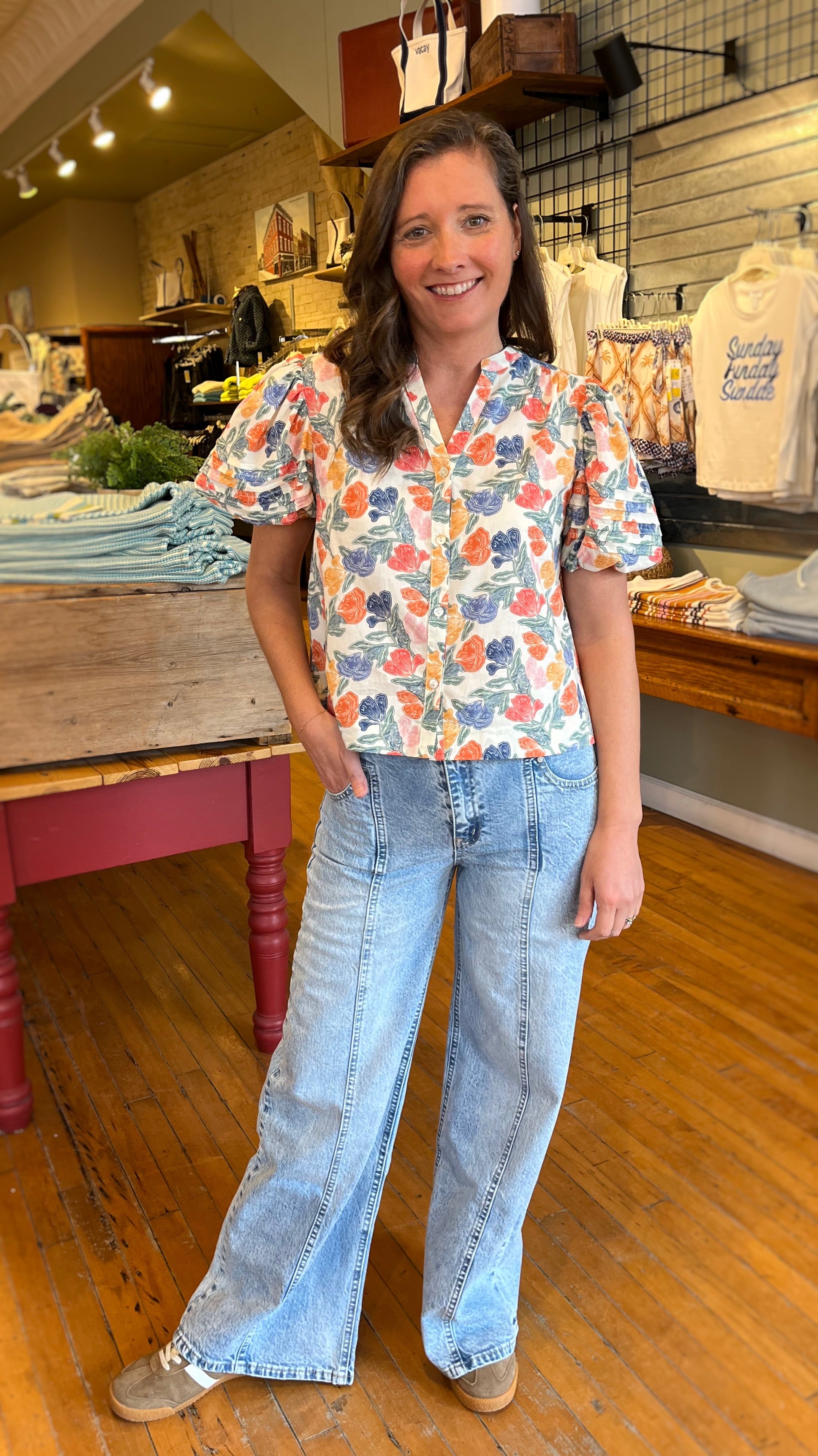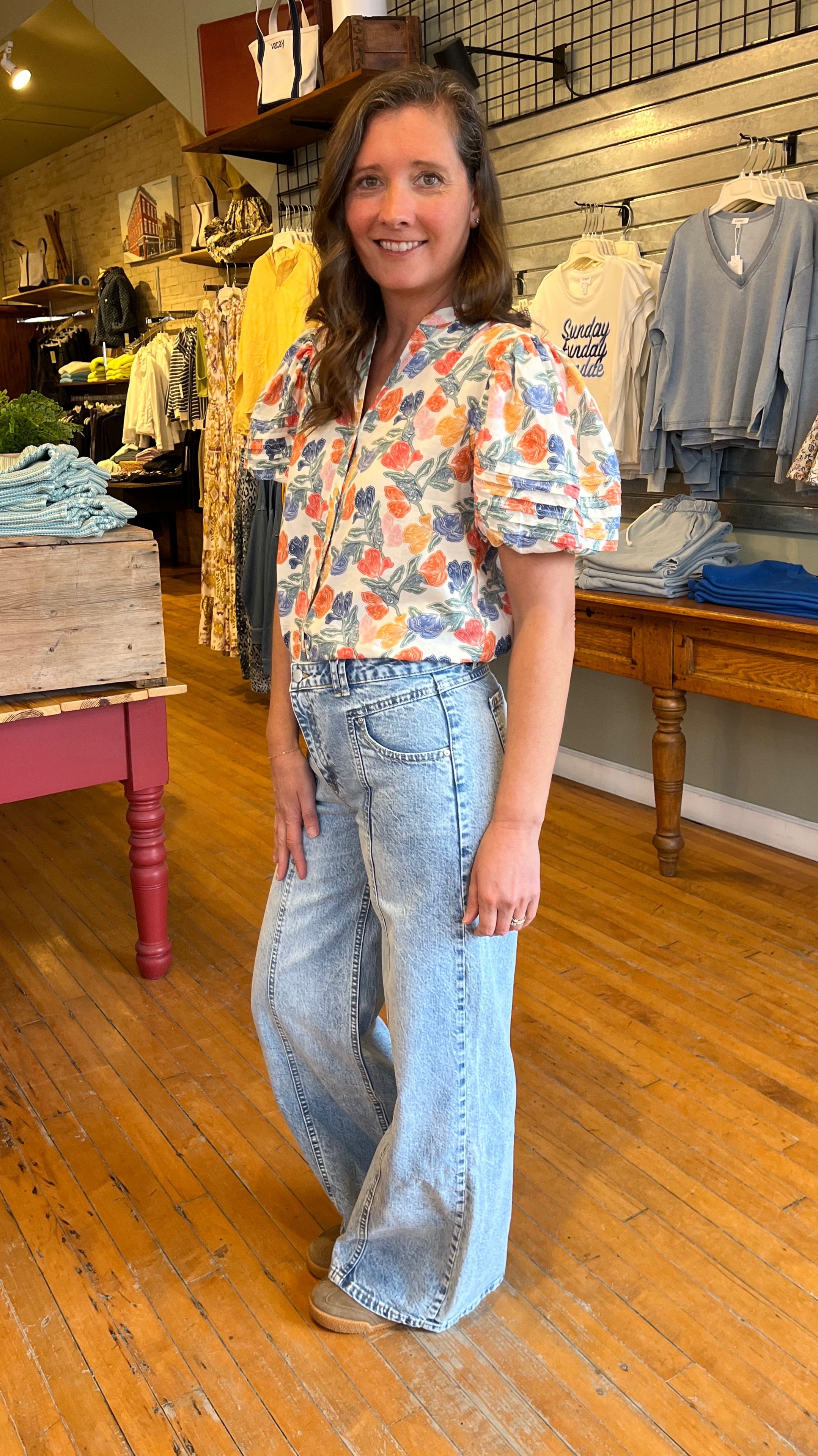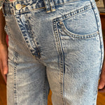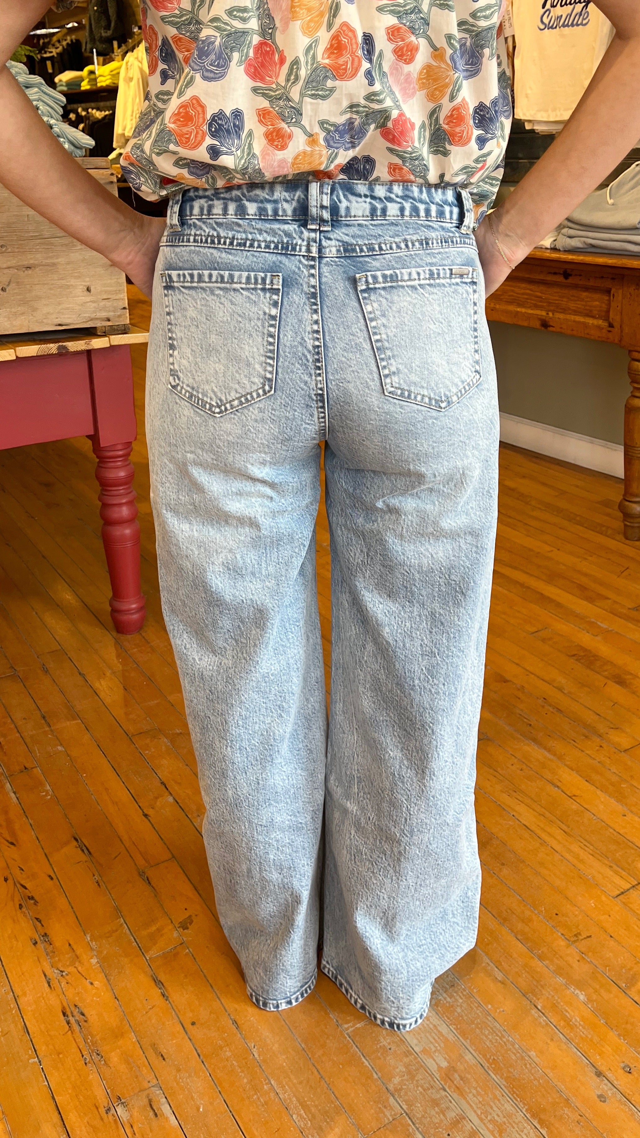 High-rise and effortlessly cool, these light wash jeans feature a relaxed wide leg silhouette and front T seam detailing for a flattering, elongating fit. Crafted from soft, structured denim, they offer a vintage-inspired look with modern edge. Drop in utility inspired front pockets and full-length hem, these are perfect for pairing with everything from sneakers to sandals.