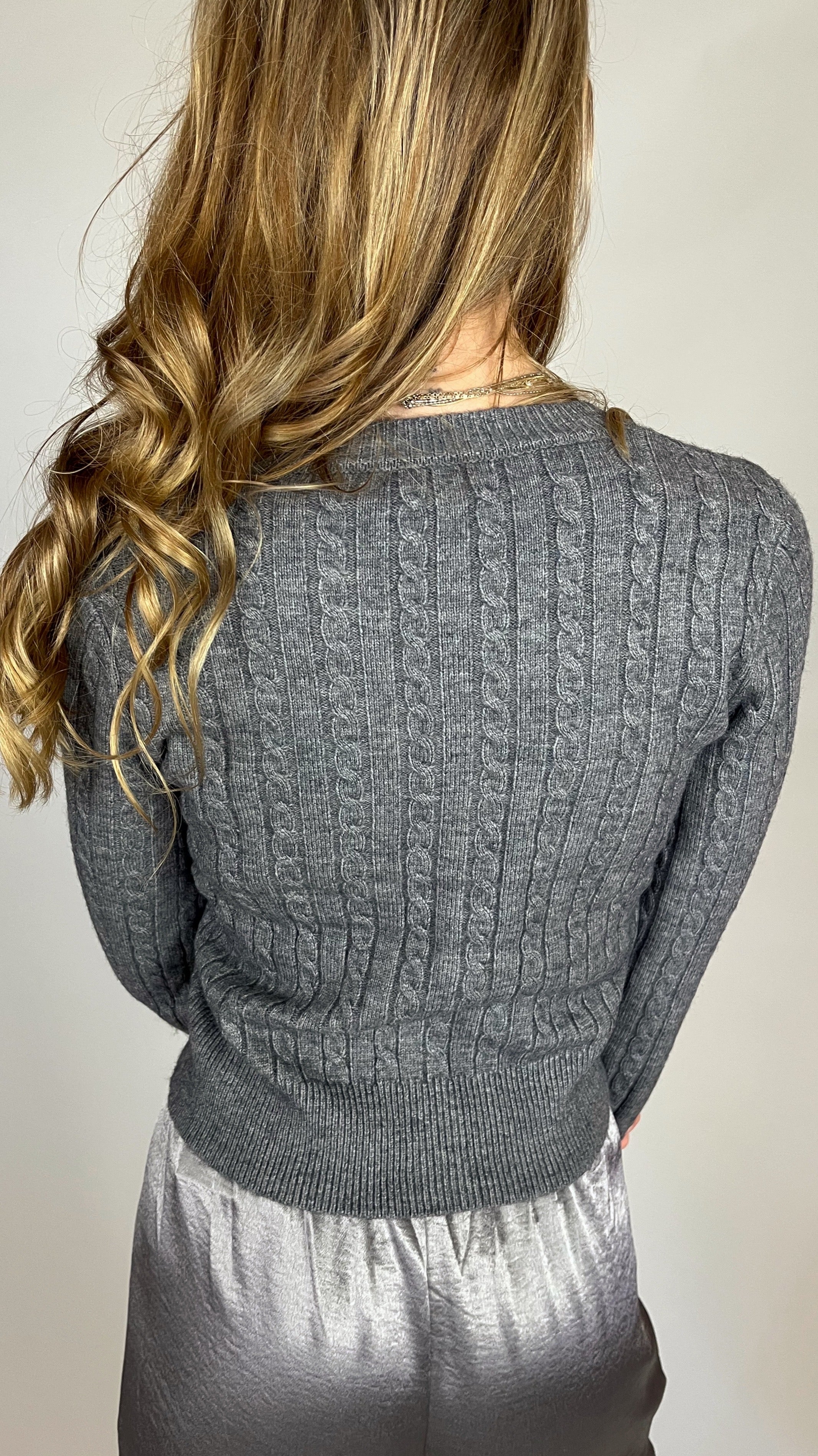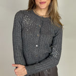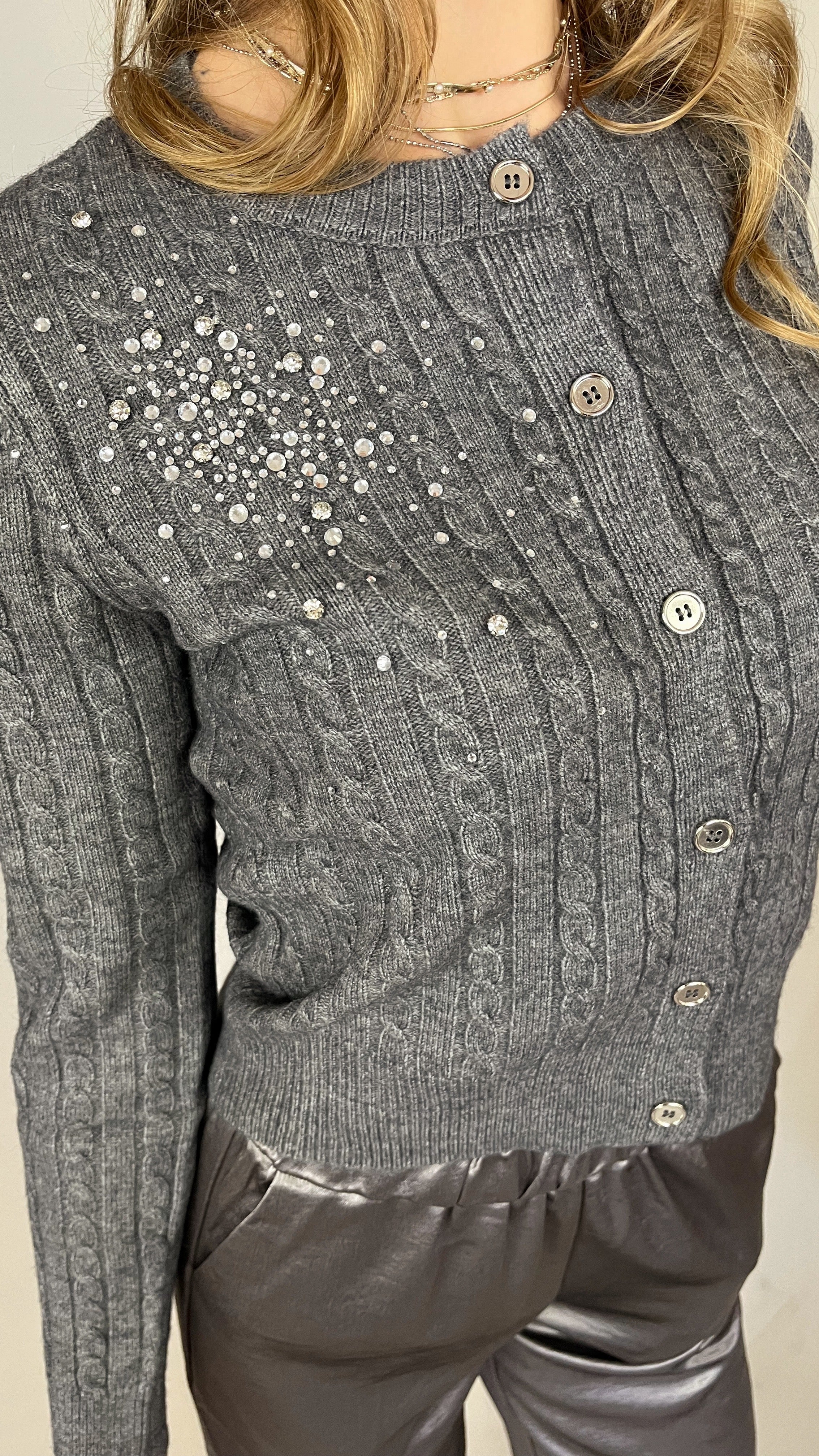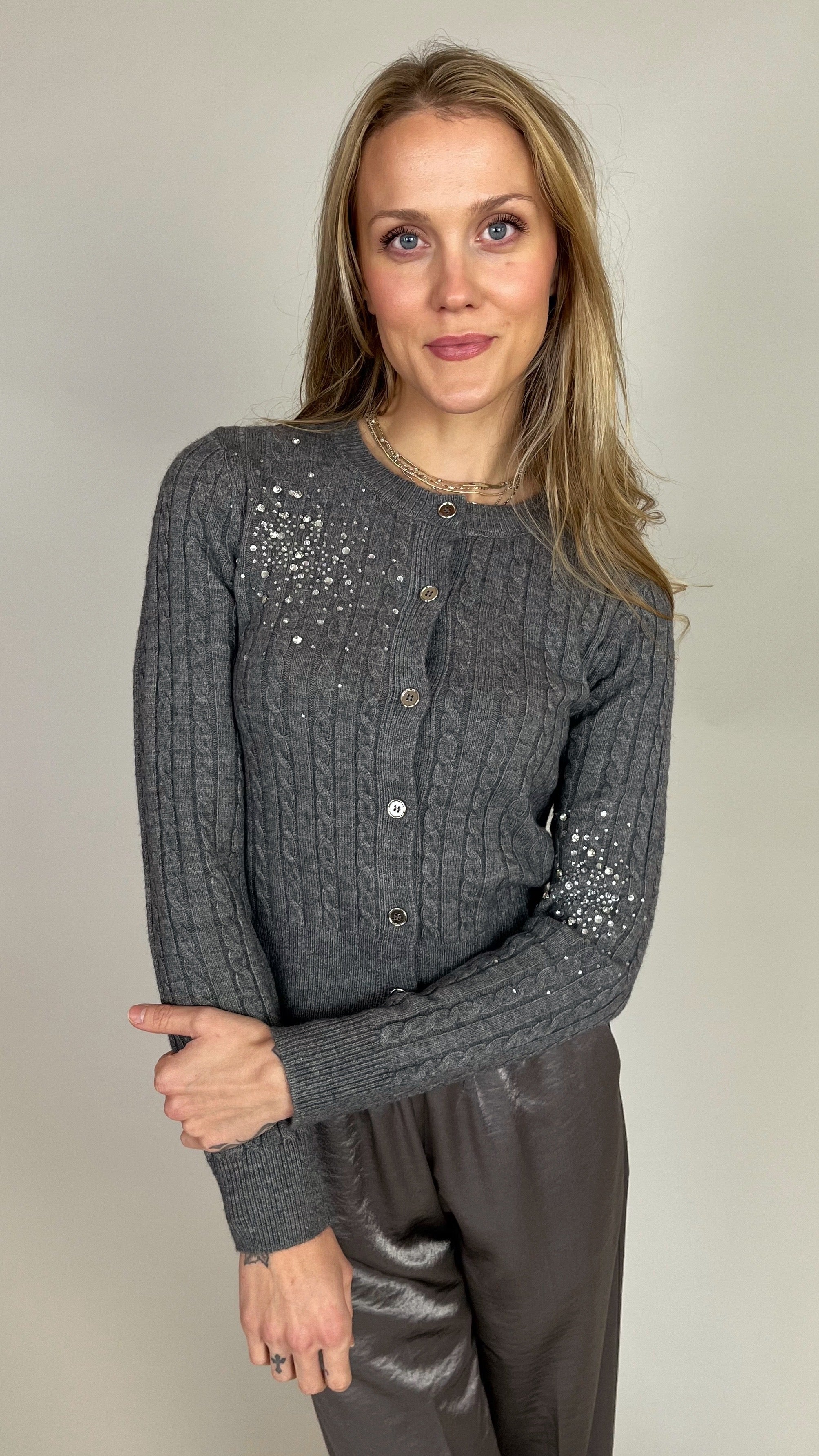 This gray cable-knit cardigan offers a refined blend of warmth and elegance. Crafted from a soft, cozy fabric, it features a classic button-down front, ribbed cuffs and hem, and delicate crystal embellishments across the shoulder and sleeves for a subtle touch of sparkle. Perfect for layering, it pairs effortlessly with both casual and dressy looks.