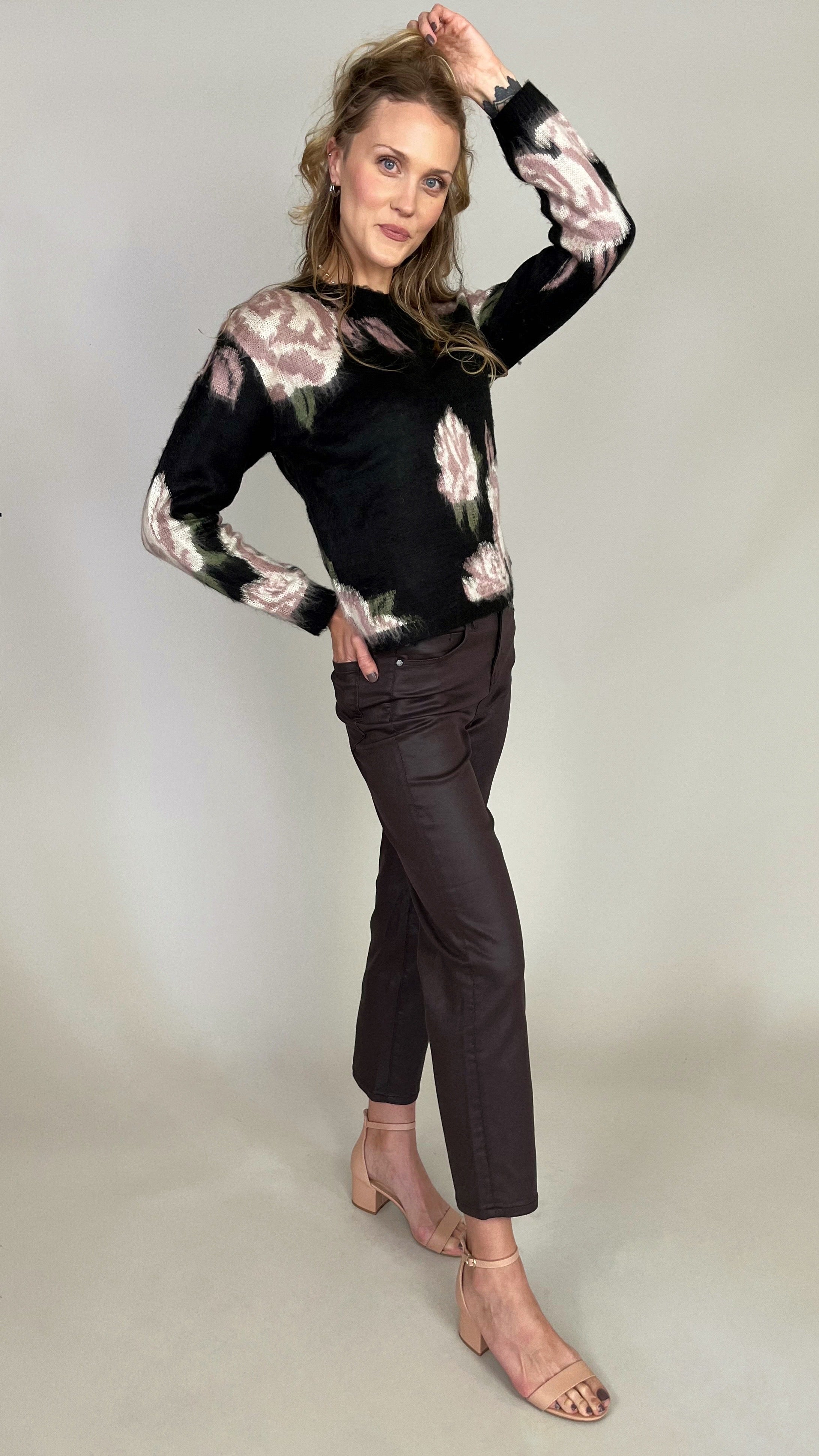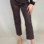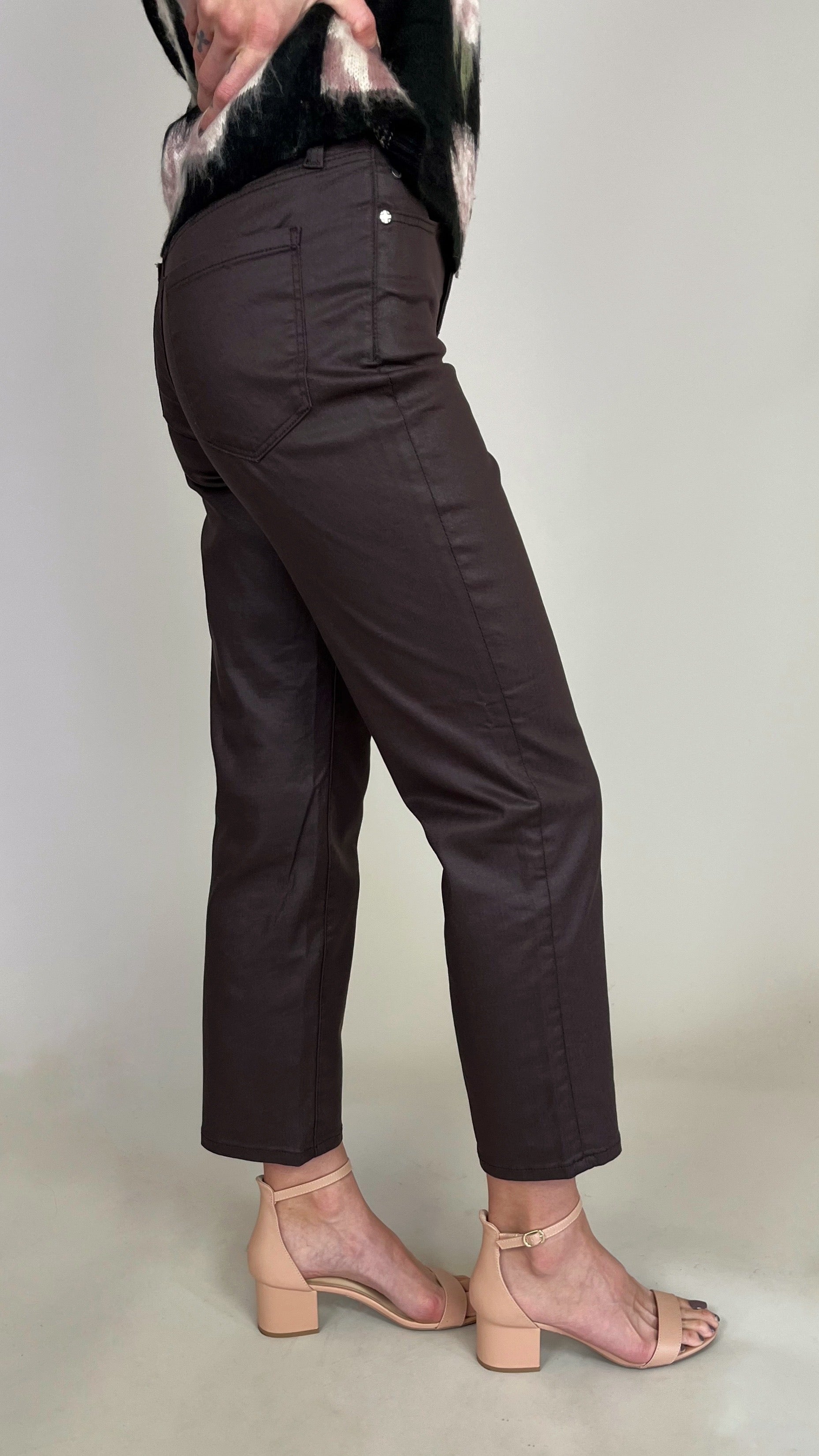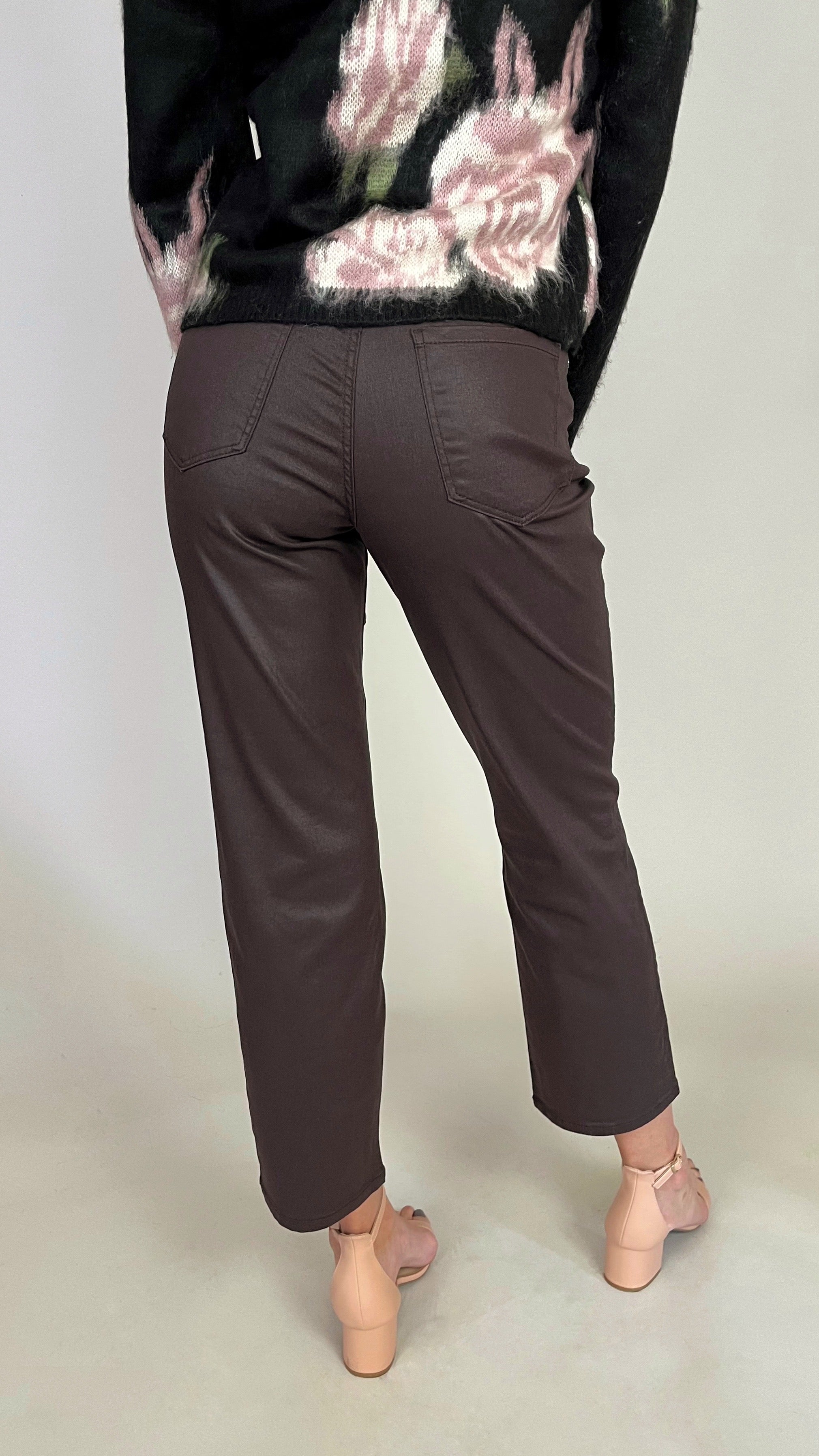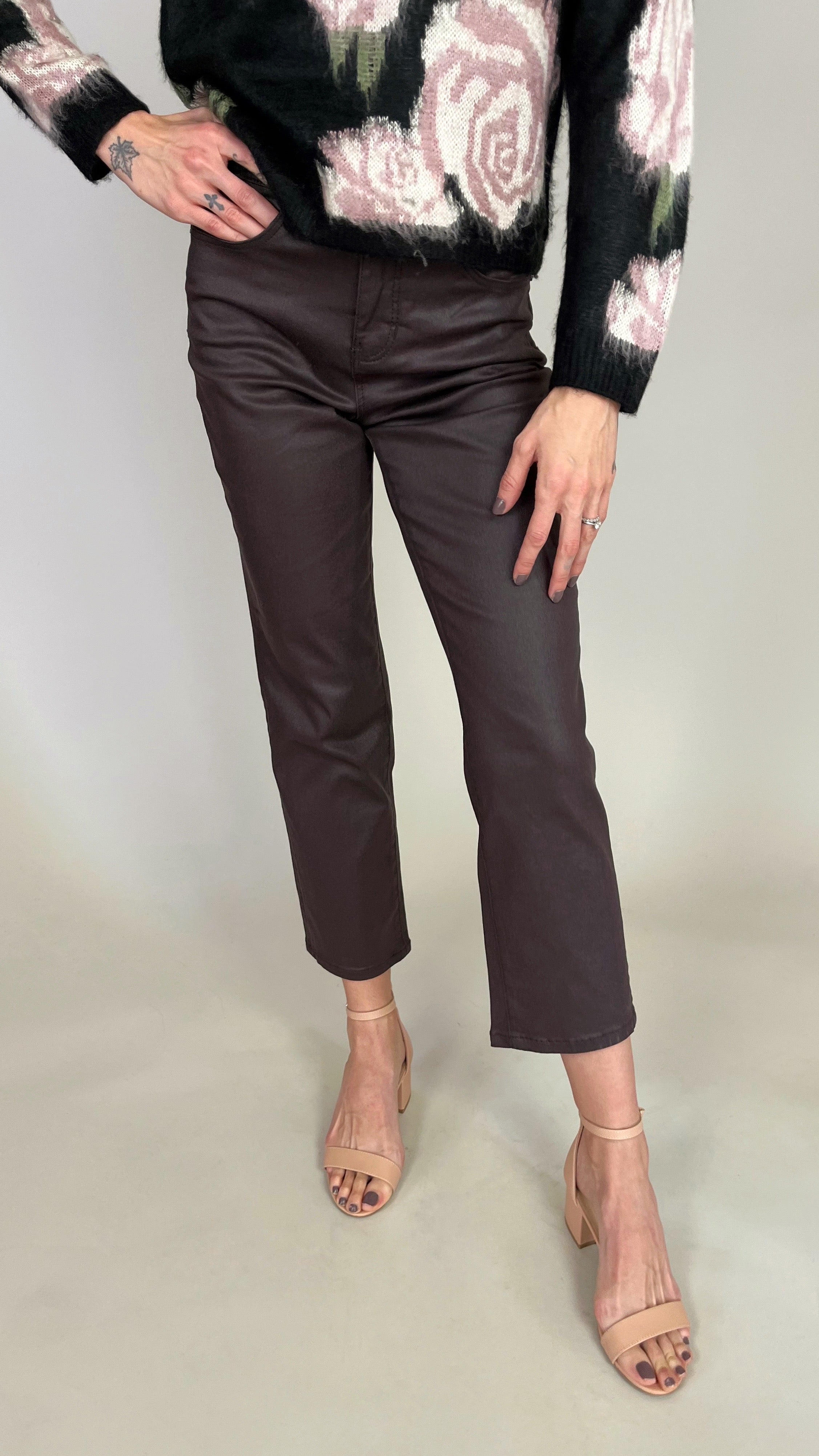 The look of leather, the feel of denim. The Kennedy Jean features a coated finish for a sleek, leather-like effect with the breathability and stretch of classic denim. Cut with a flattering high rise and cropped leg, this rich raisin-toned style adds an elevated edge to any outfit—comfortable enough for day, polished enough for night.