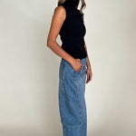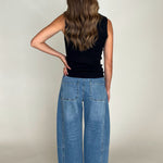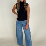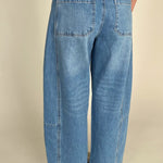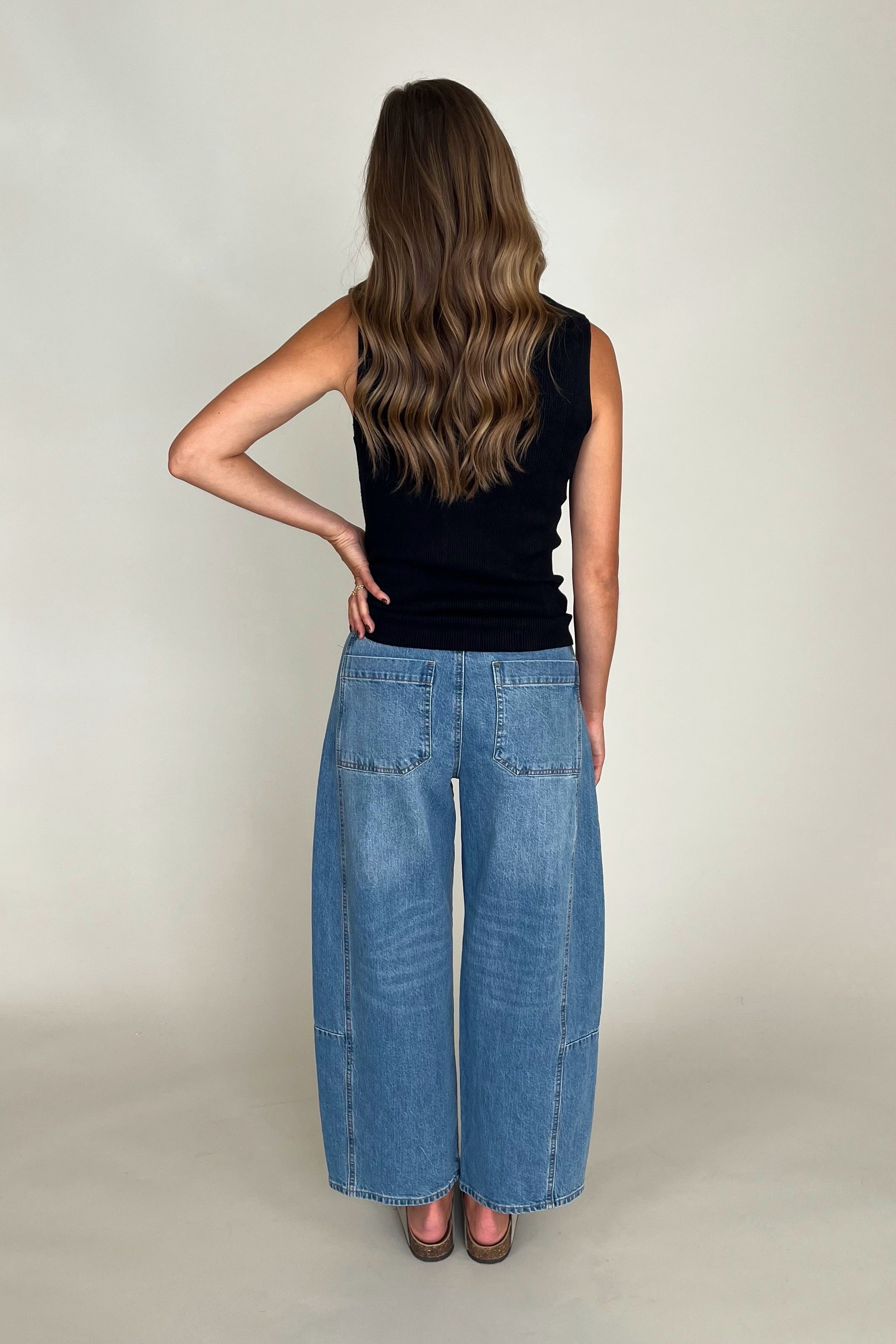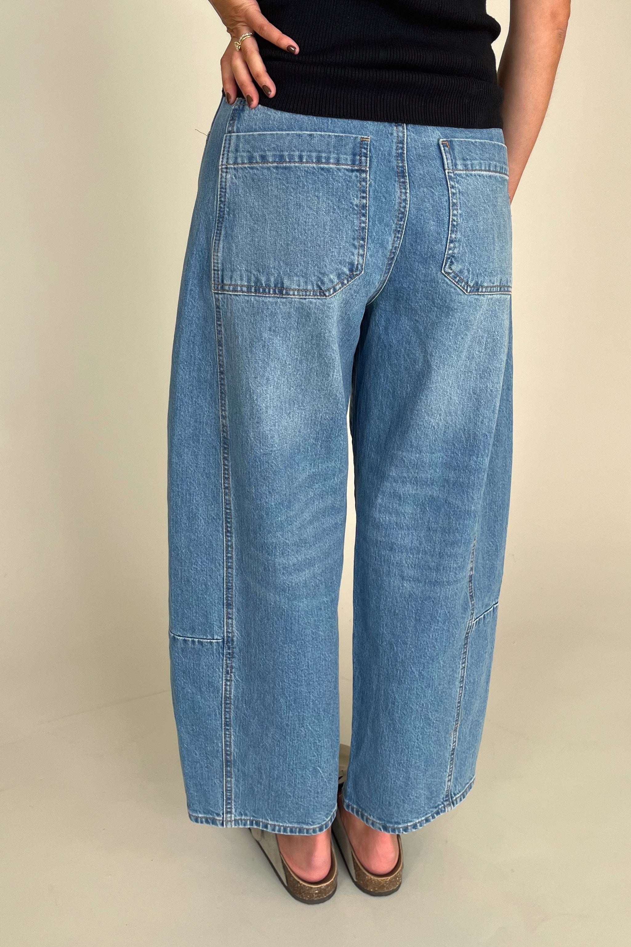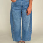 Our best selling jean! Cropped cut barrel jean - curves outward at hips, hangs loose through leg with slight taper at ankle.