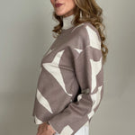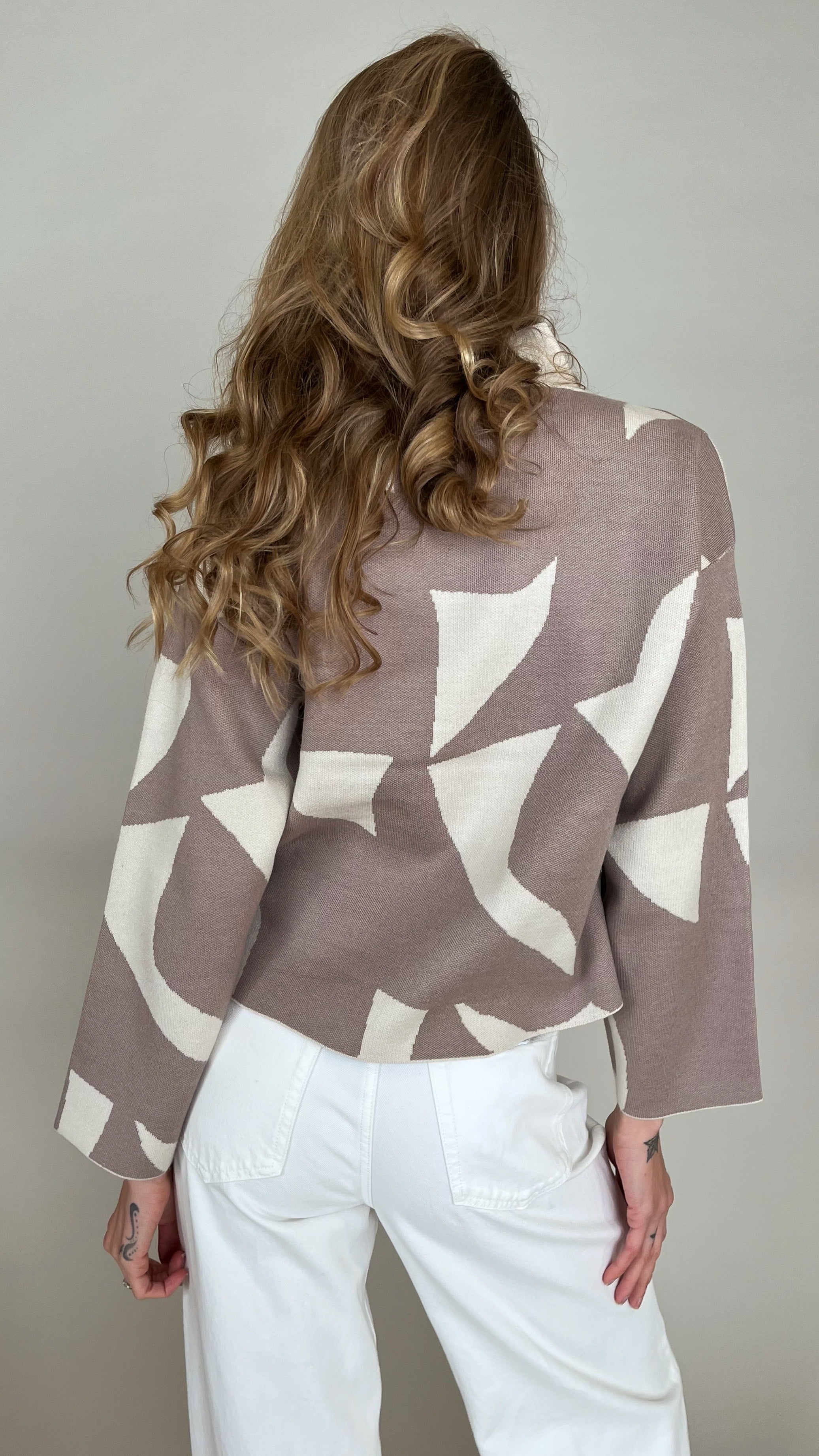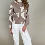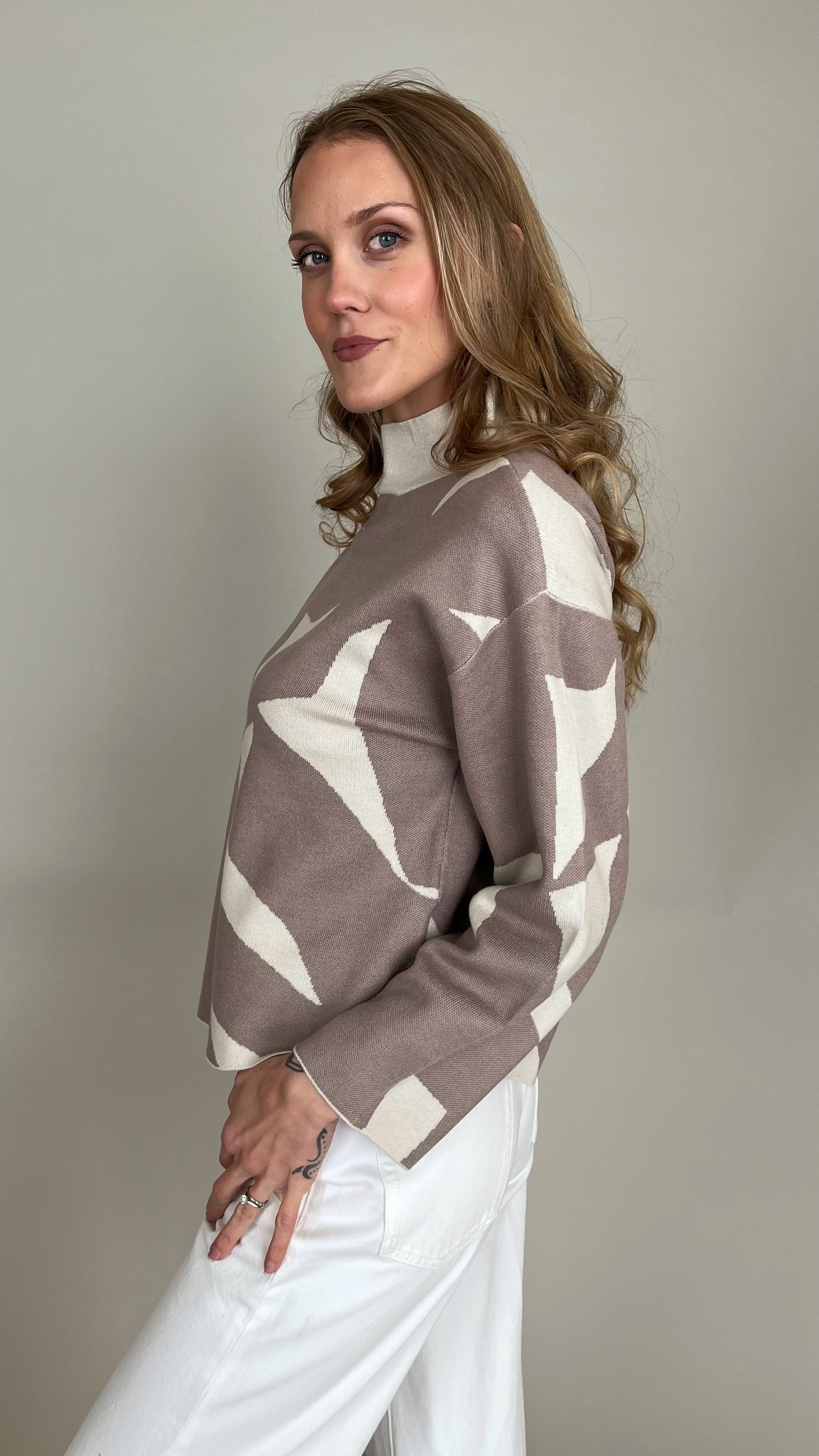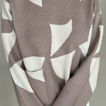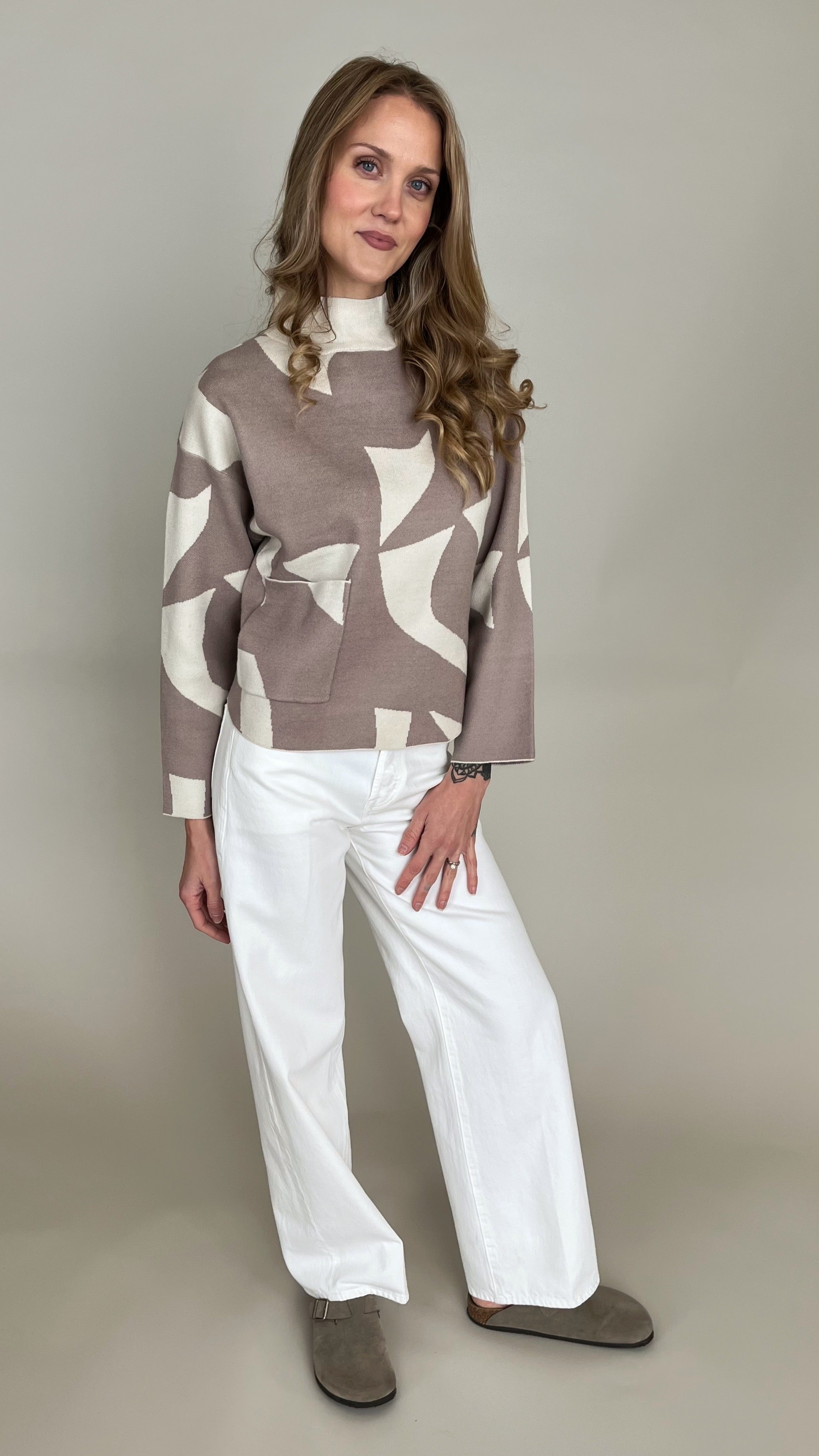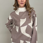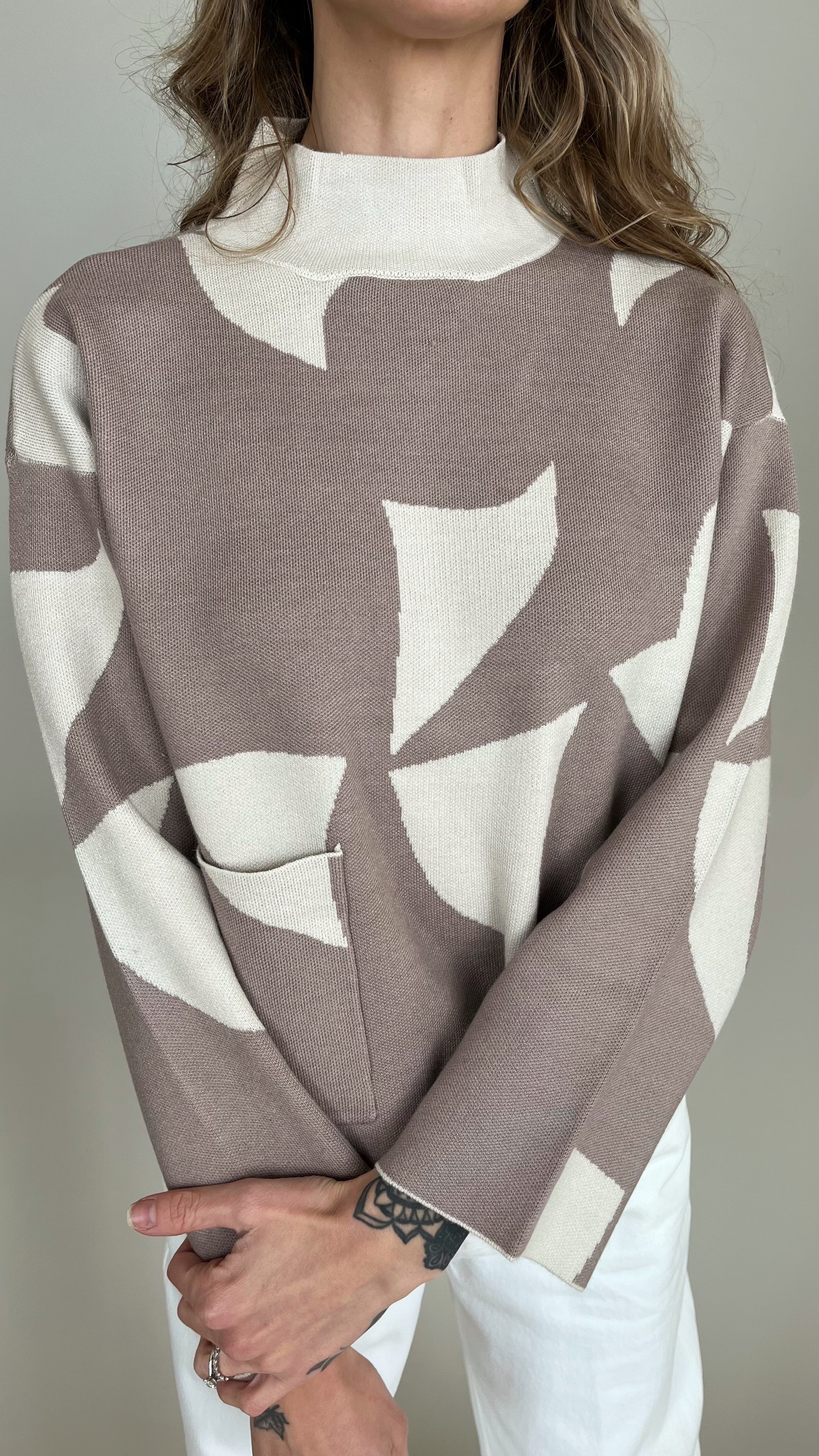 Make a statement in this oversized sweater, featuring a striking abstract print for a bold, modern edge. The mock neckline and long sleeves provide cozy coverage, while the front pocket adds a practical touch. A relaxed, oversized fit completes the look with laid-back sophistication.