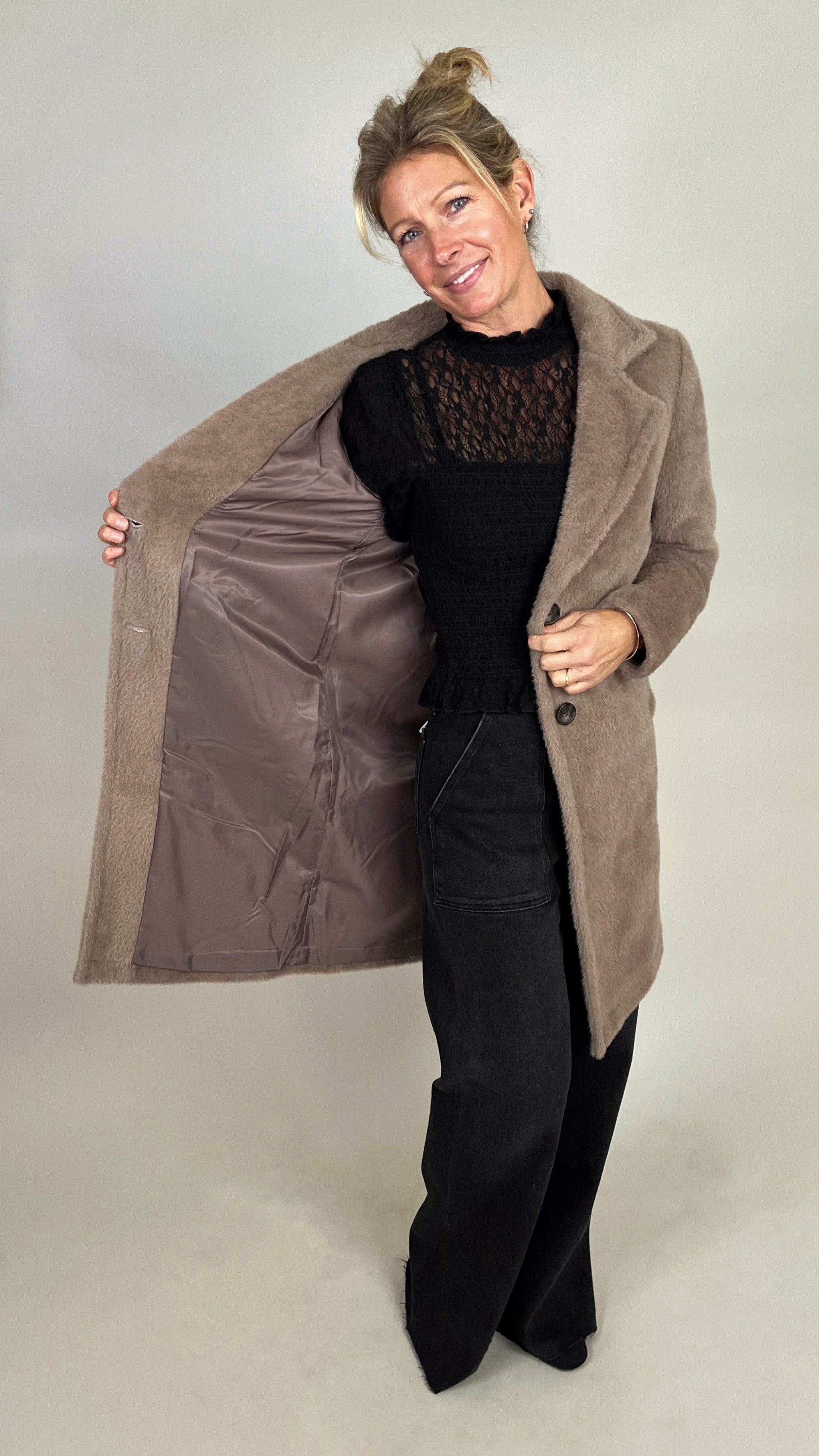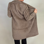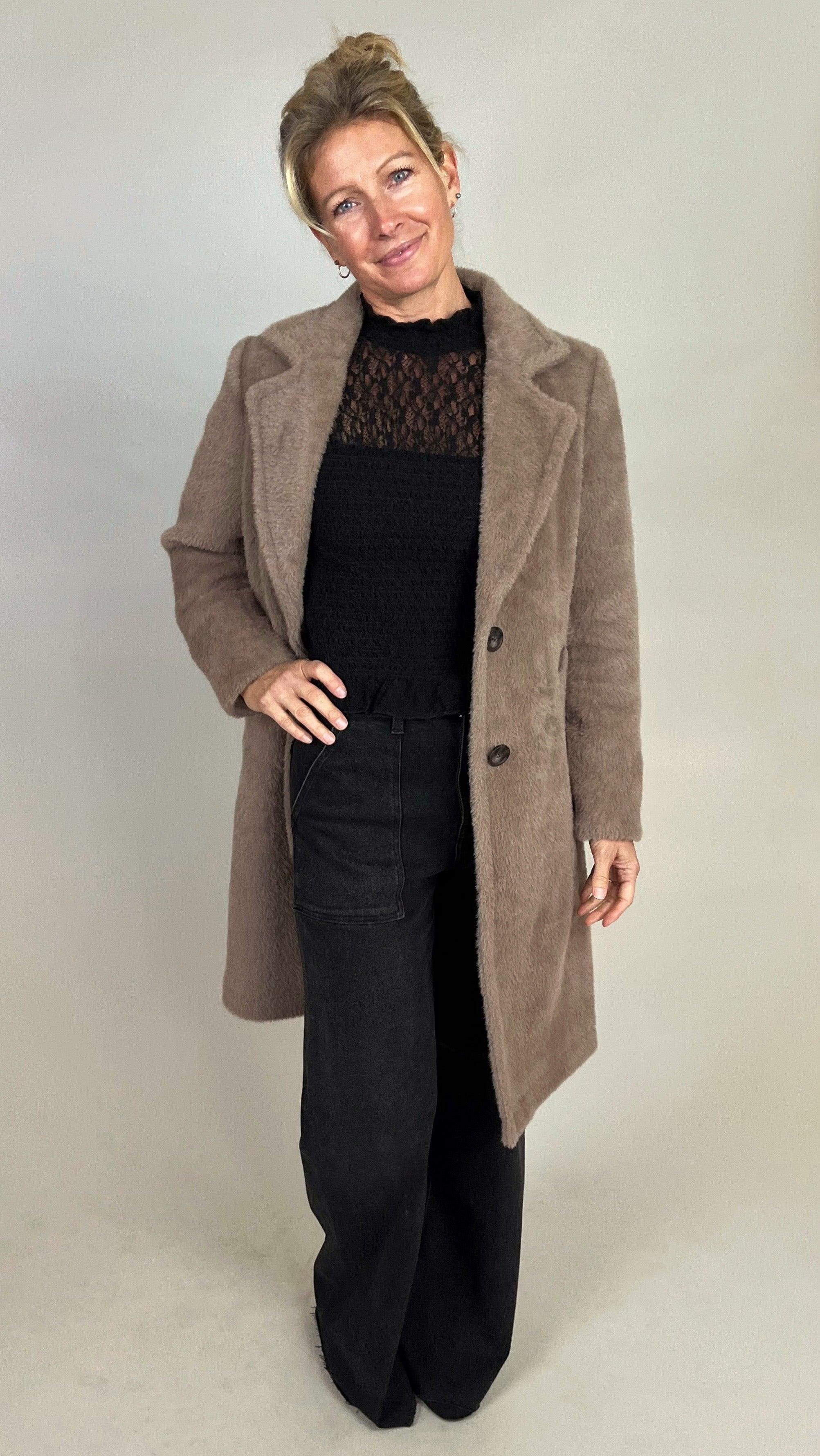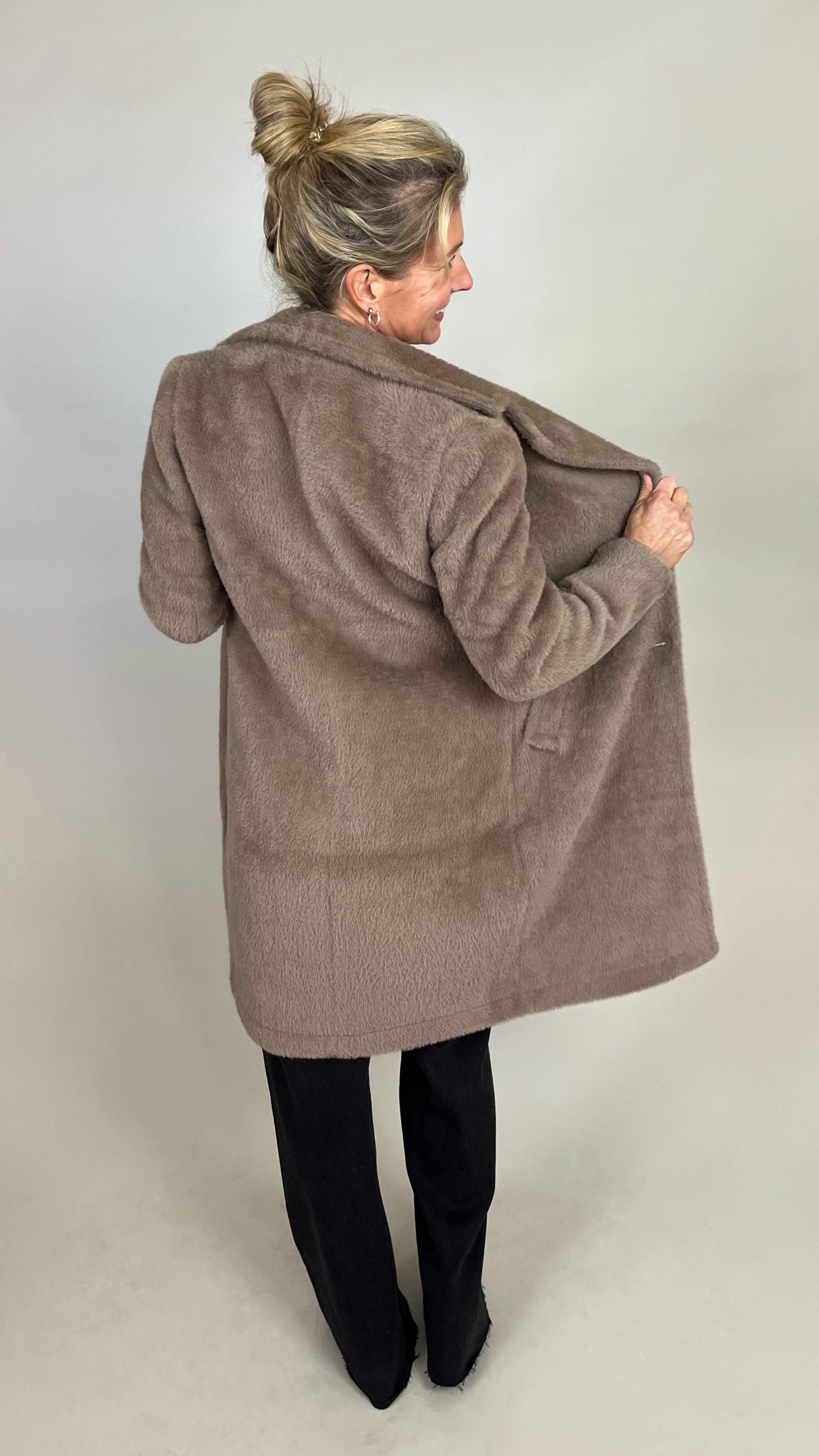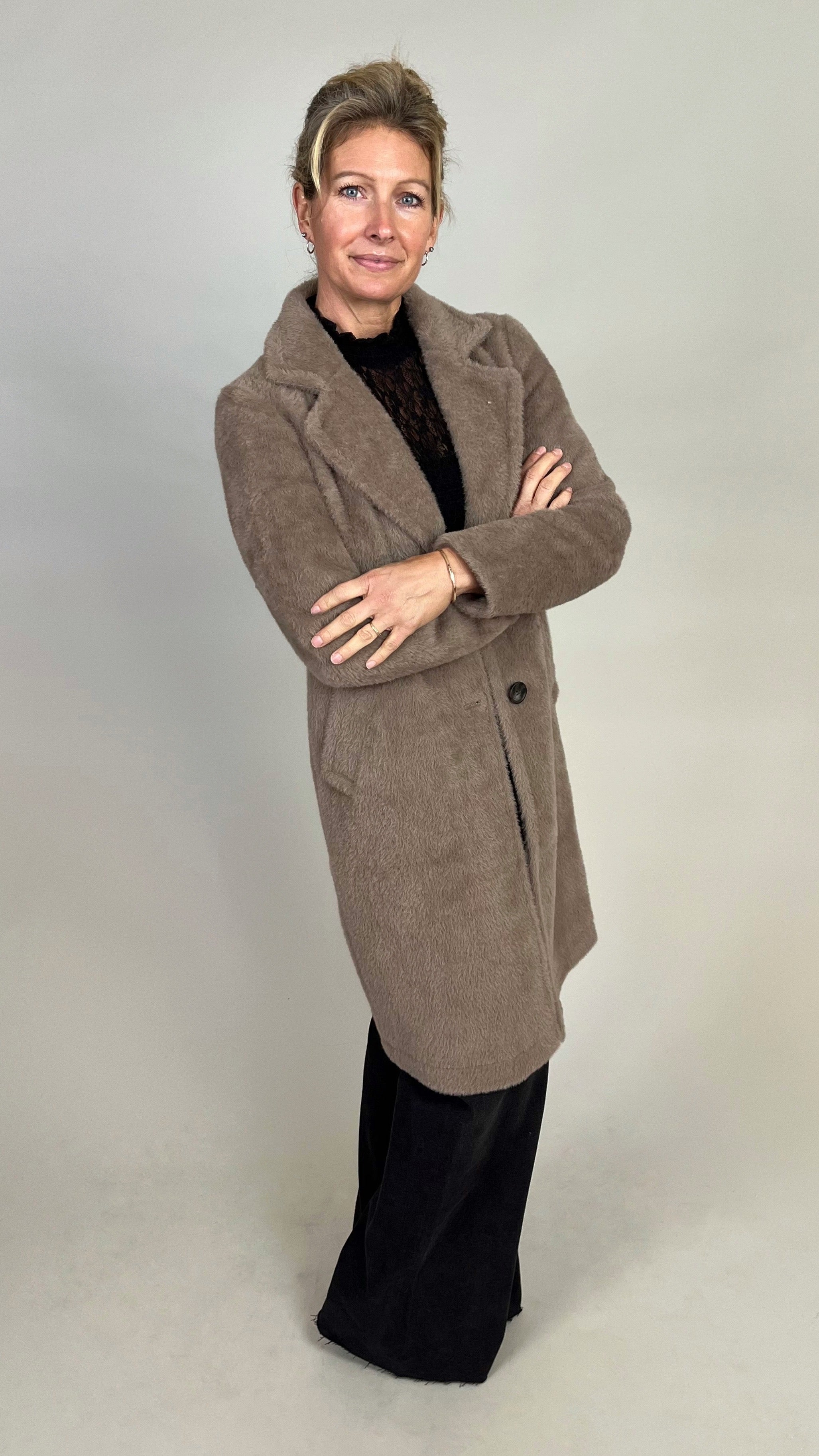 Wrap yourself in warmth and style with this longline coat, made from soft teddy faux fur for ultimate coziness. The buttoned front offers a secure fit, while the classic notched lapels elevate your look with timeless sophistication. Functional pockets keep your hands warm or provide space for your essentials.
