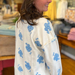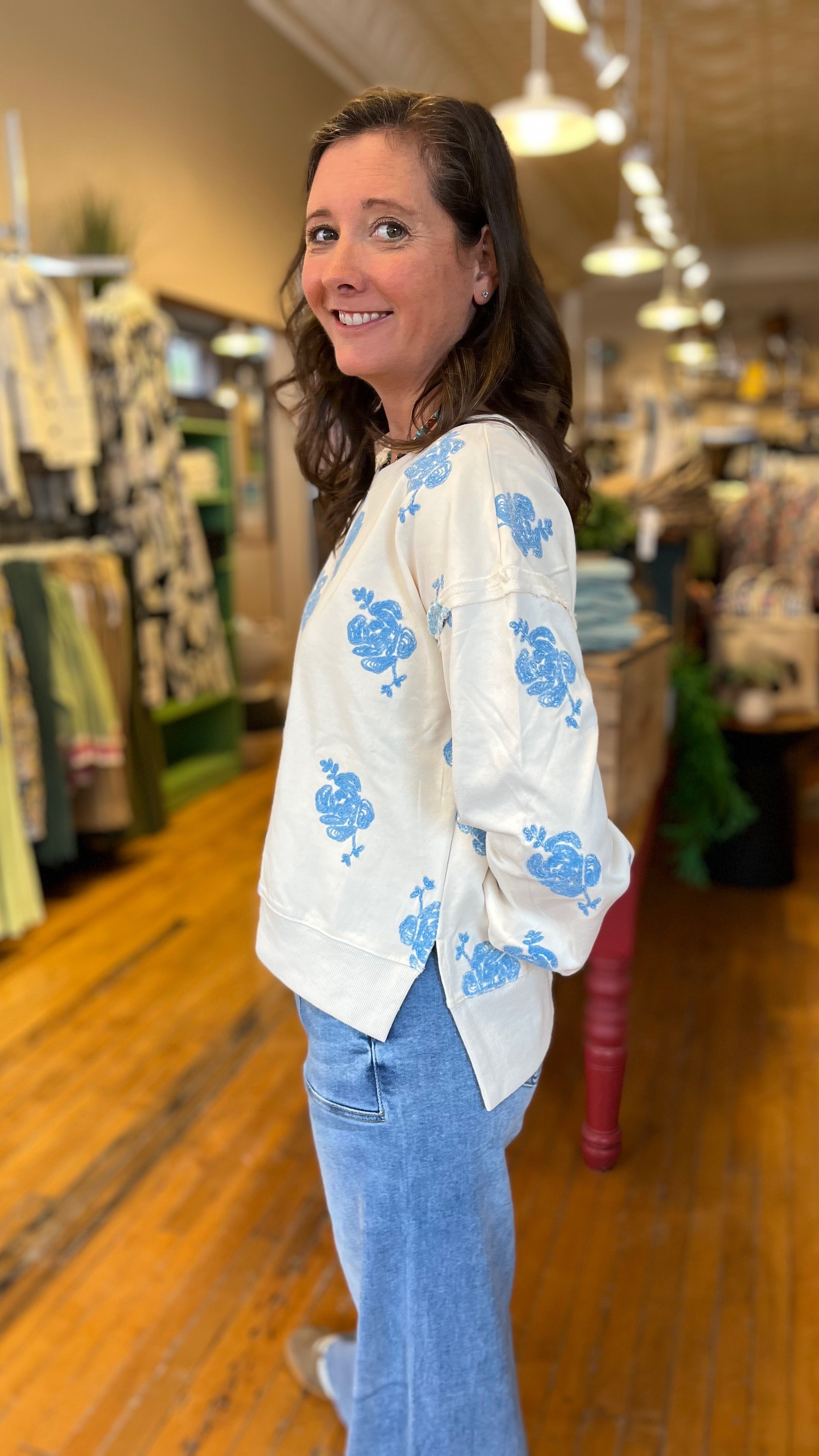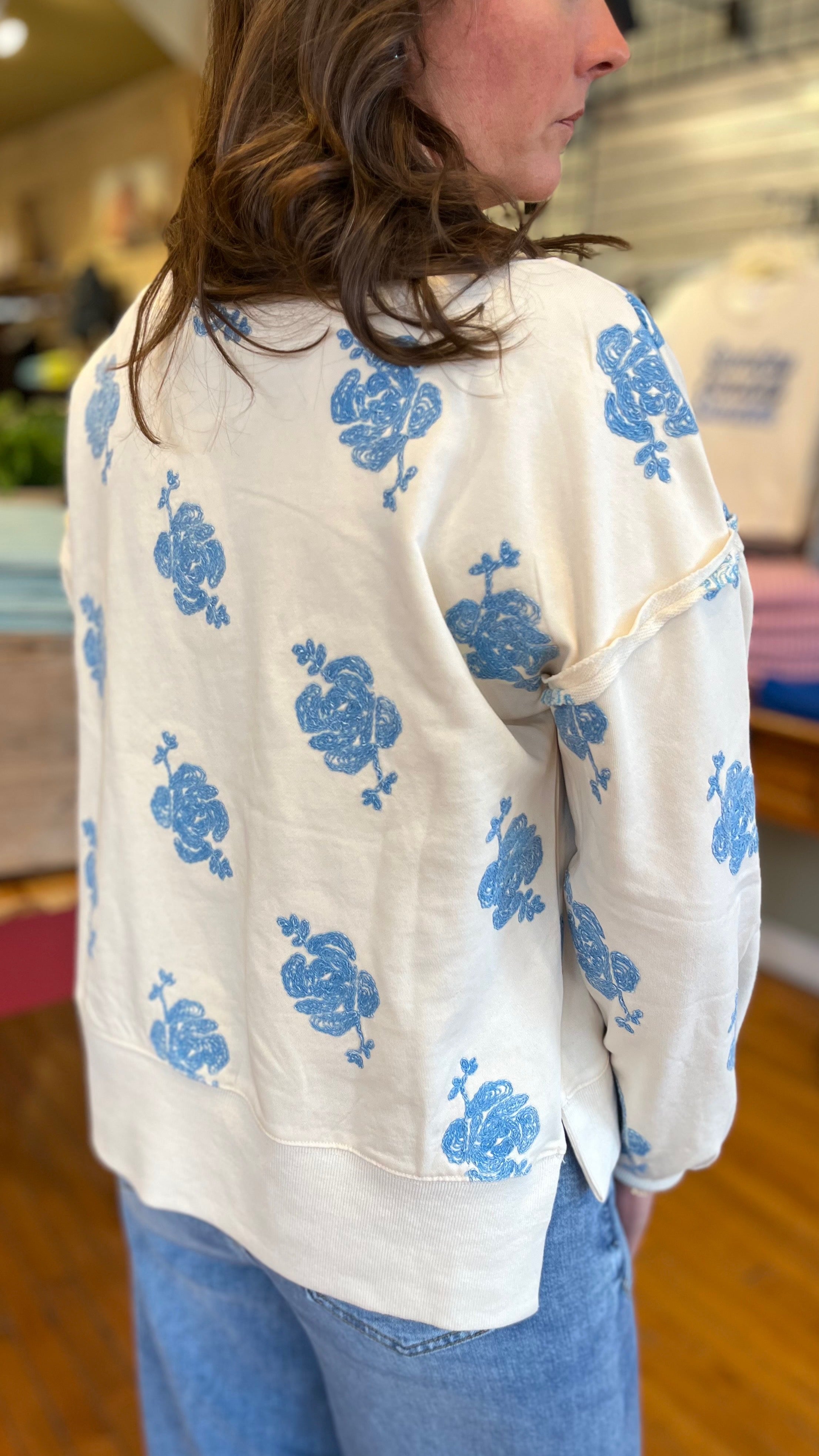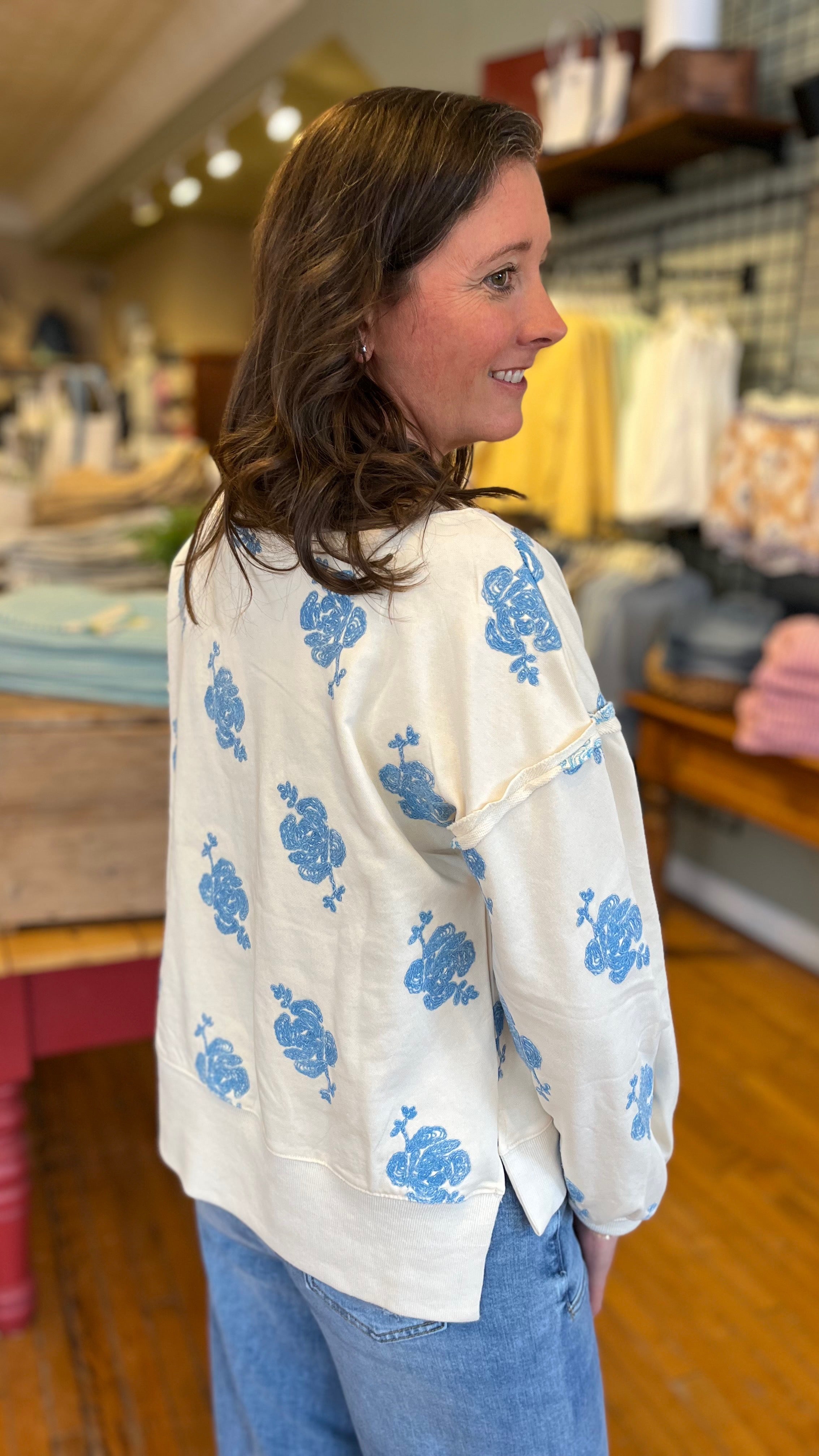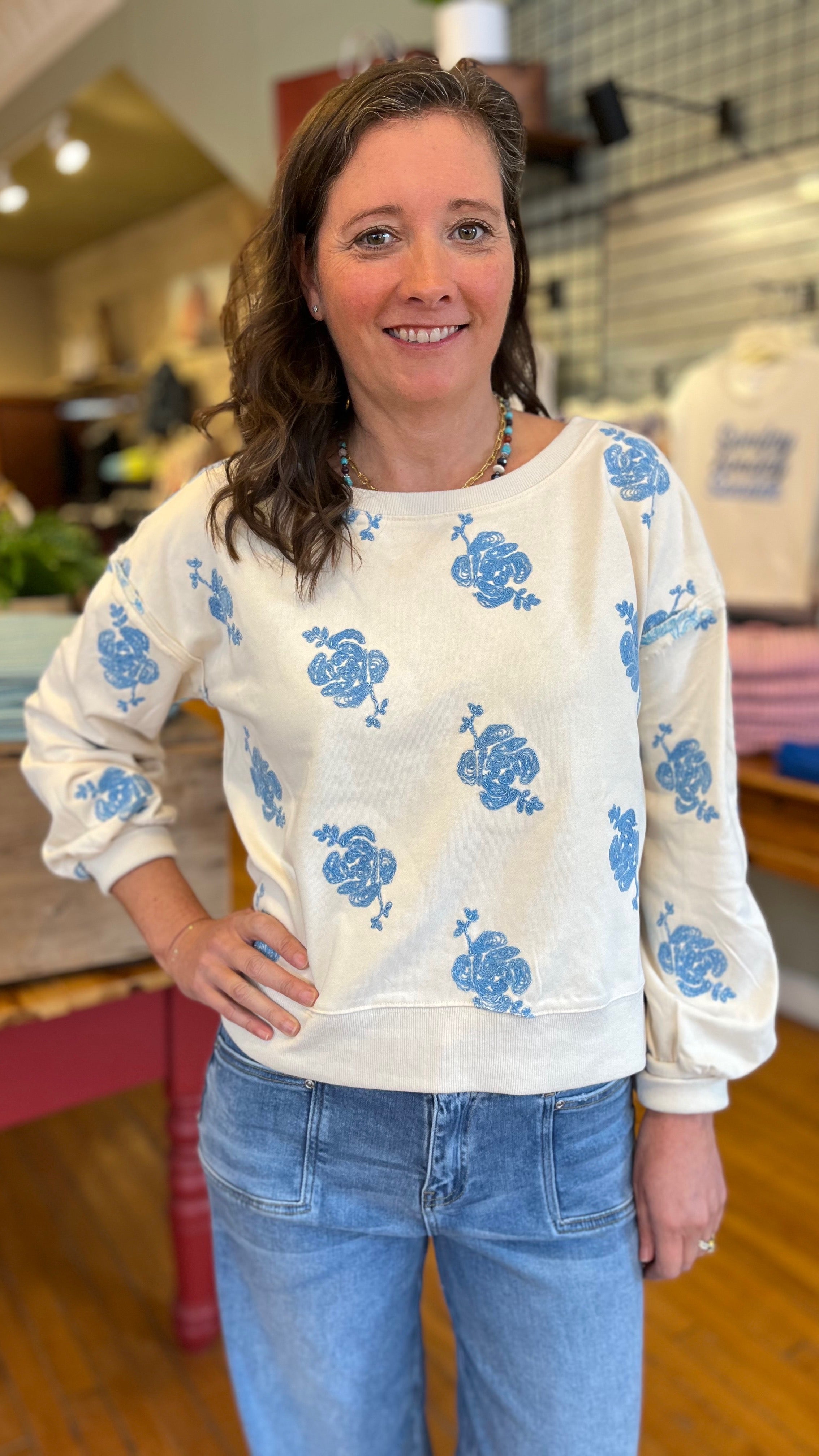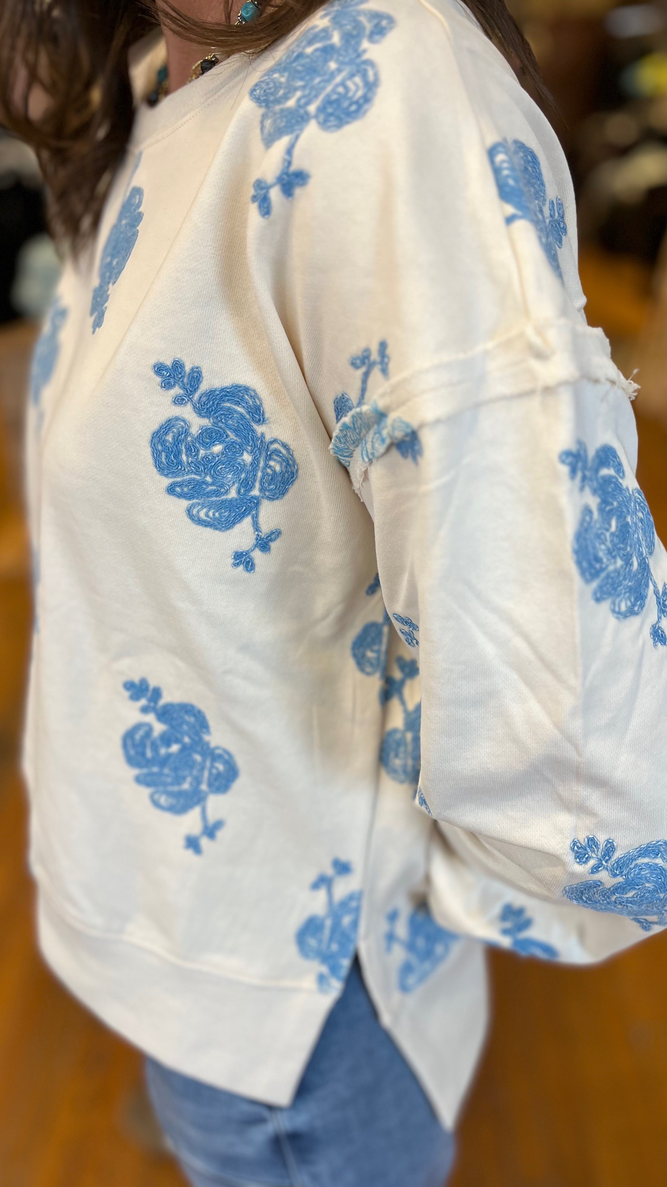 Your new go-to for cozy days with a little extra personality. This ultra-soft sweatshirt features a relaxed, easy fit that’s perfect for layering or lounging, while its embroidered rose details give it that “where’d you get that?” charm. Made from a French terry this sweatshirt has a split high-low hem, dropped shoulder with puffed sleeves and relaxed crew neckline. Effortlessly cute with denim it’s the kind of comfy staple that still feels fun and styled.