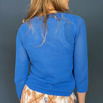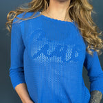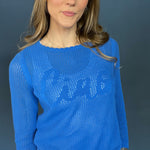 Lightweight and airy, this 3/4-length open-stitch sweater features “Ciao” woven across the chest and scalloped edges for a playful, European-inspired touch. Perfect for layering over dresses or pairing with breezy pants on sun-soaked days.