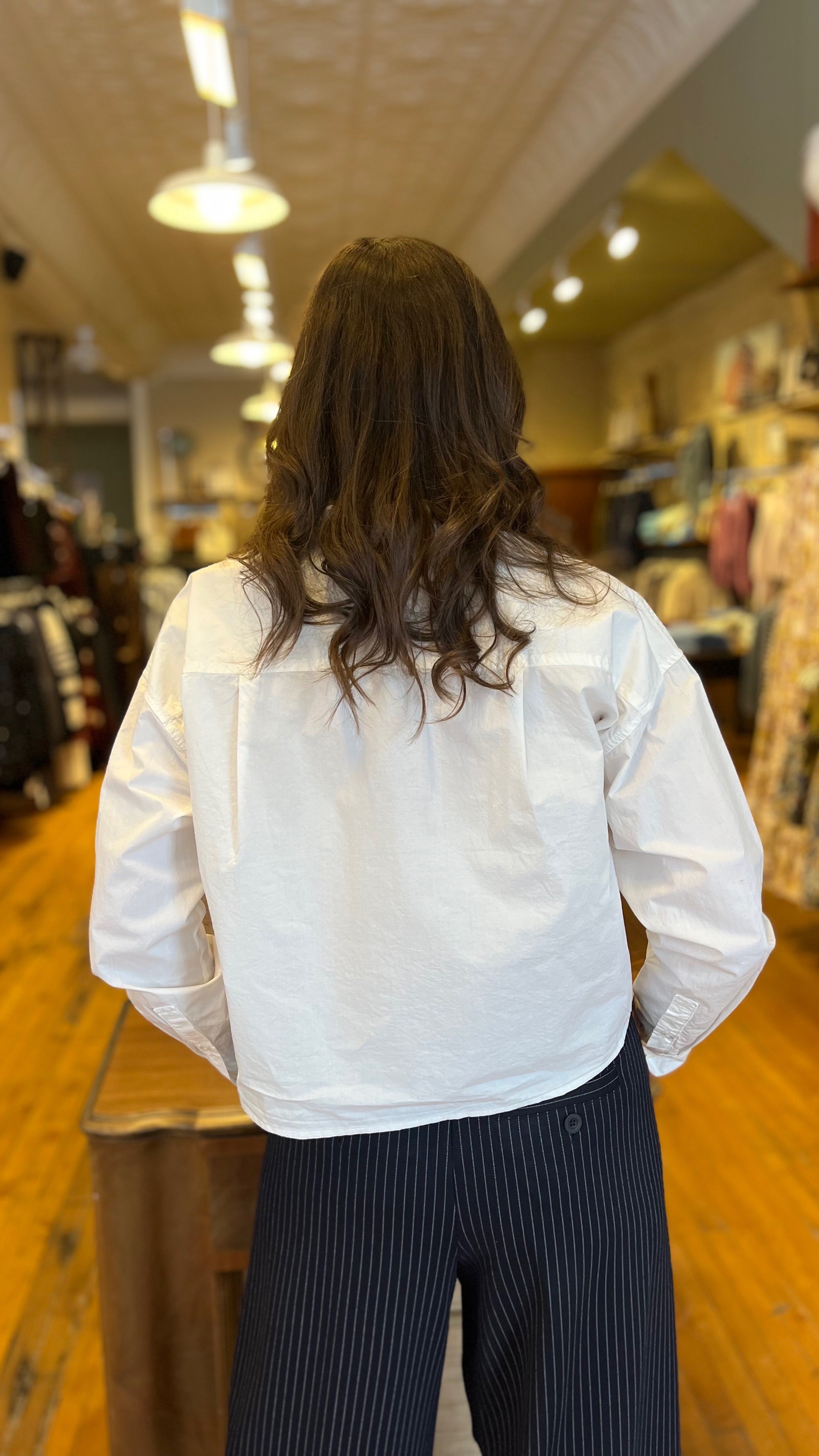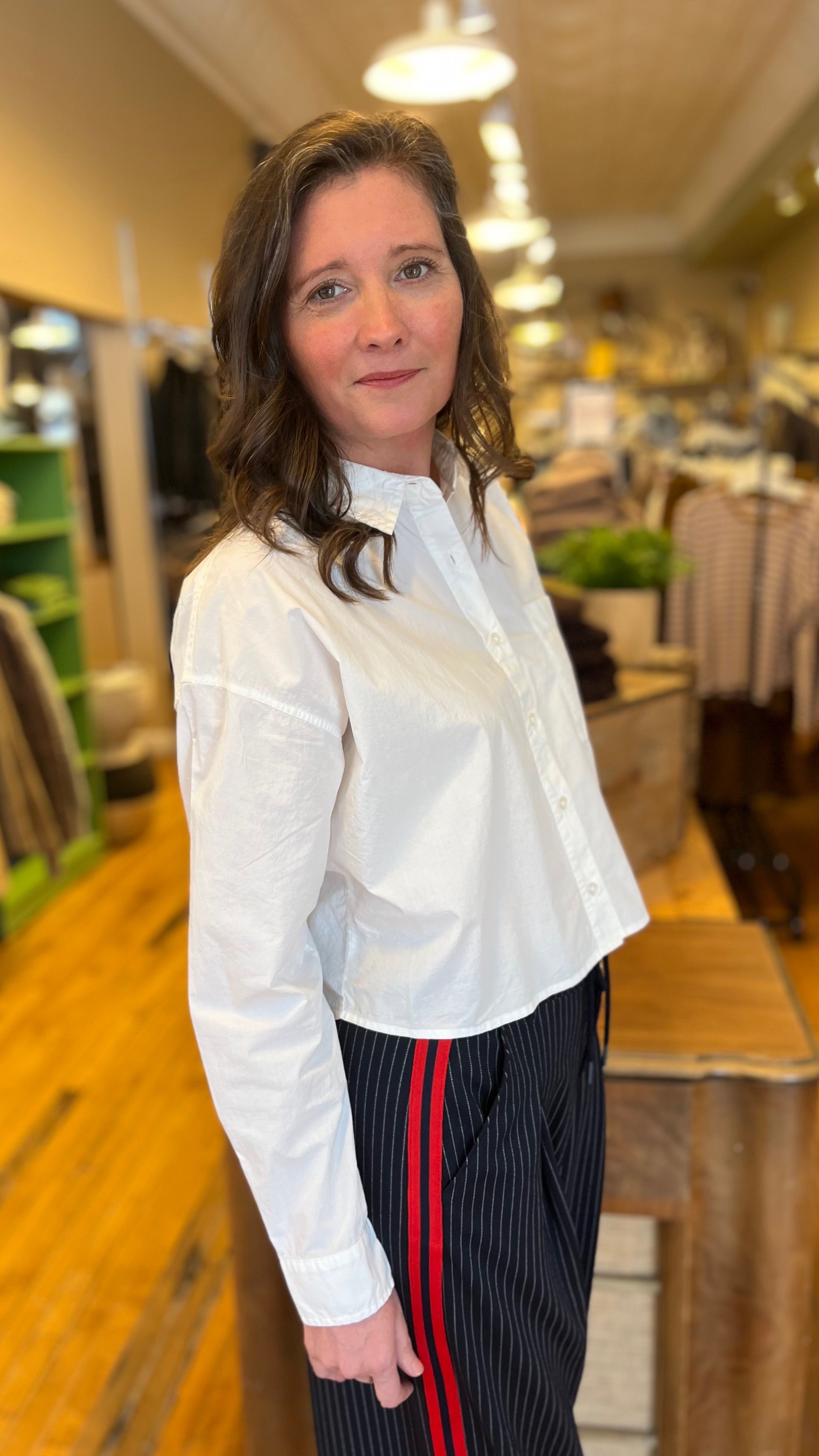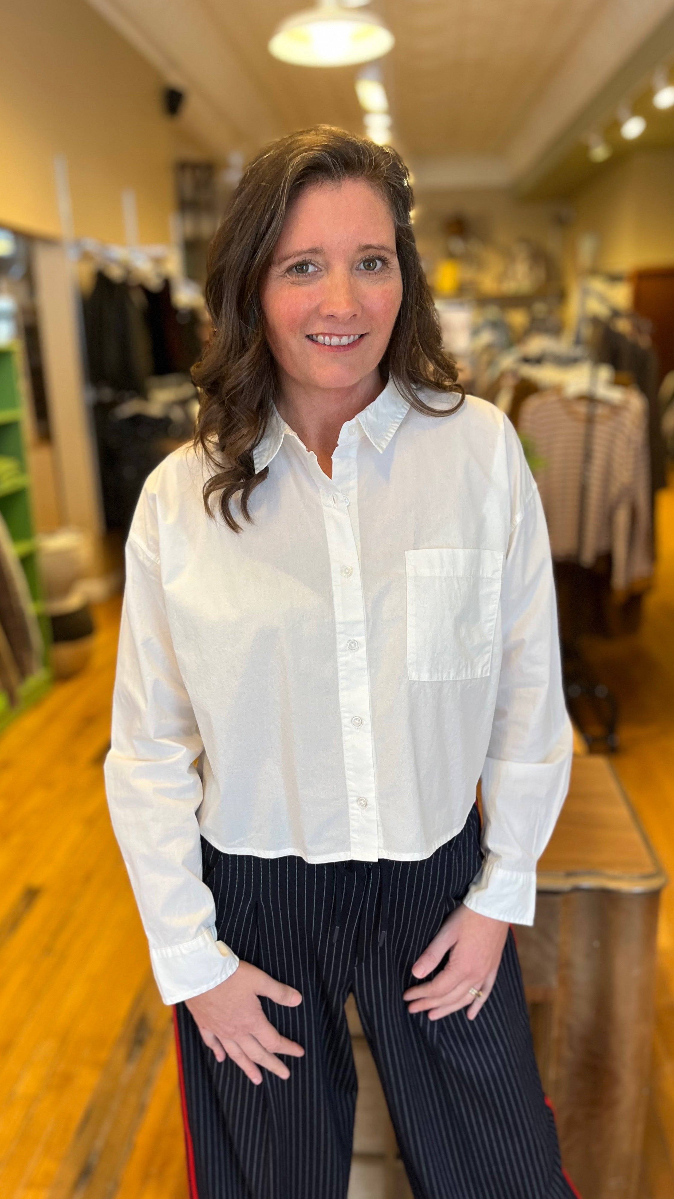 Crisp and lightweight, this cotton poplin button-up instantly elevates any outfit. Designed with a meet-and-greet fit and straight hemline, it feels modern and easy to style with denim, skirts, or tailored pants for a refined everyday look.