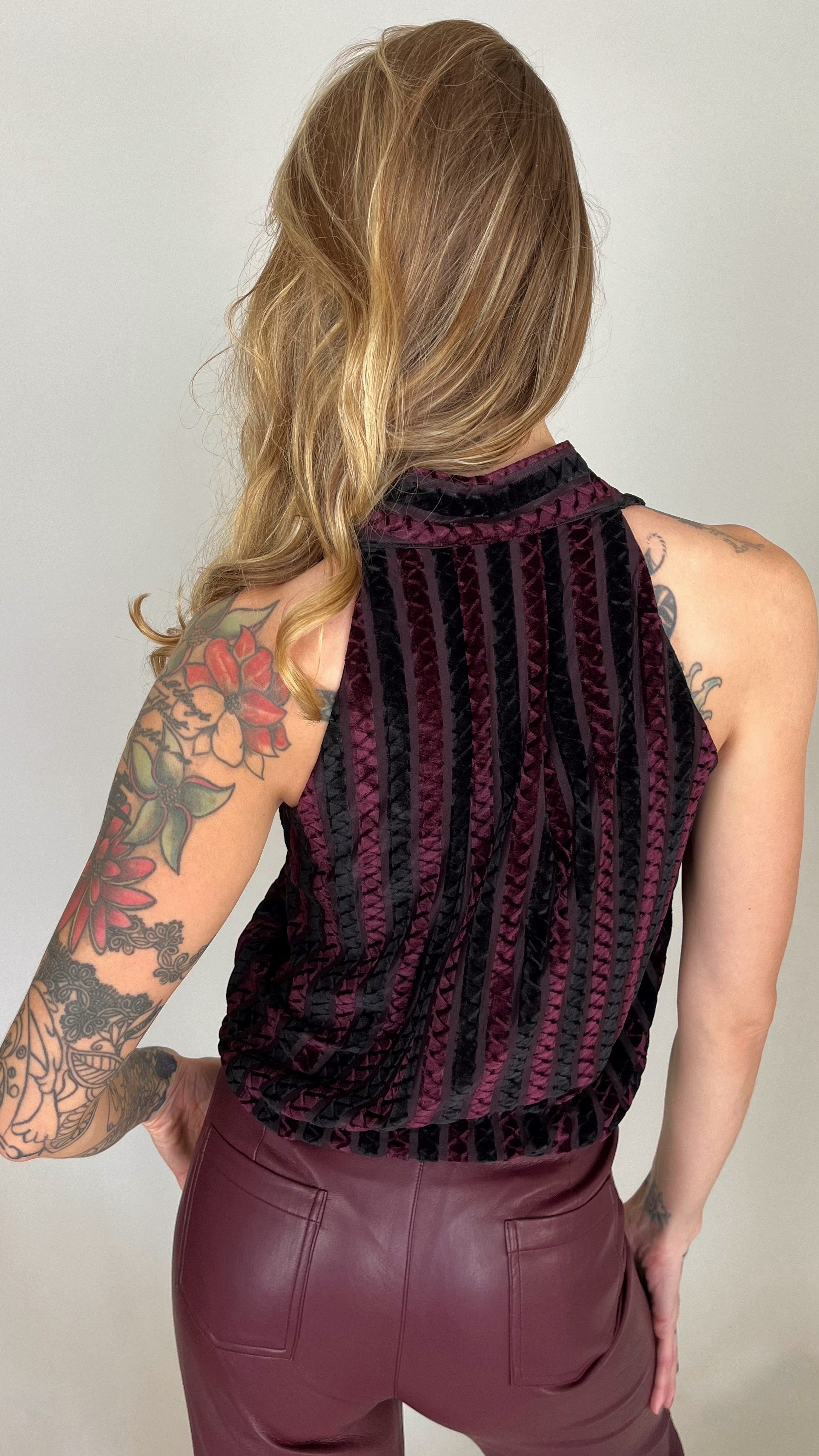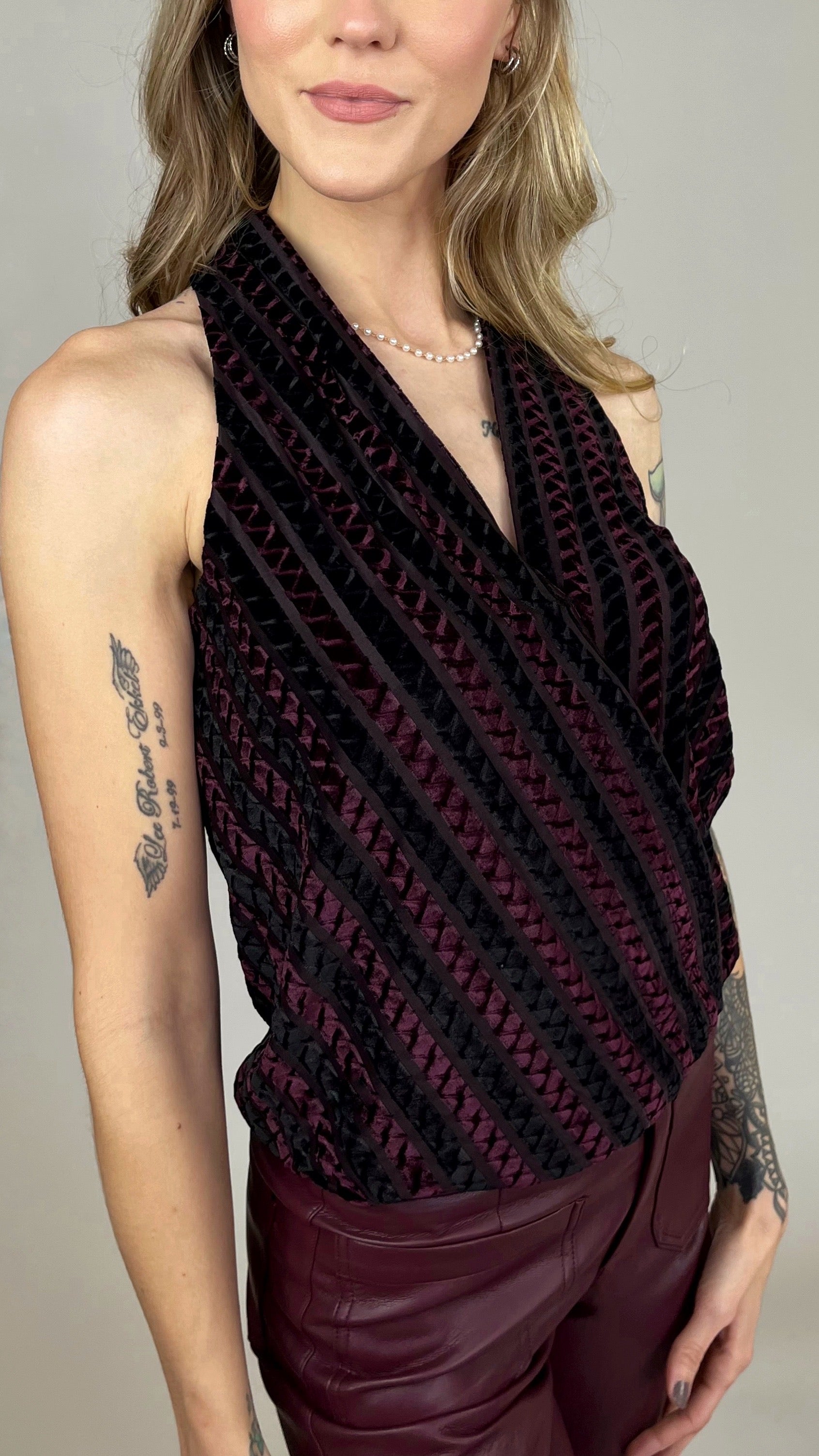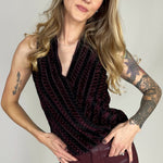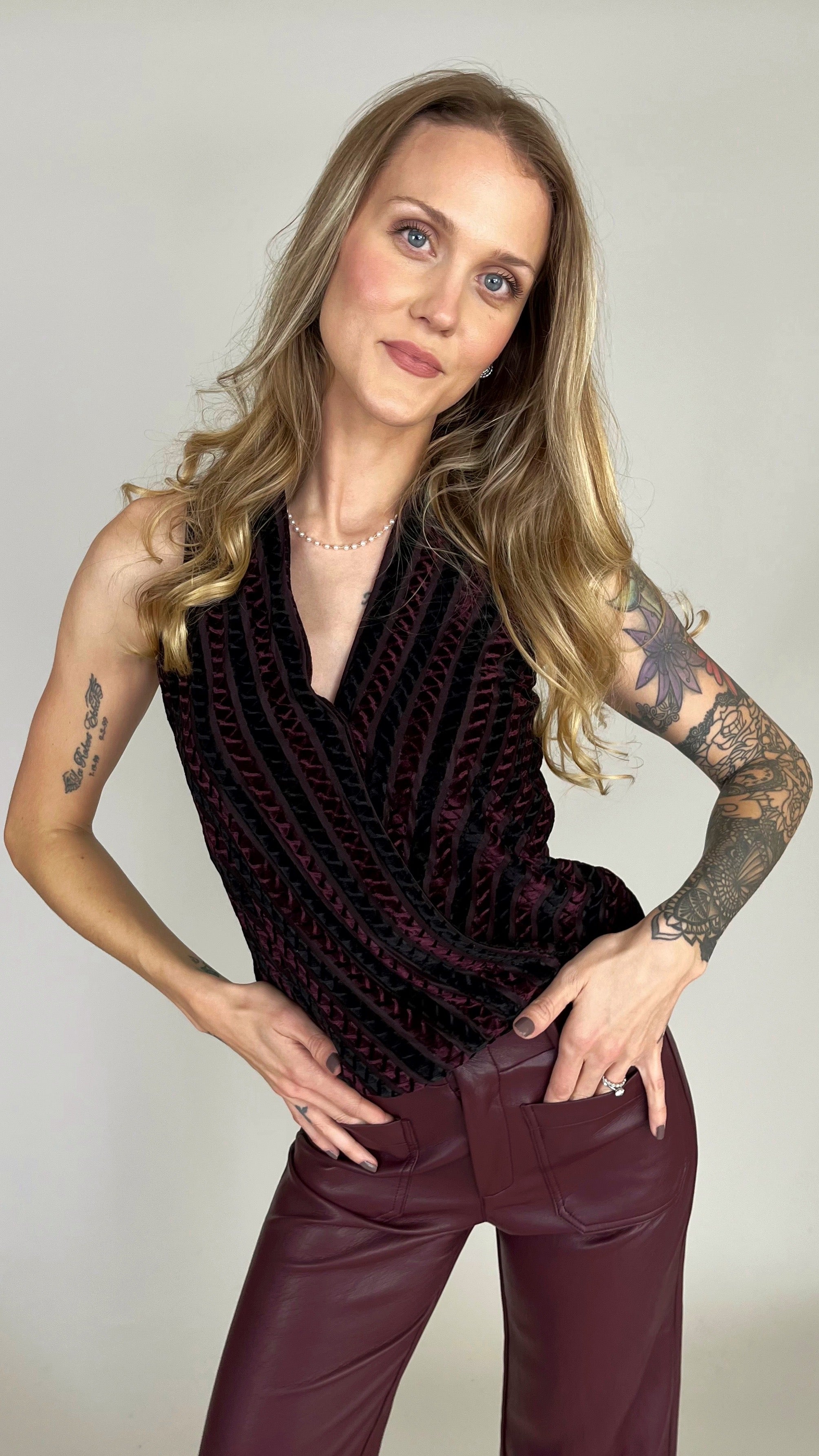 Soft, striking, and effortlessly chic. This sleeveless crossover knit top features a rich velvet texture with bold black and burgundy stripes for a look that’s both modern and luxurious. The crossover front creates a flattering drape, perfect for tucking into high-rise denim or pairing with tailored pieces. Sleek enough for night, comfortable enough for all-day wear.