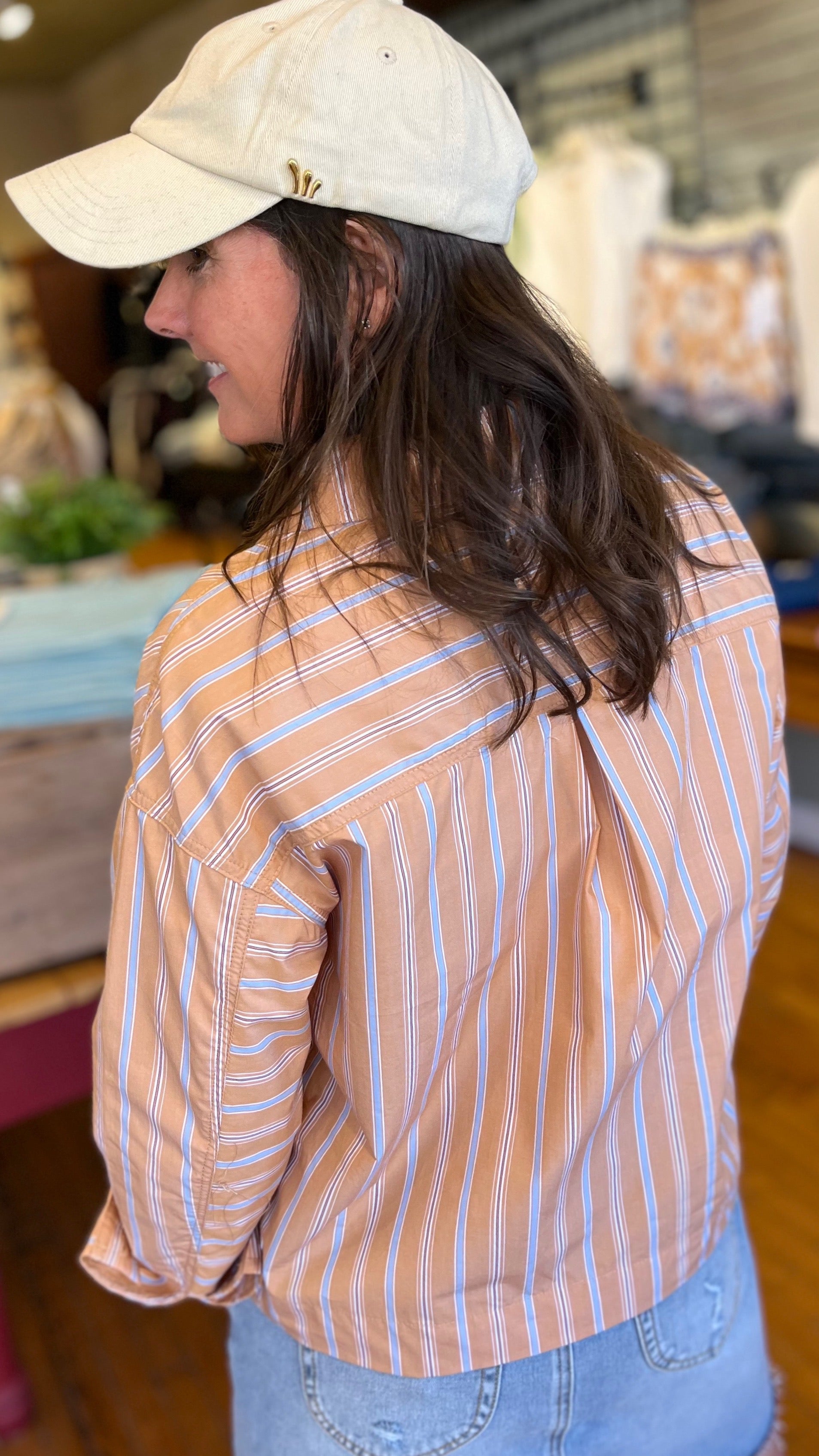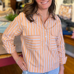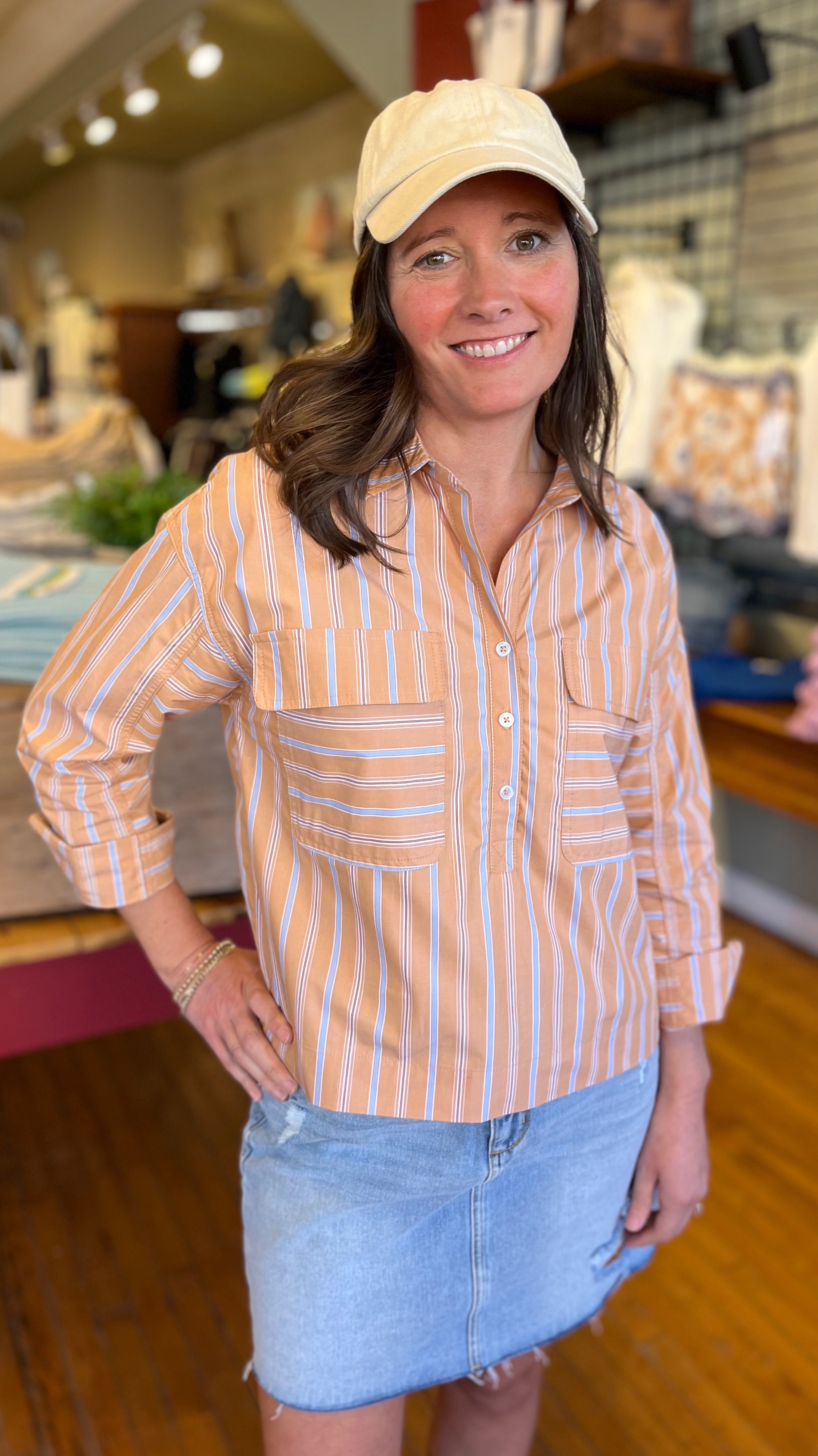 This popover drop shoulder blouse is crafted in yarn dye poplin for light structure and a crisp, modern feel. The drop shoulders and oversized pockets offer a contemporary twist, while the relaxed fit and button neckline ensure comfort and easy wear. Ideal for layering or as a standout on its own.