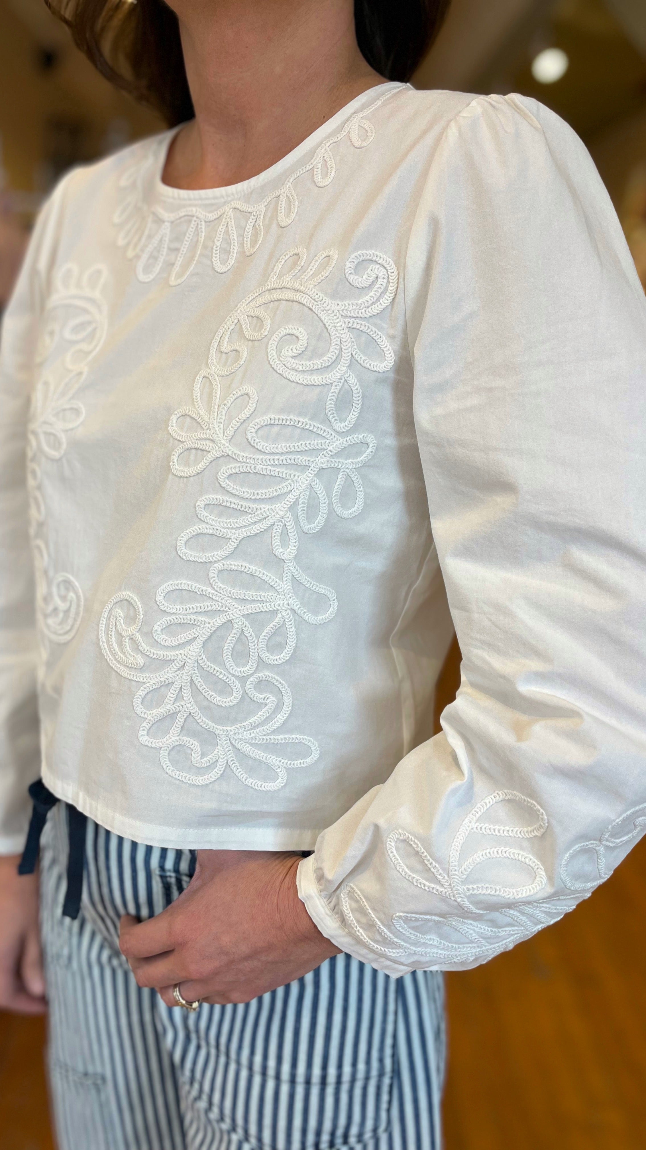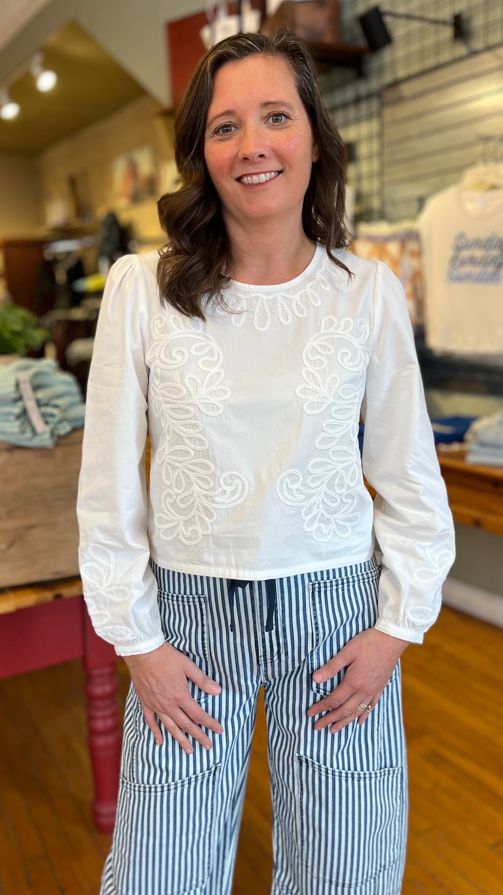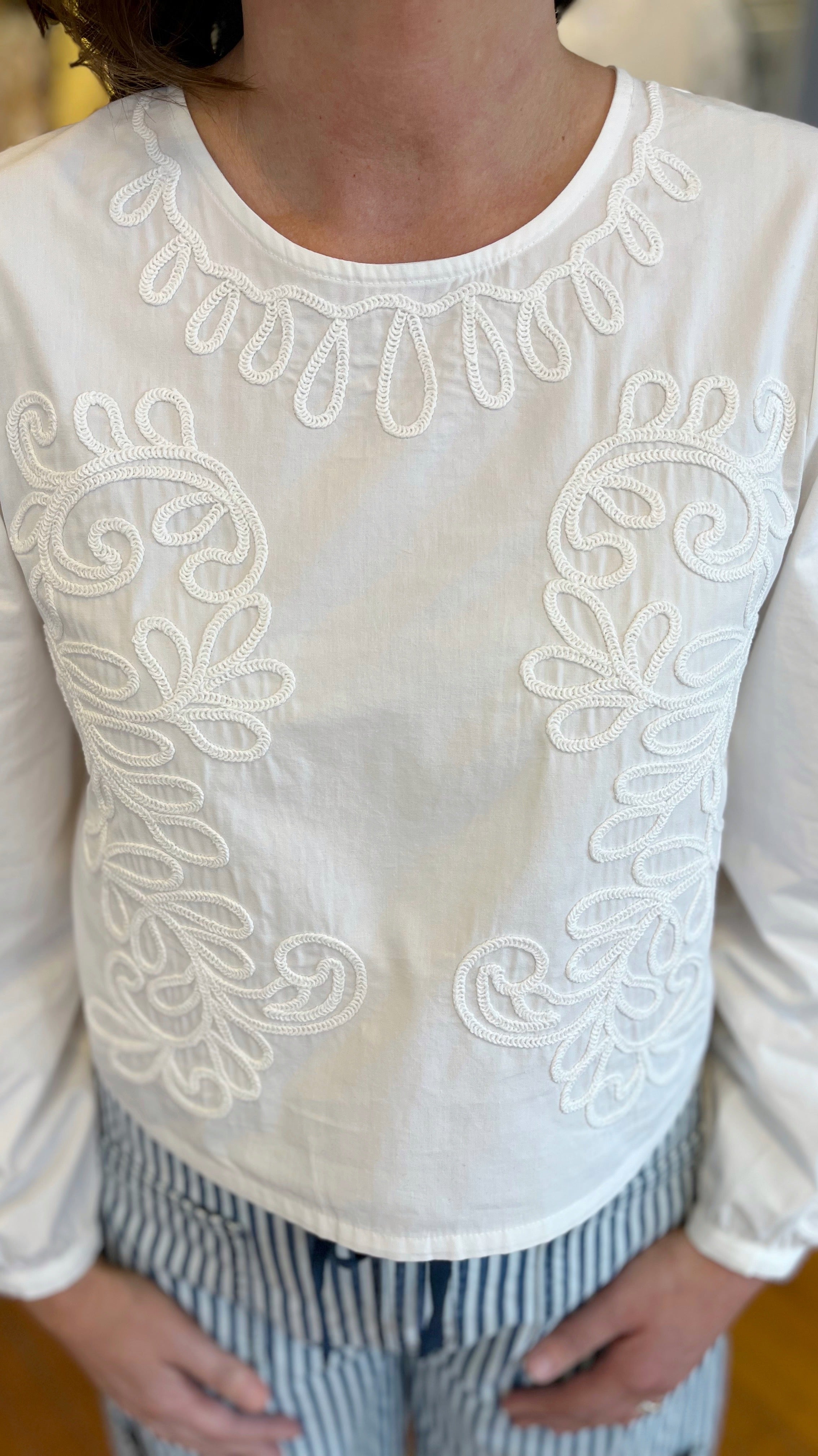Getting dressed is easy with this effortless long sleeve top. Lightweight 100% cotton fabric will keep you comfortable while the embroidery detail will elevate your look instantly. We like to pair it with everything from denim to linen pants.